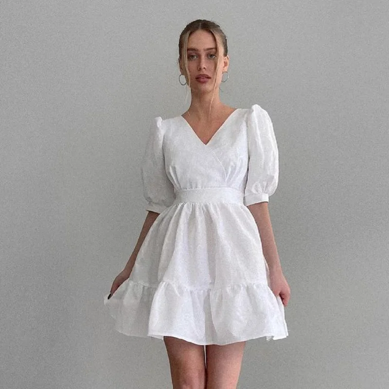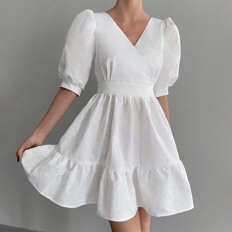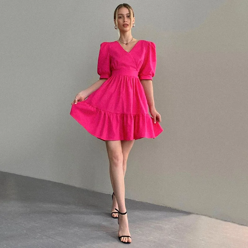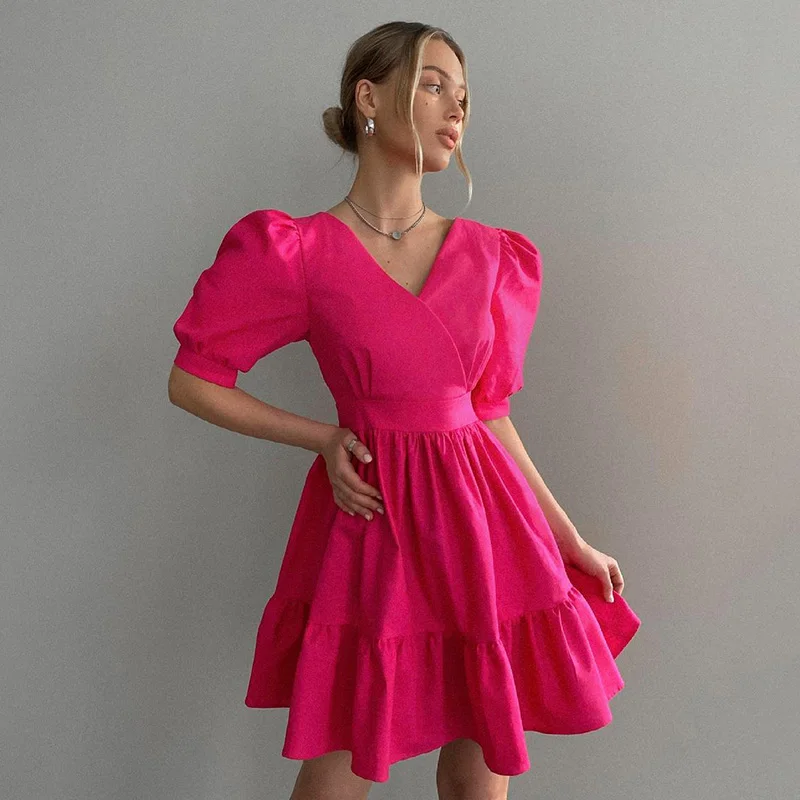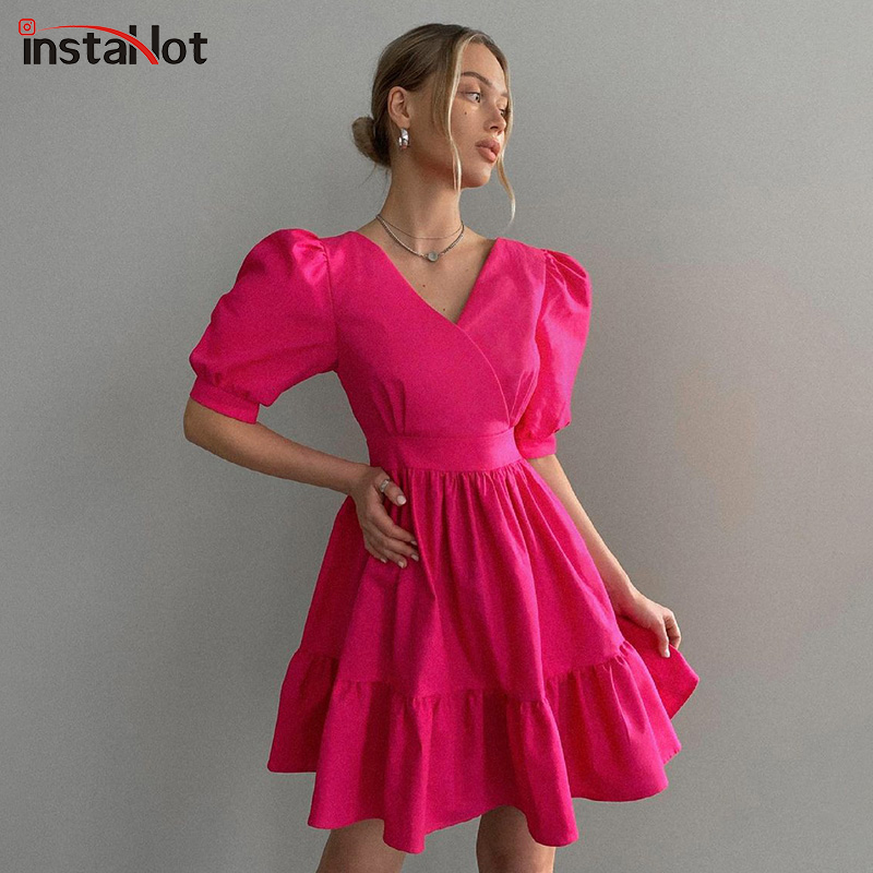 InstaHot Women Puff Sleeve Pleated Dress Sweet Vintage Casual Red Party Dress 2021 Summer V Neck Elegant A Line Female Dresses