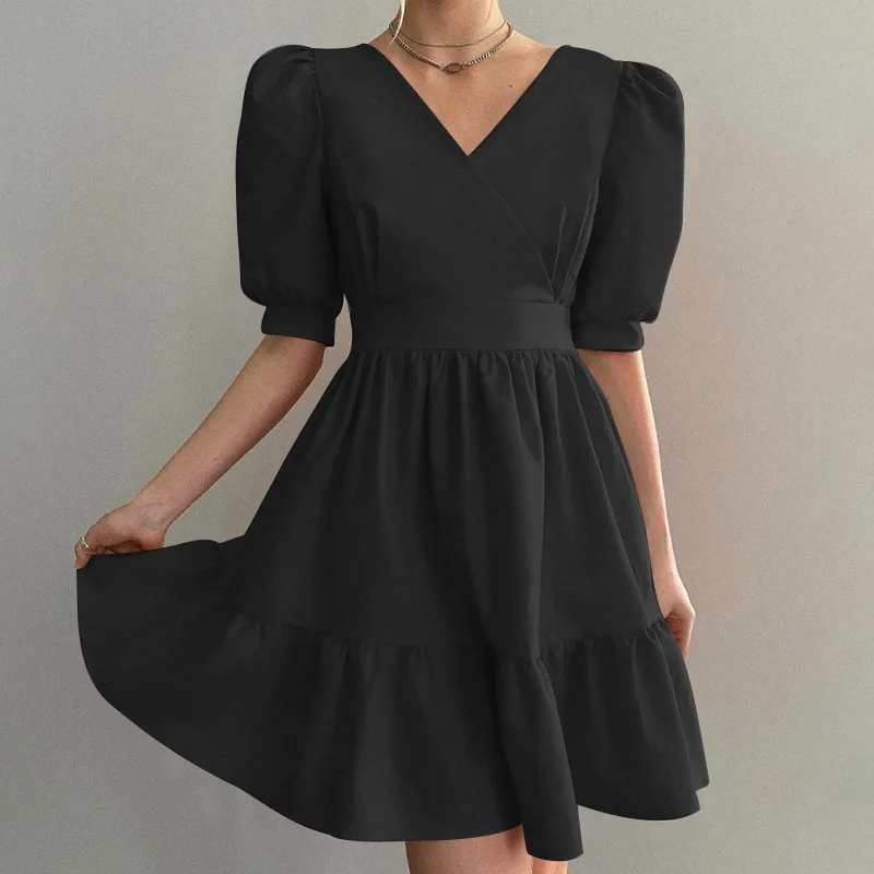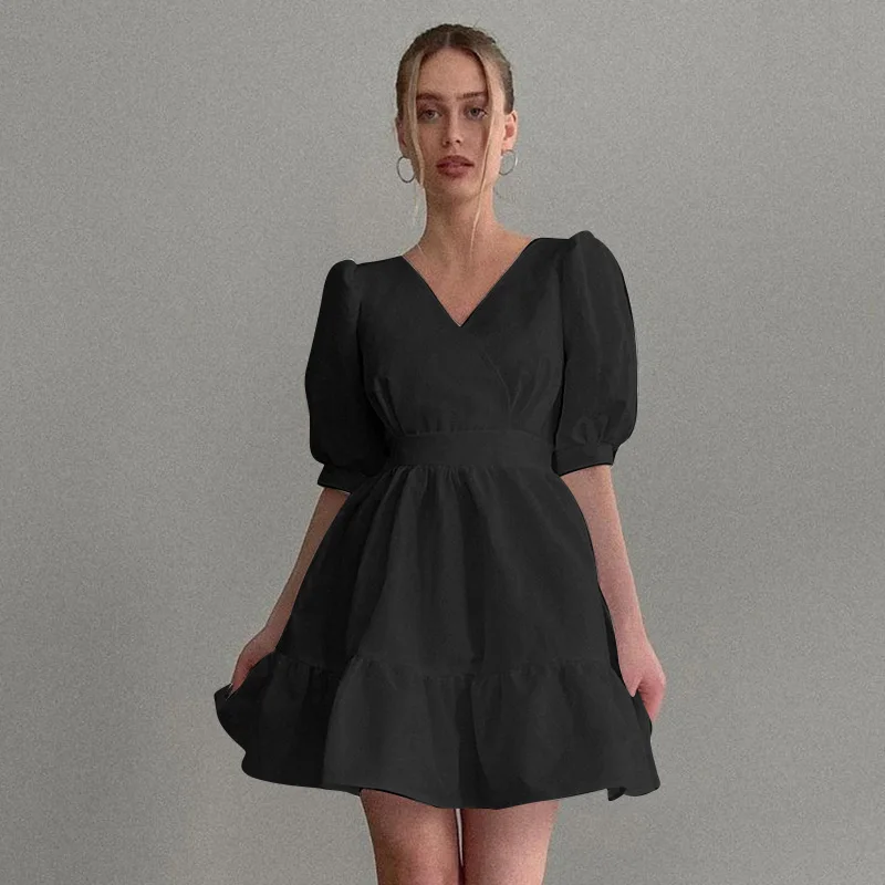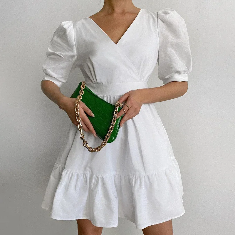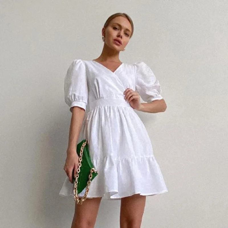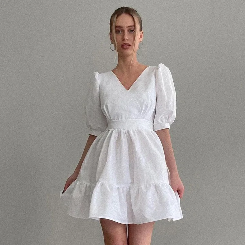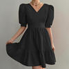 InstaHot Women Puff Sleeve Pleated Dress Sweet Vintage Casual Red Party Dress 2021 Summer V Neck Elegant A Line Female Dresses
