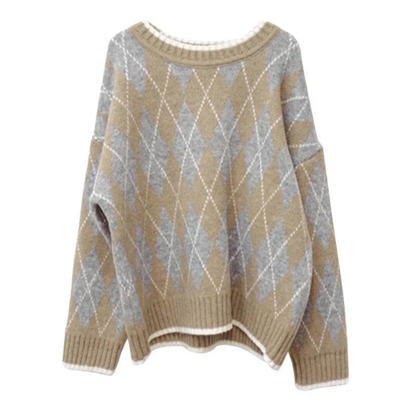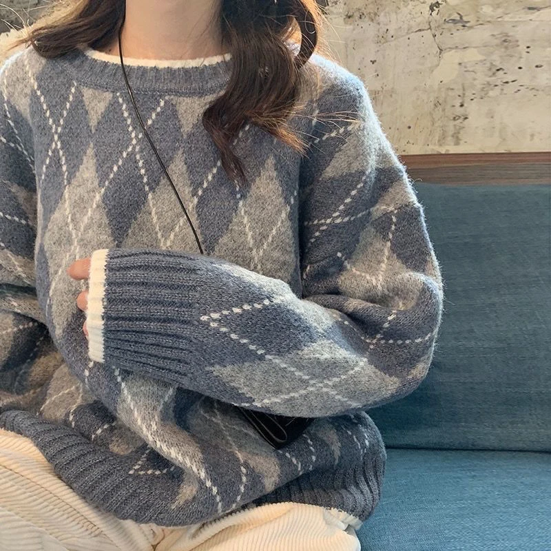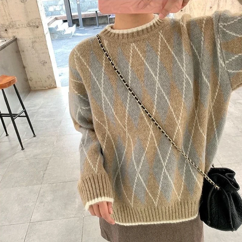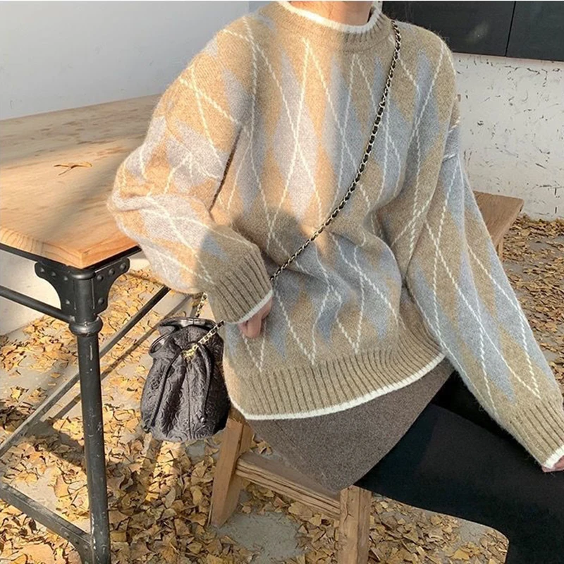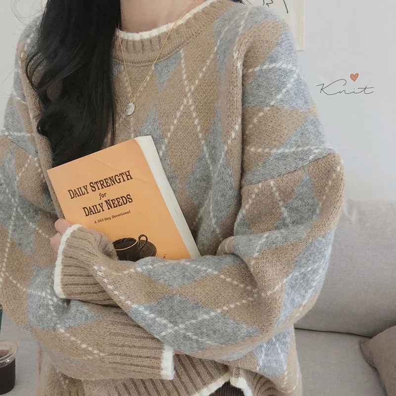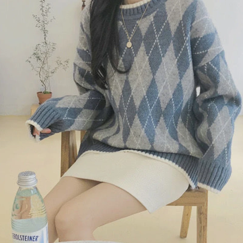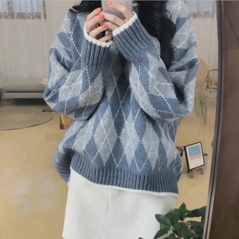 JMPRS Argyle Women Sweater Fashion Pullover Knitted Casual O Neck Jumper Thick Winter Soft Student Cute Sweater Tops New