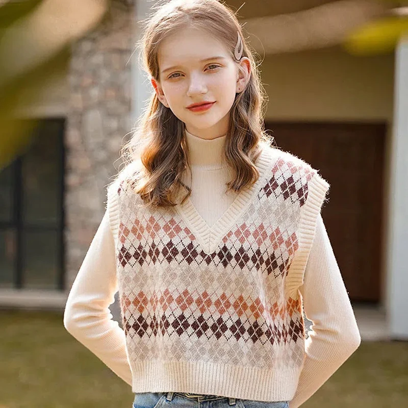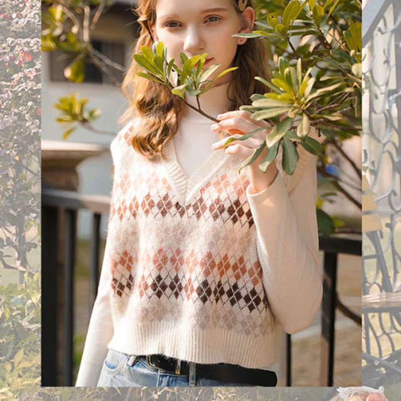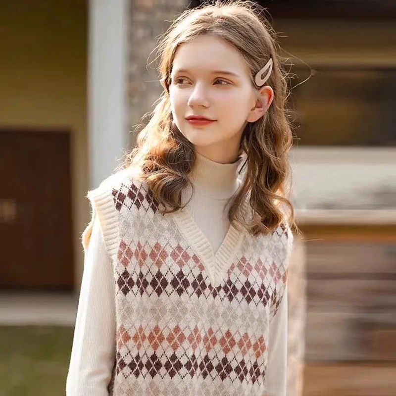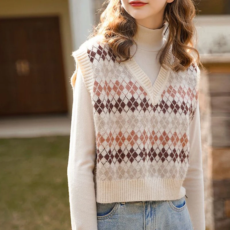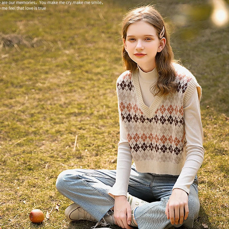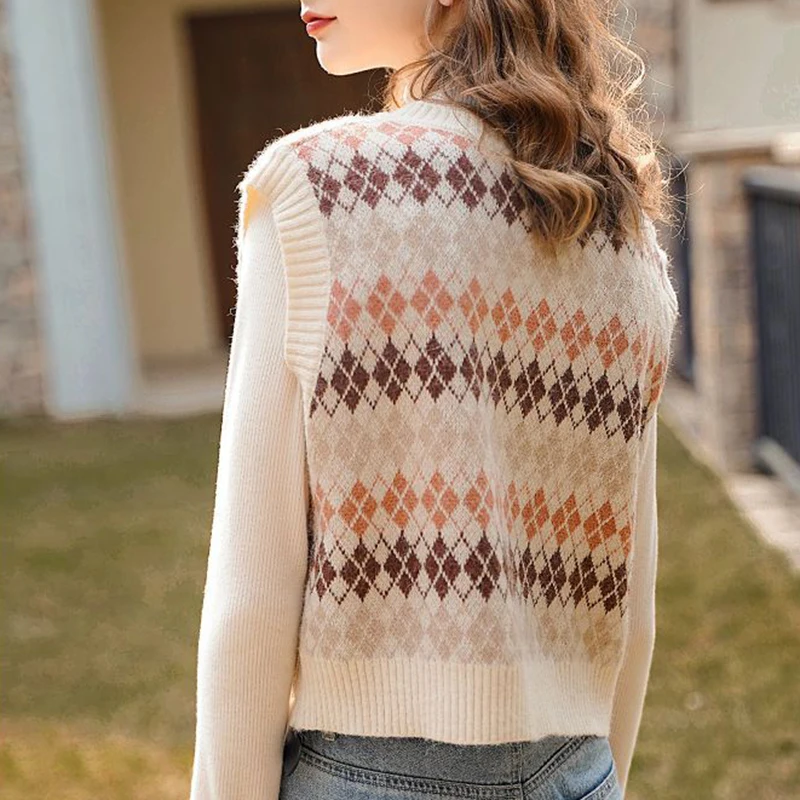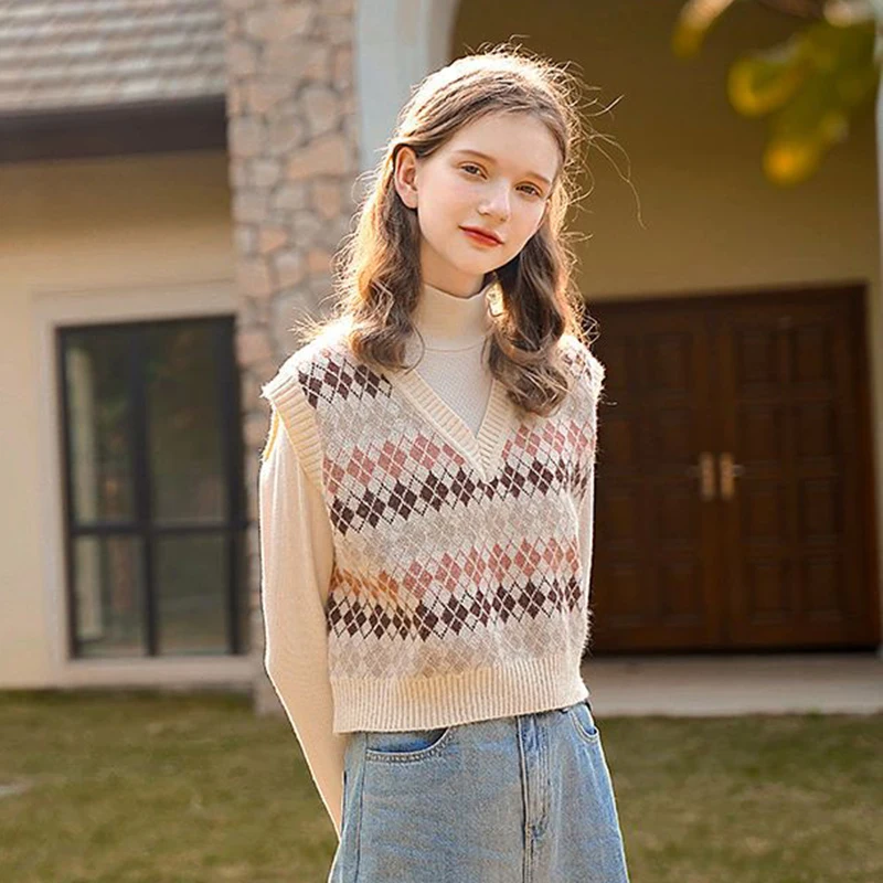 JMPRS Argyle Women Vest Sweater V Neck Fashion Knitted Plaid Jumper Pullover Fall Preppy Style Student Casual Sleeveless Tops