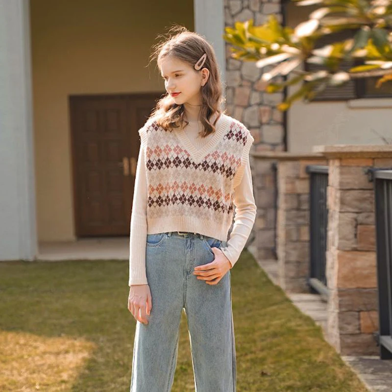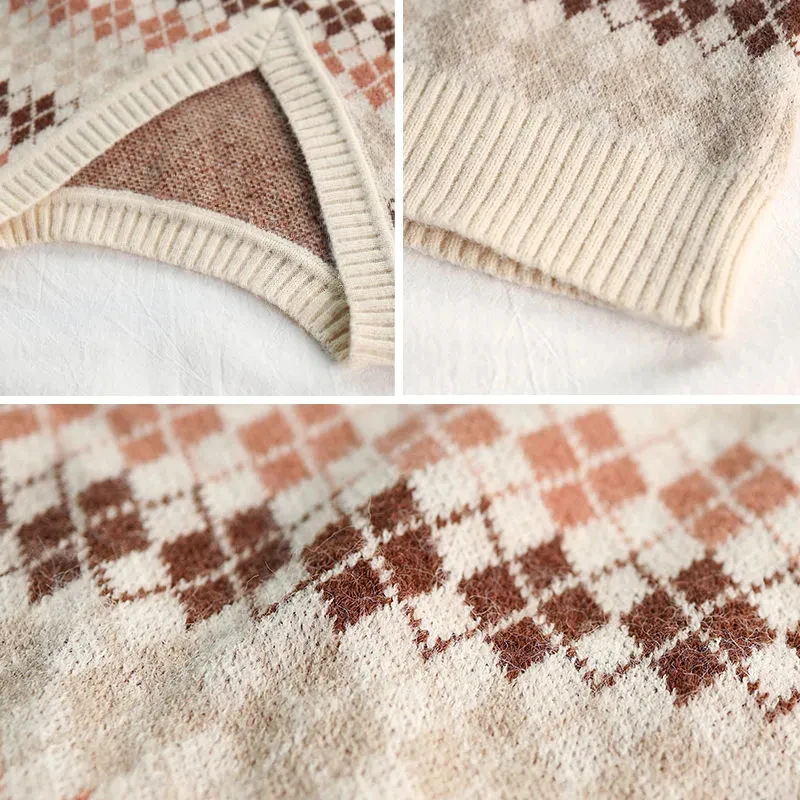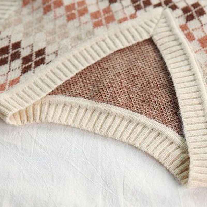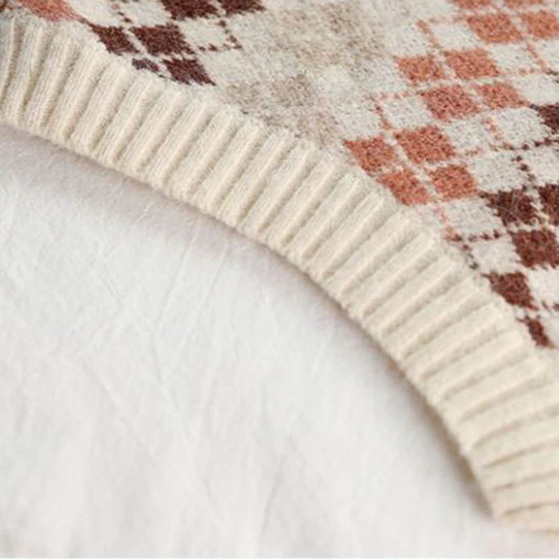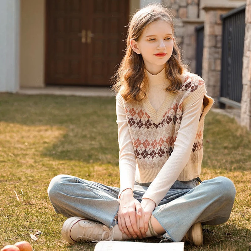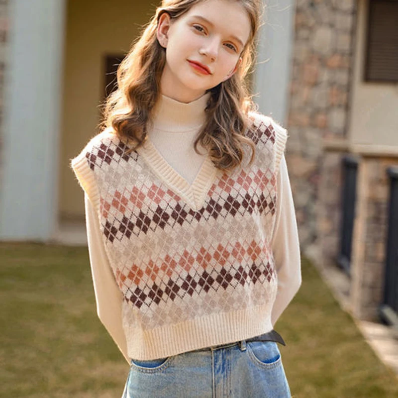 JMPRS Argyle Women Vest Sweater V Neck Fashion Knitted Plaid Jumper Pullover Fall Preppy Style Student Casual Sleeveless Tops