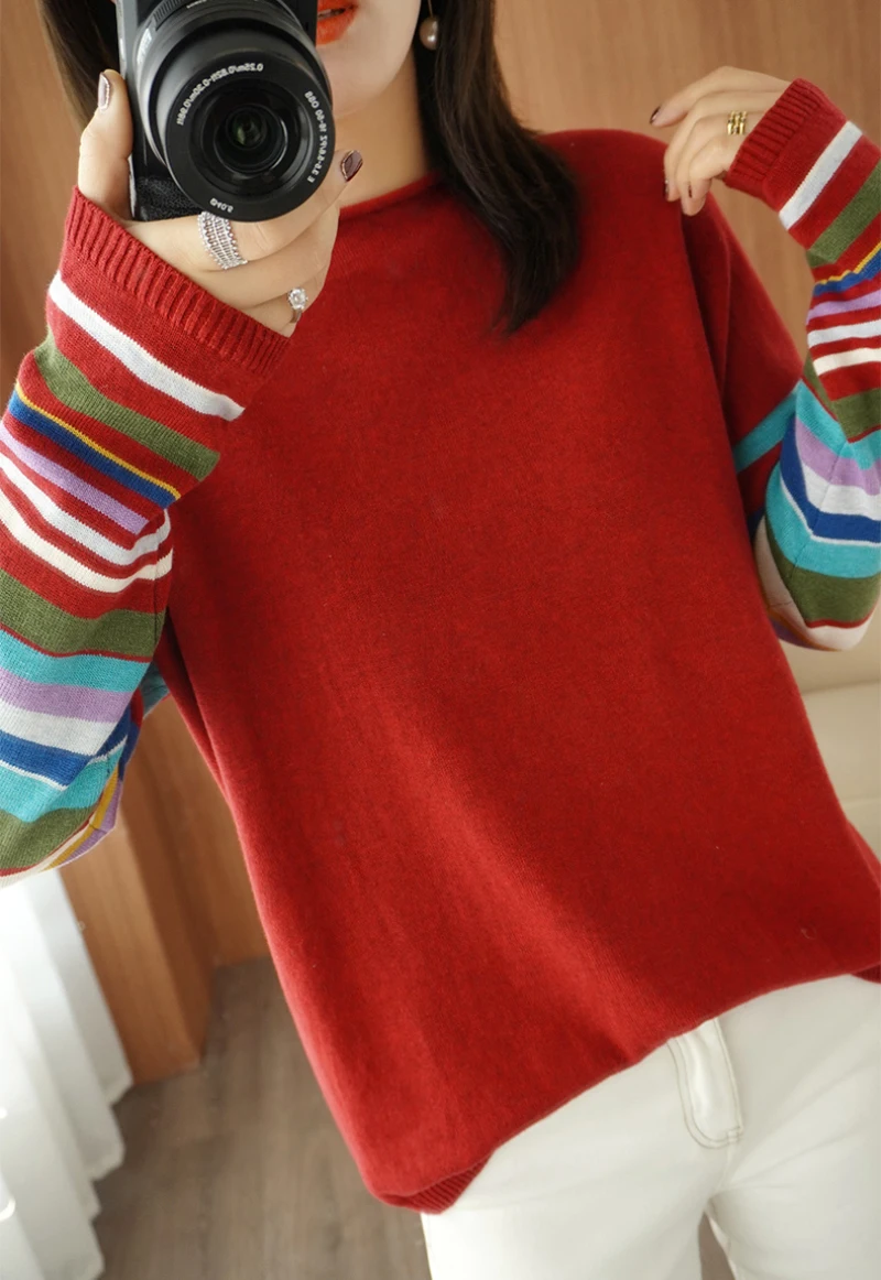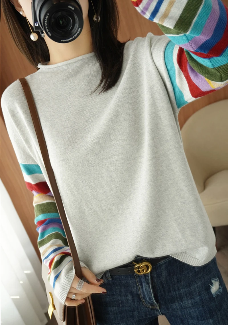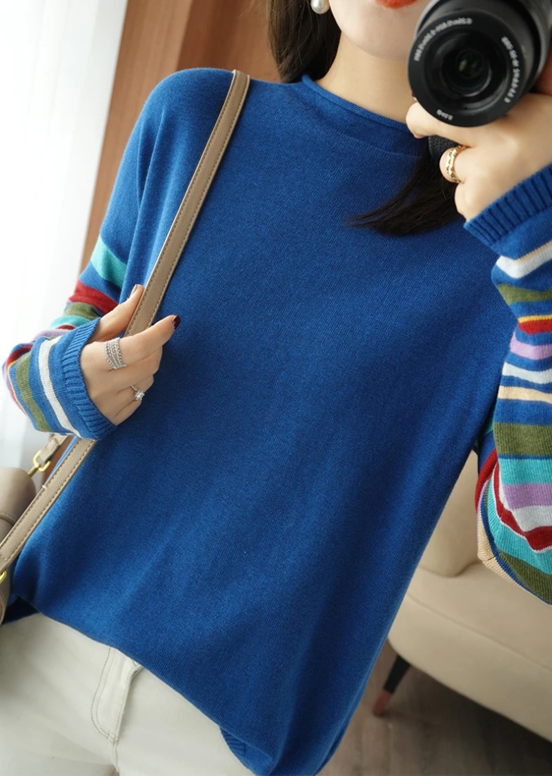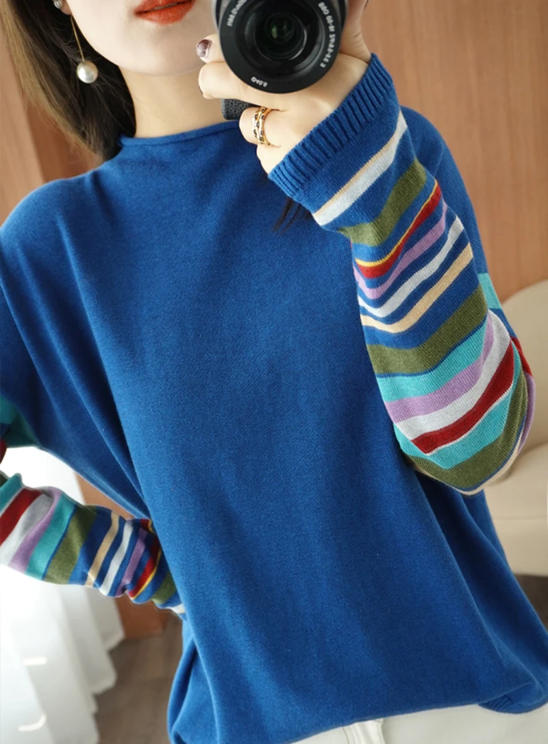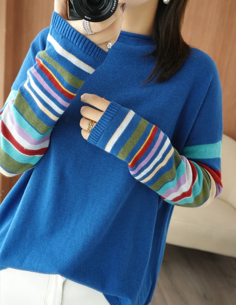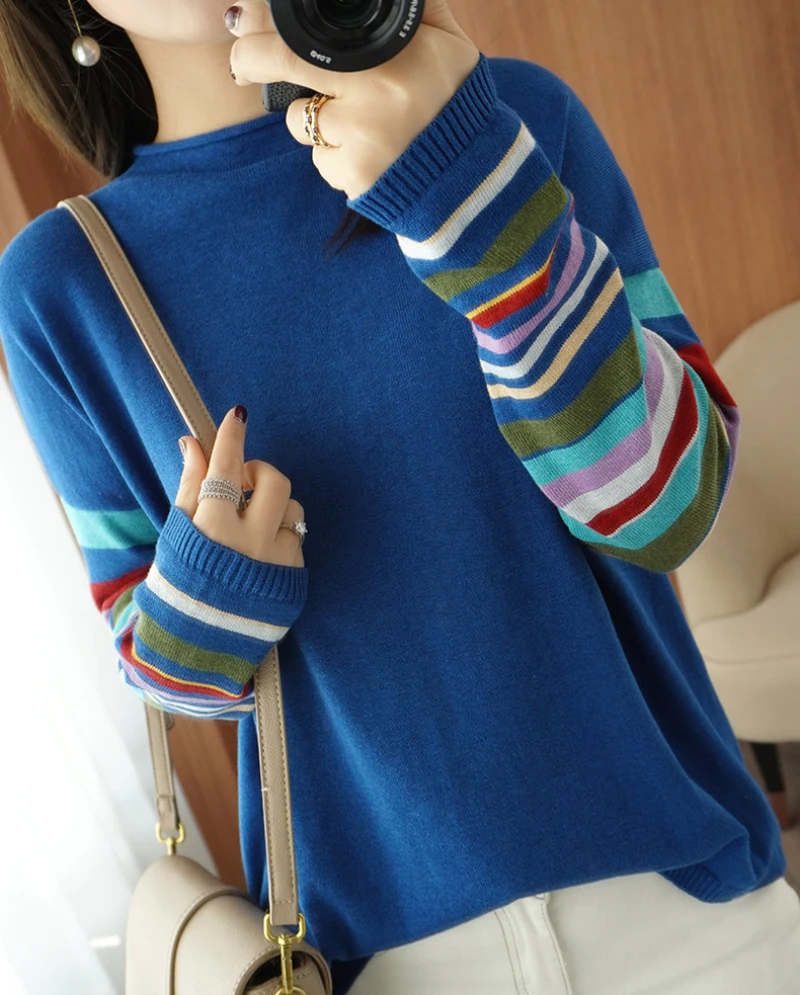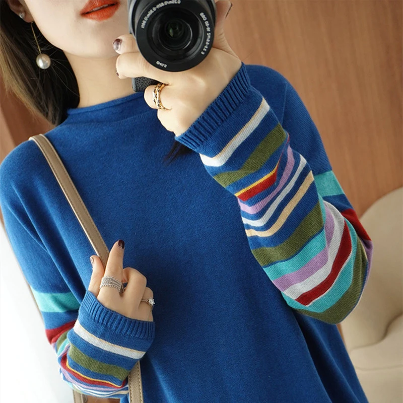 JMPRS Casual O Neck Women Sweater Fall Pullover Fashion Rainbow Striped Long Sleeve Jumper Slim Soft Loose Female Knitted Tops