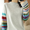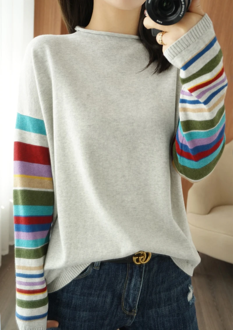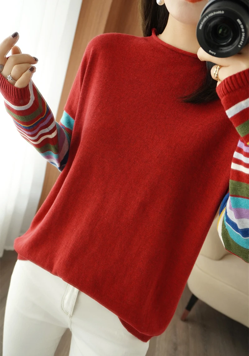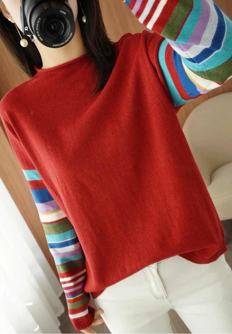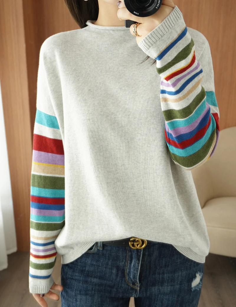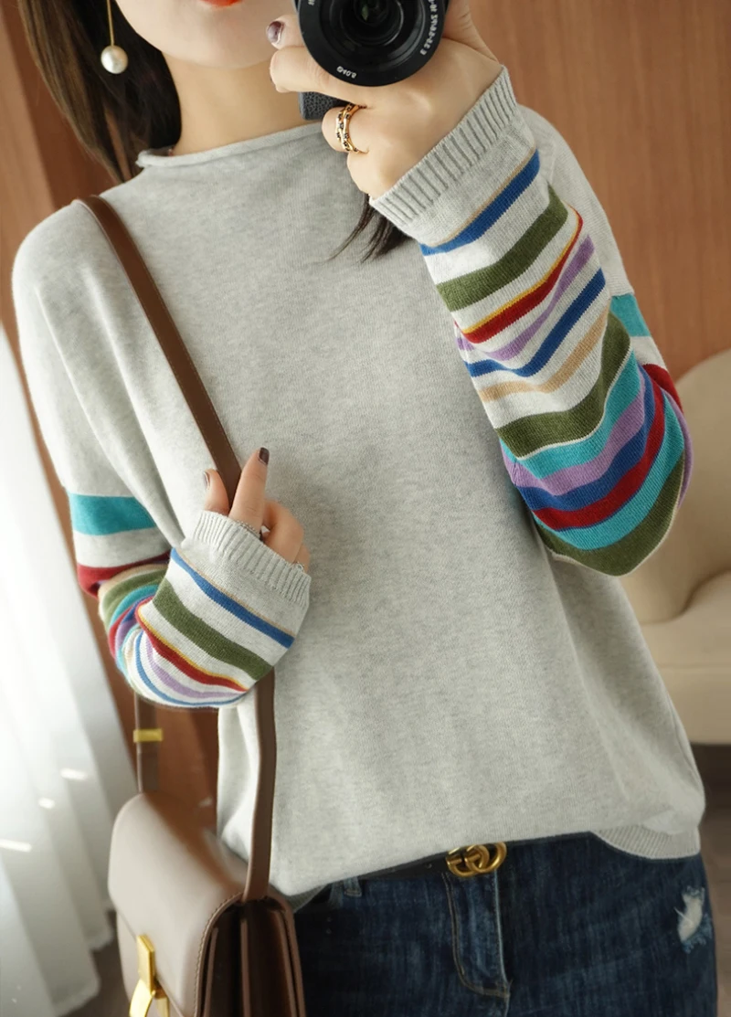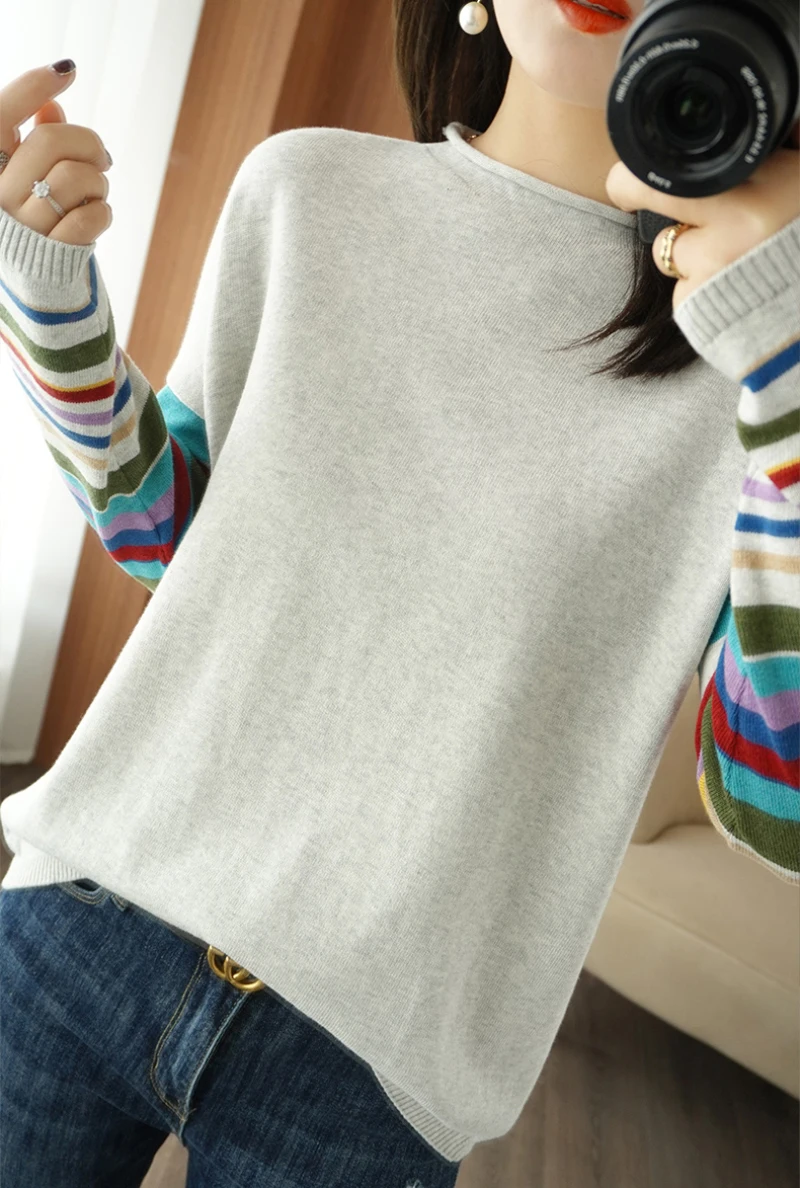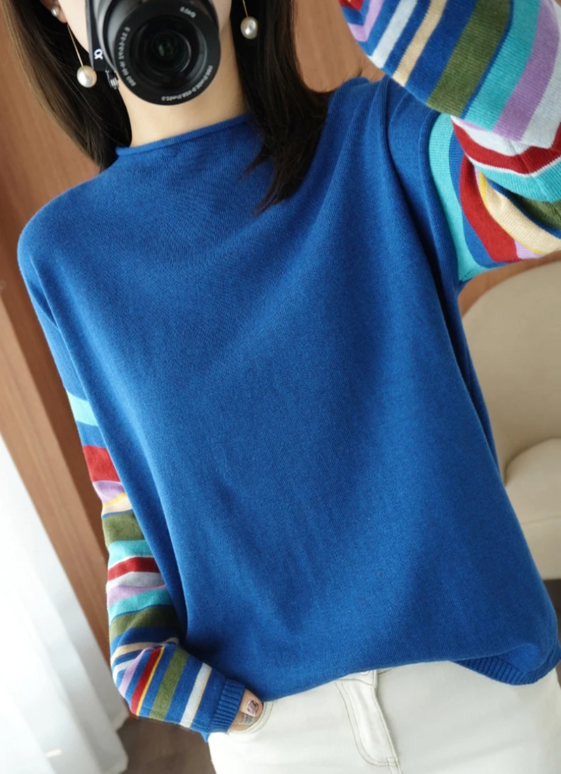 JMPRS Casual O Neck Women Sweater Fall Pullover Fashion Rainbow Striped Long Sleeve Jumper Slim Soft Loose Female Knitted Tops