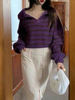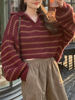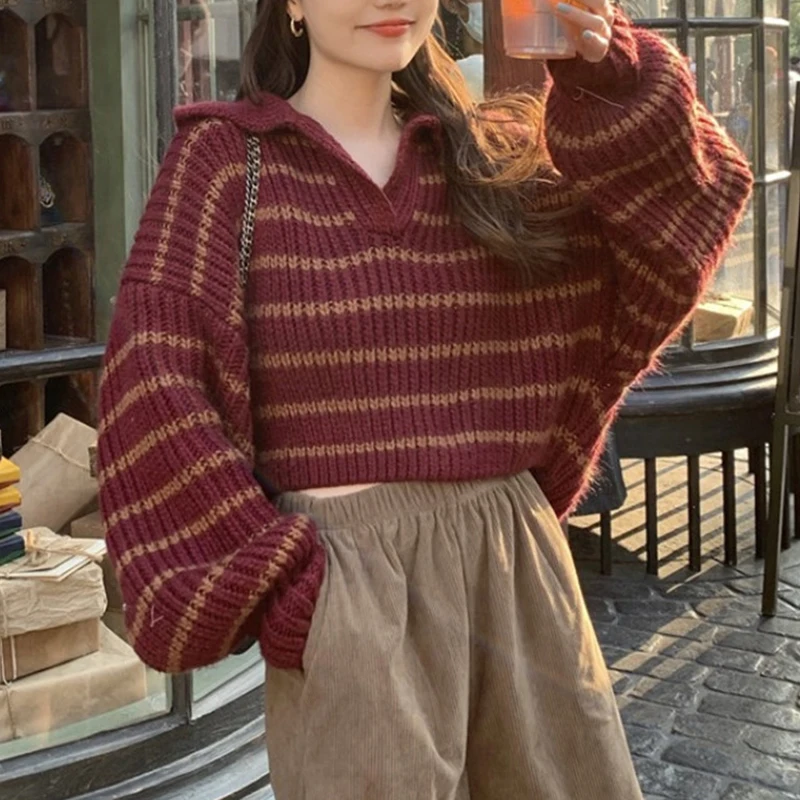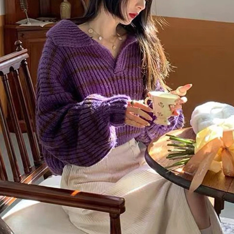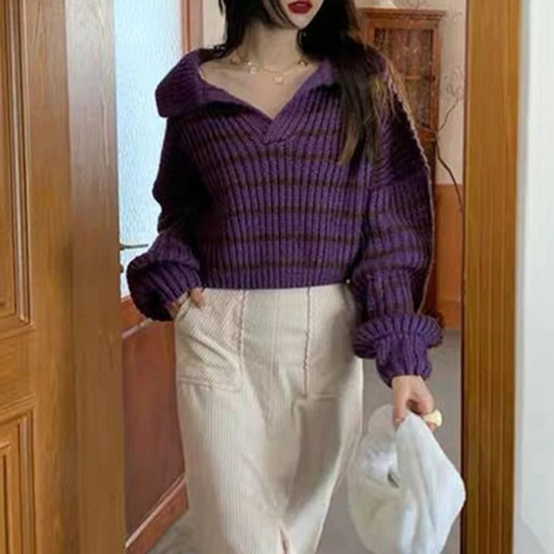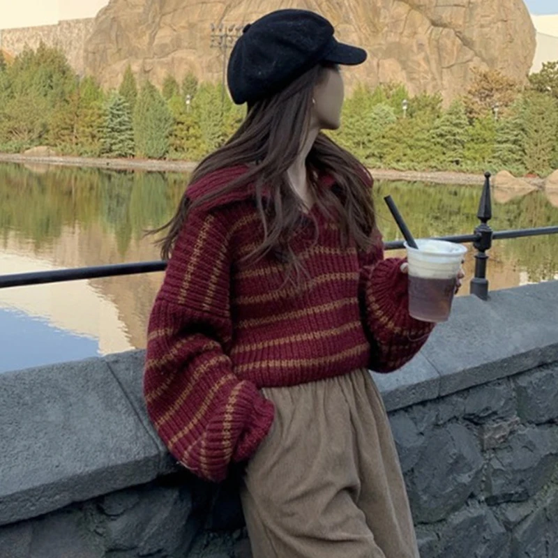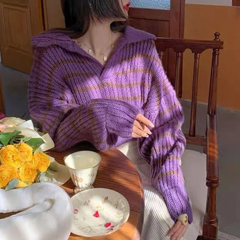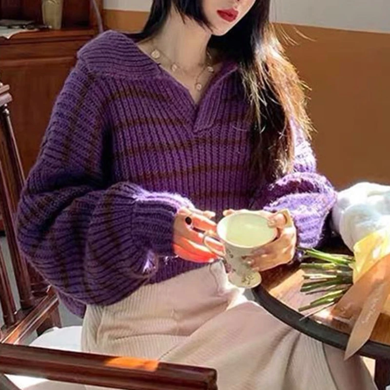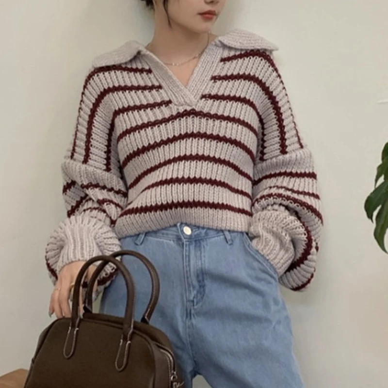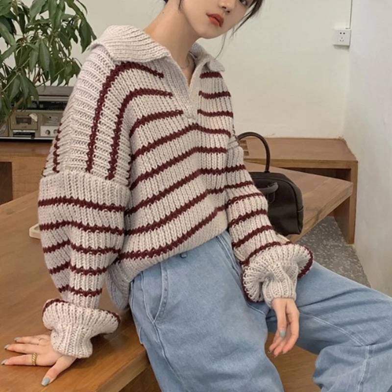 JMPRS Fashion Striped Women Sweater Preppy Style Pullover Winter Thick Knitted Jumper Casual Turn Down Collar Designed Tops New