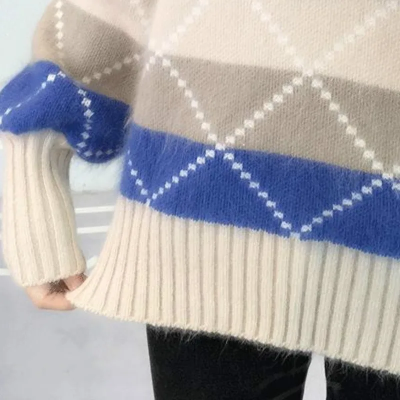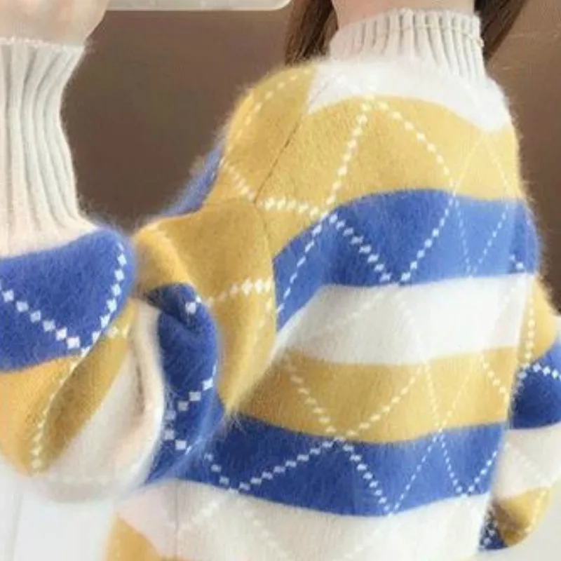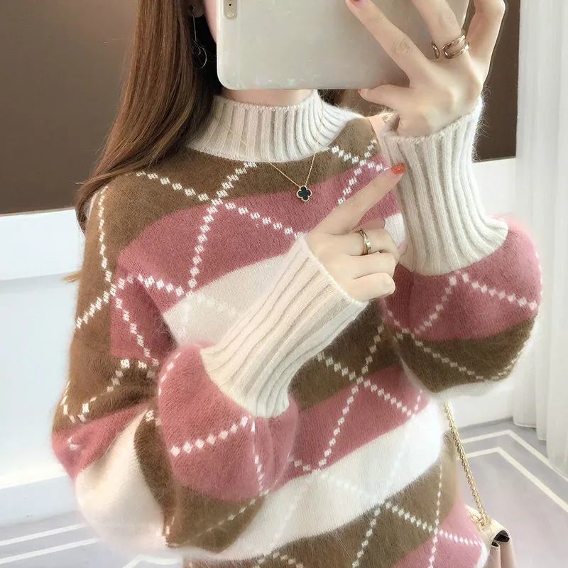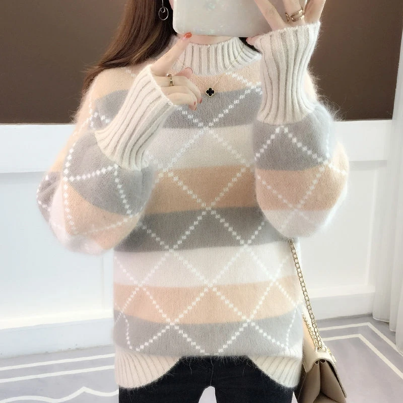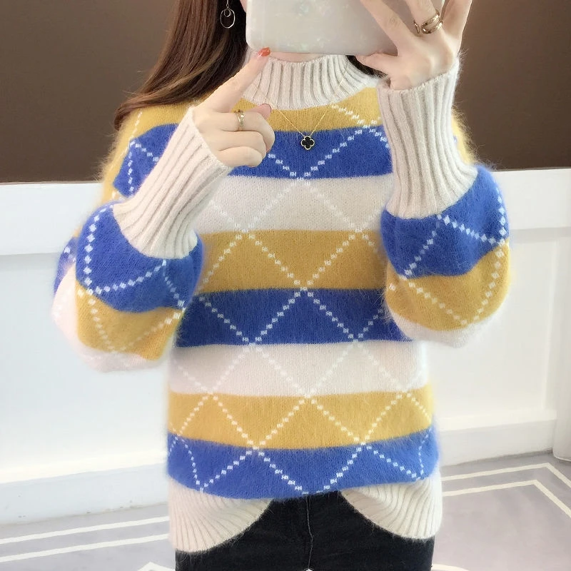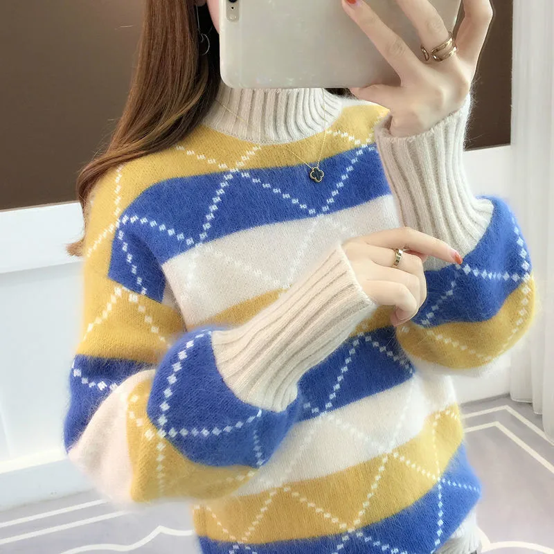 JMPRS Korean Autumn Winter News Loose Color Matching Knitted Sweater Turtleneck Striped Pullover Sweaters Loveley Clothes