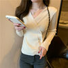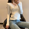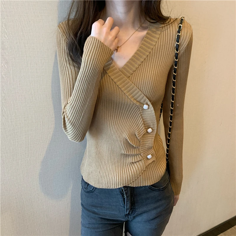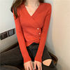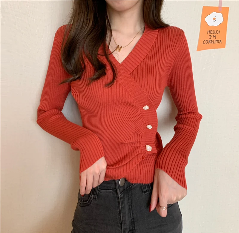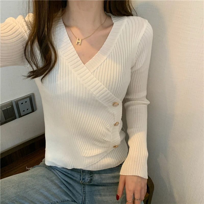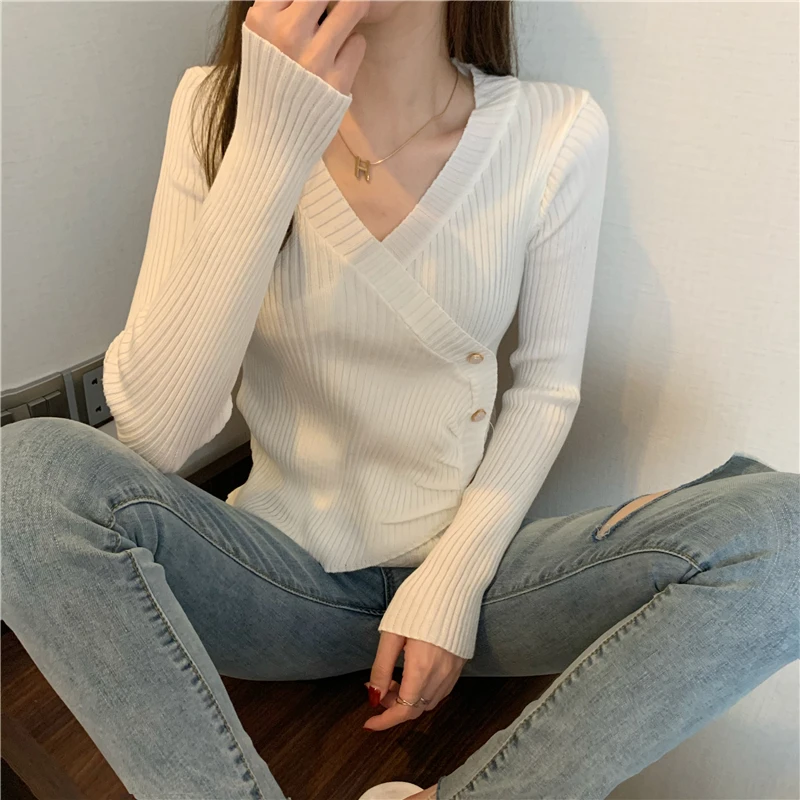 JMPRS Pullover Irregular Buckle Knitted Women Sweater Sexy V Neck Autumn Long Sleeve Elegant Stylish Chic Fashion Female Tops