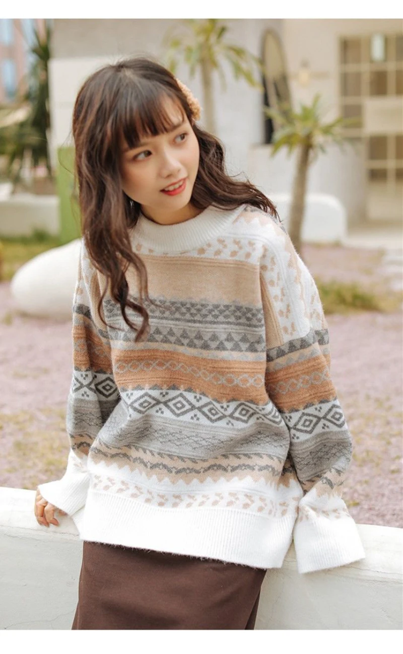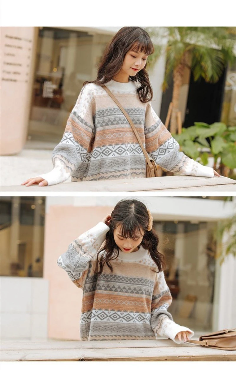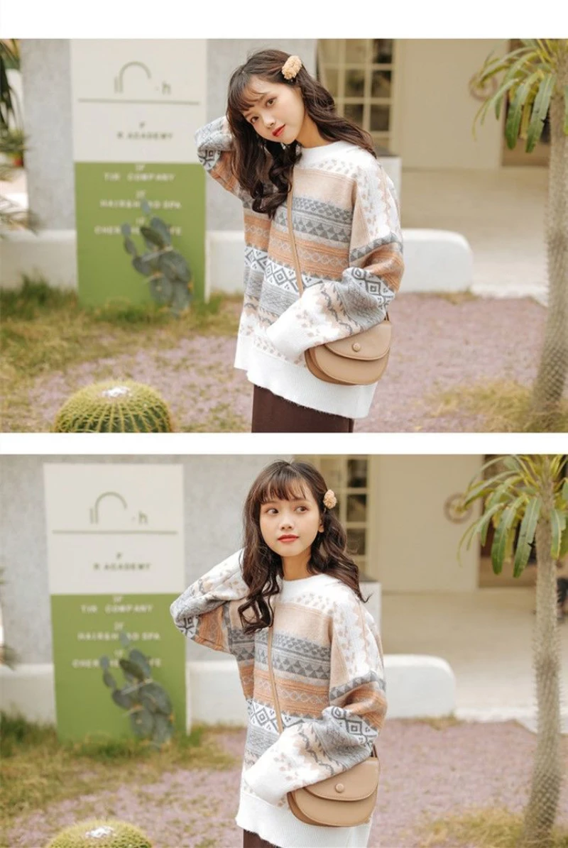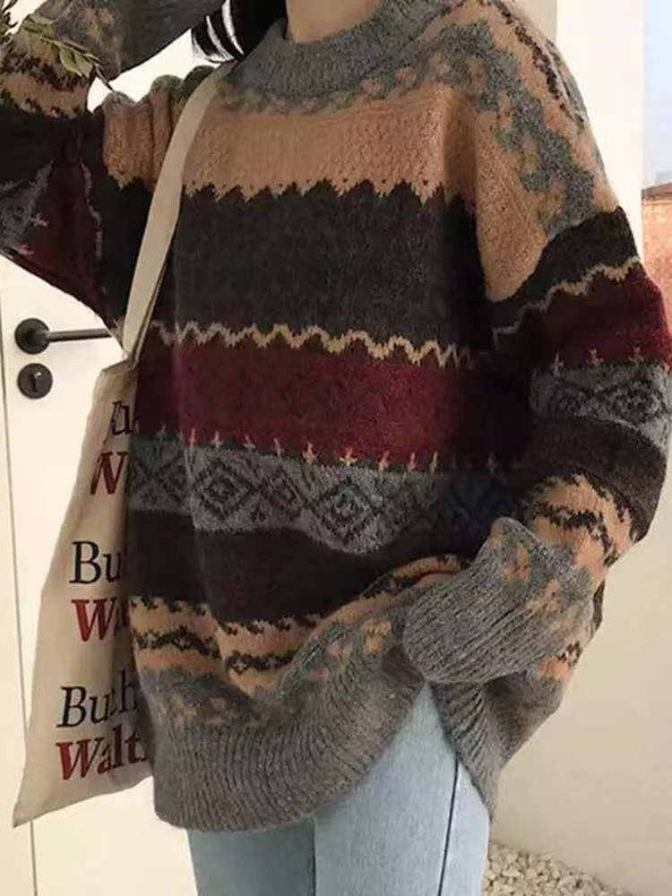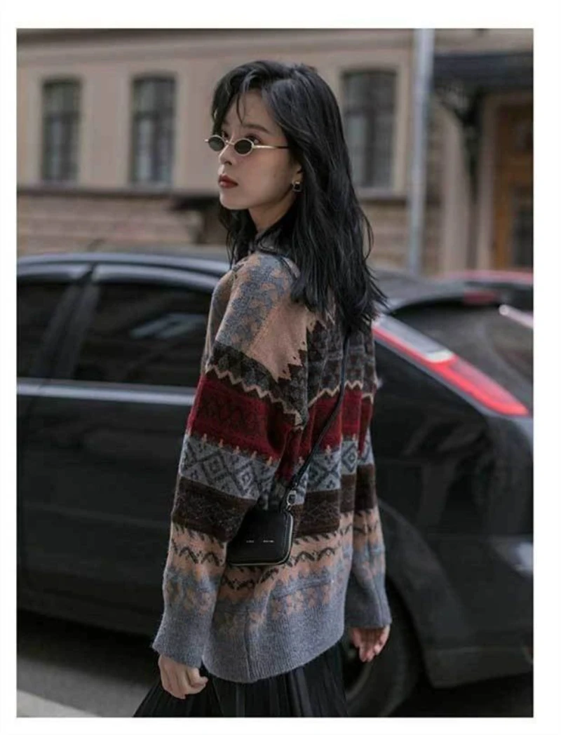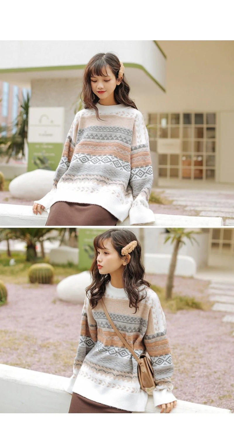 JMPRS Pullover Women Sweater Vintage Loose Casual Geometric Retro Lazy Female Harajuku Korean Style Knit Jumper Ulzzang Chic Top