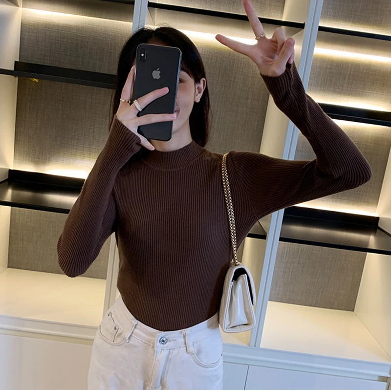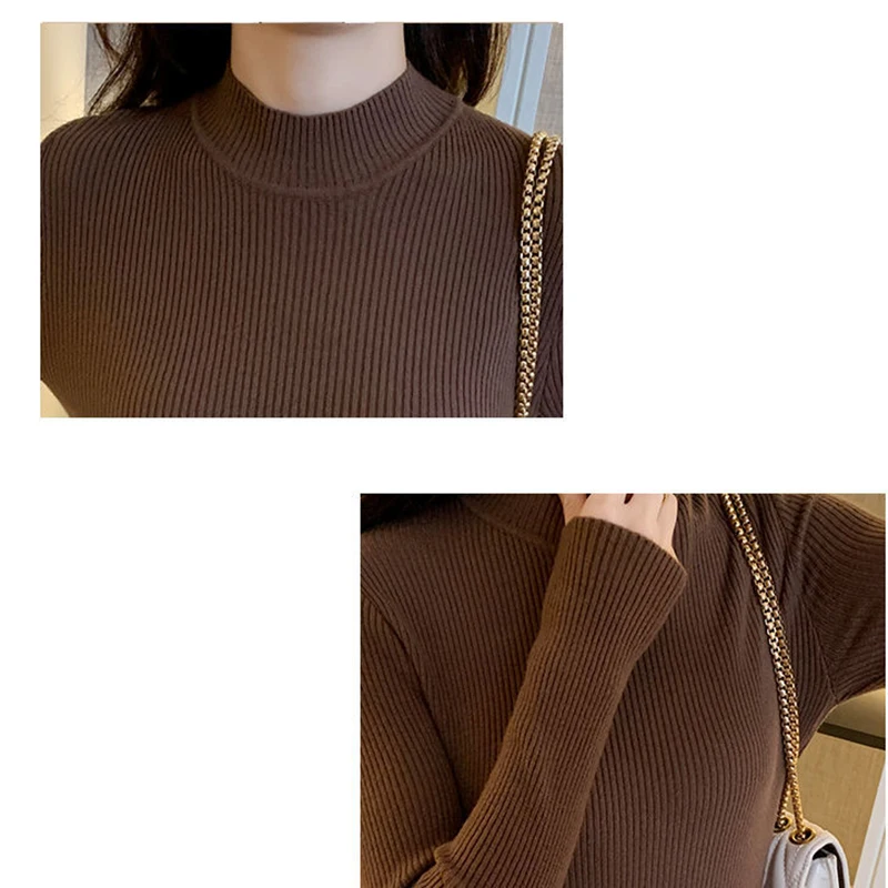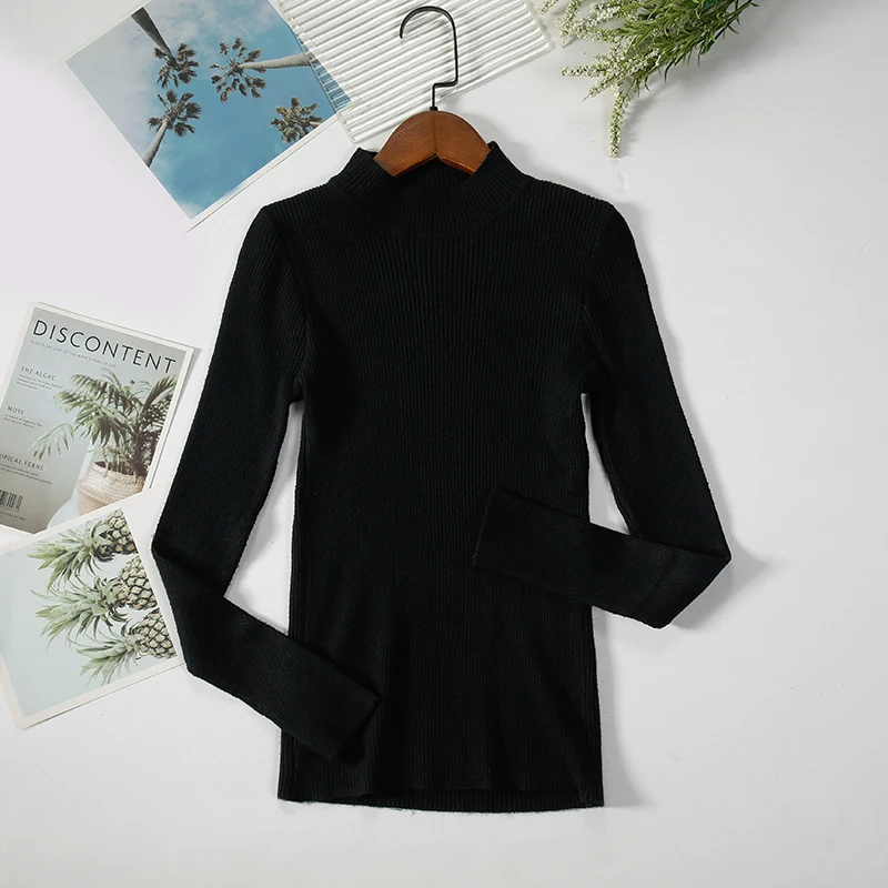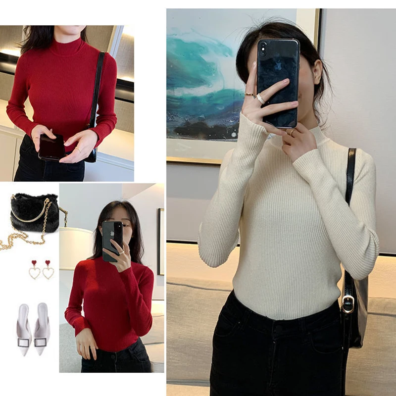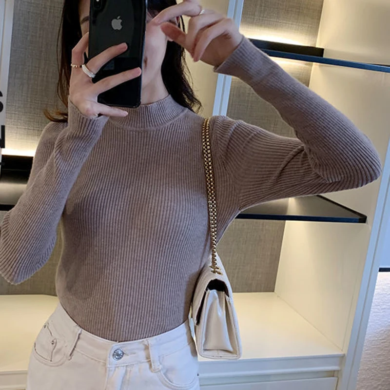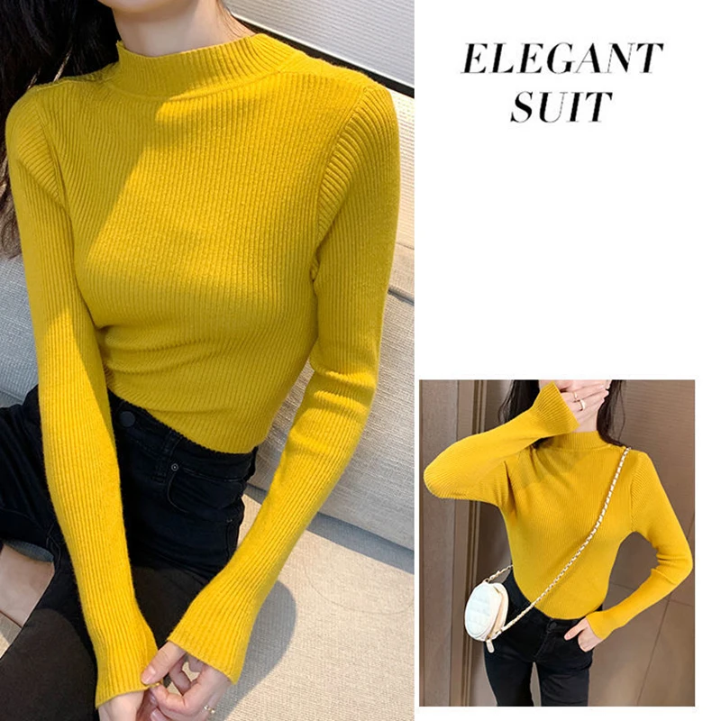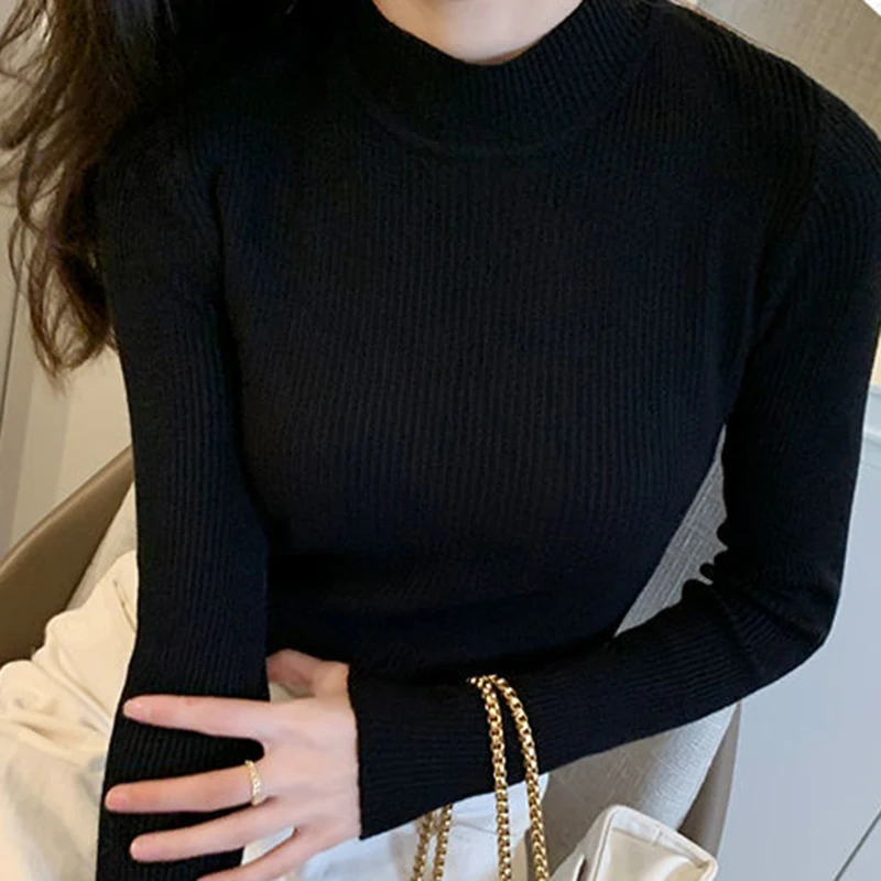 JMPRS Simple Women Sweater Winter Stand Collar Fashion Pullover Elastic Knit Ladies Jumper Casual Solid Black Female Basic Tops