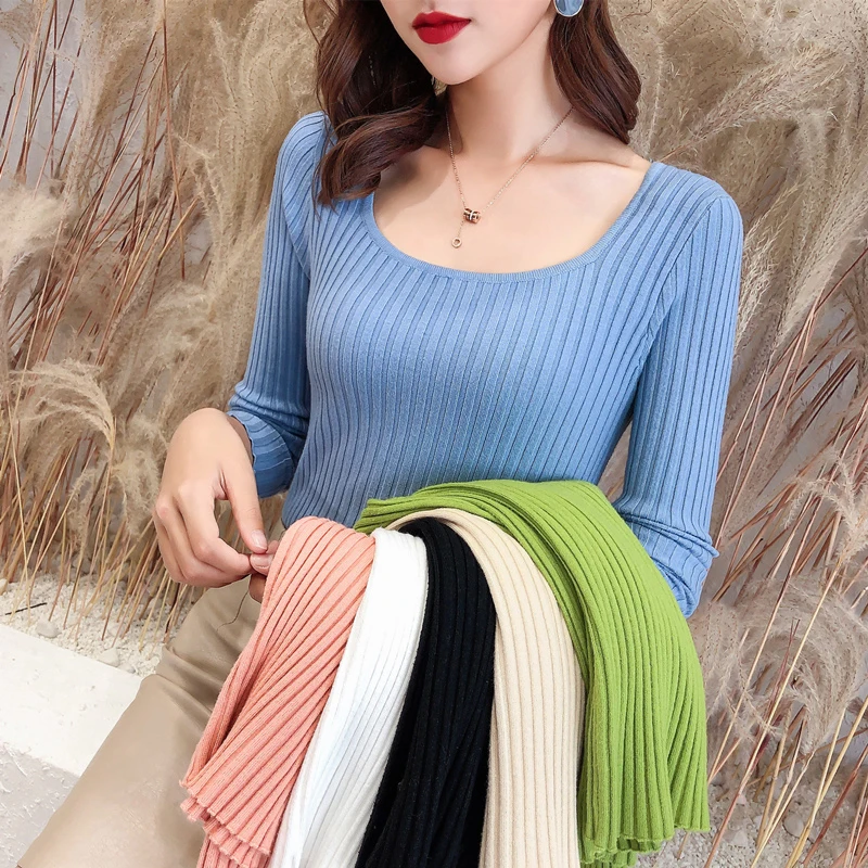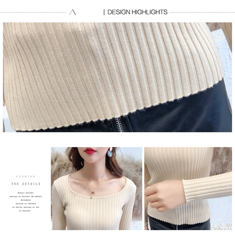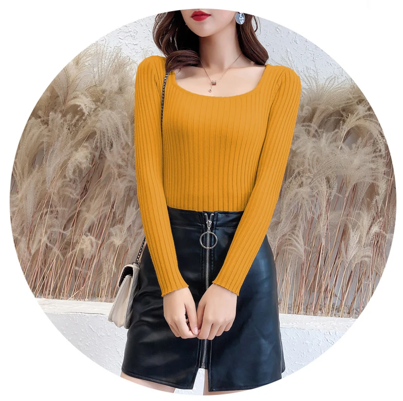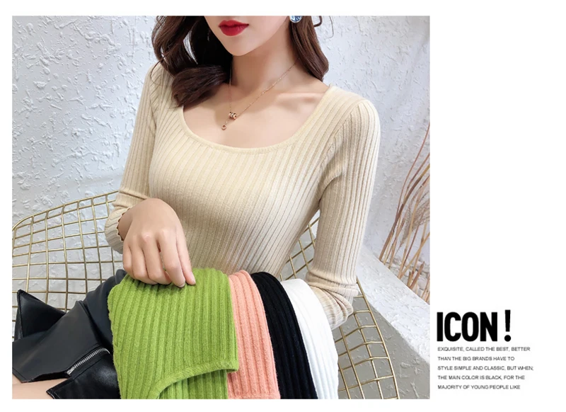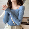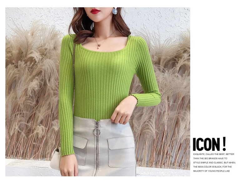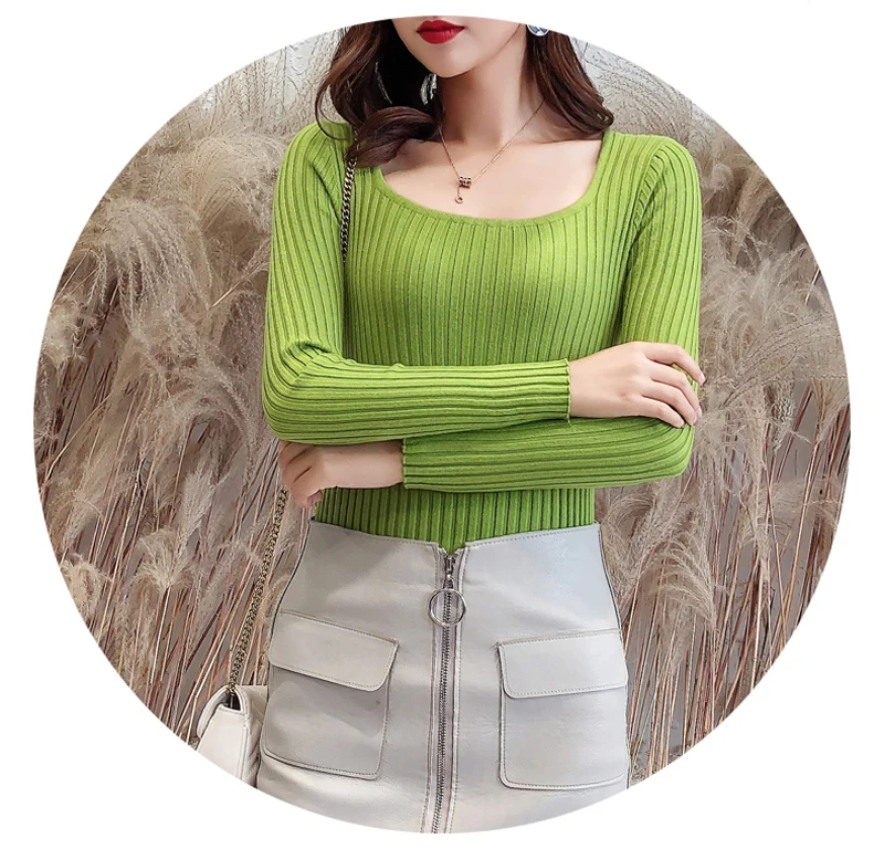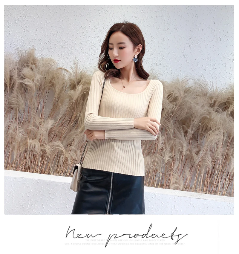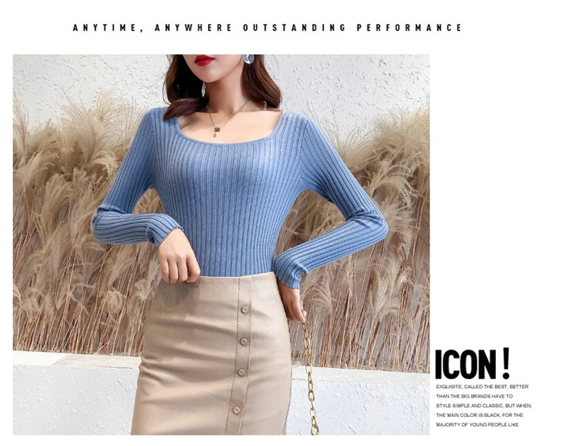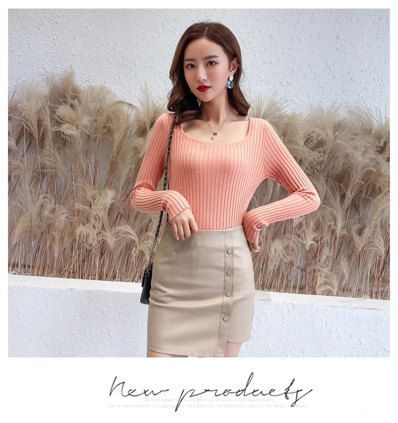 JMPRS Soft Women Pullover Sweater Autumn Long Sleeve Square Collar Knitted Korean Slim Elastic Jumper Casual Winter Basic Top