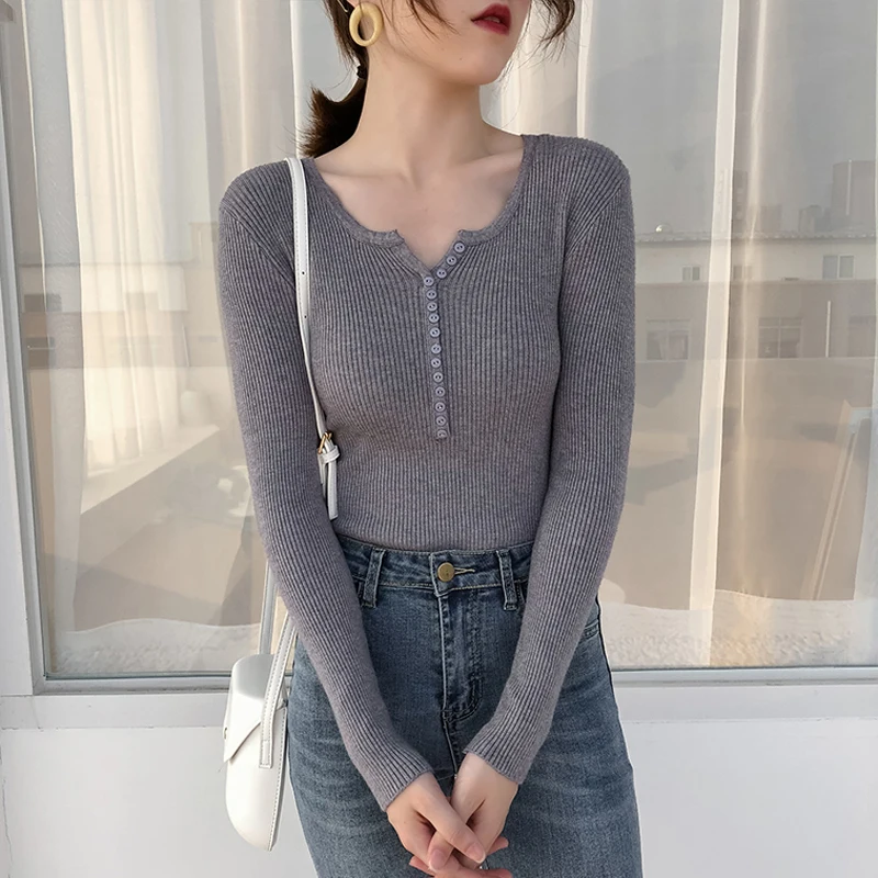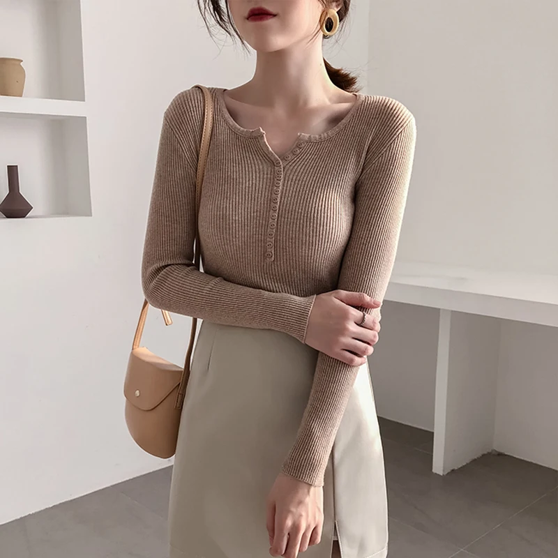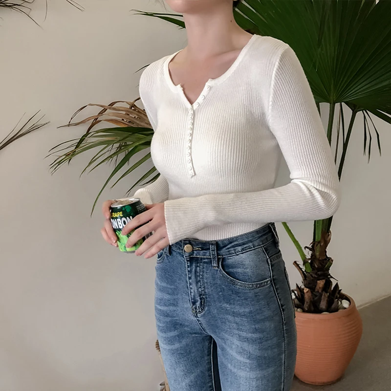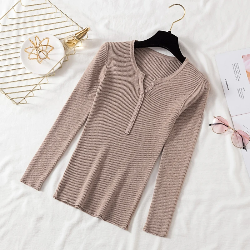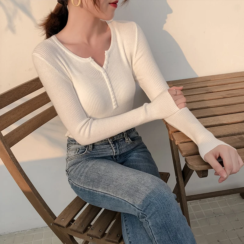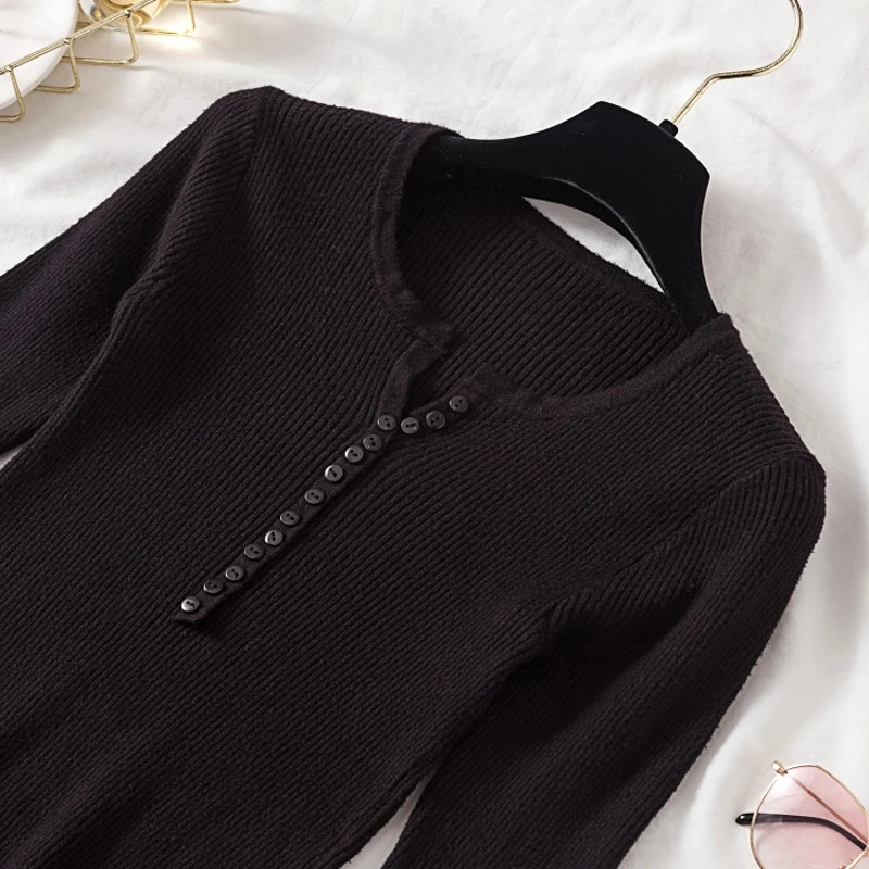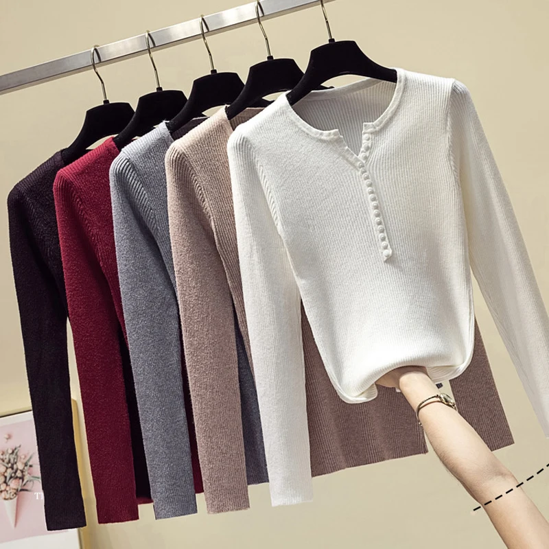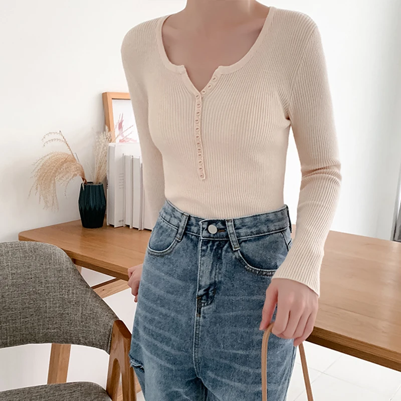JMPRS V Neck Pullover Sweater Women Basic Autumn Slim Knitted Jumper Long Sleeve Button Soft Elastic Female Top New