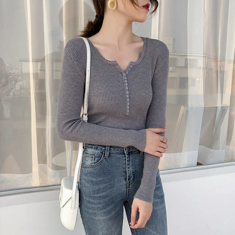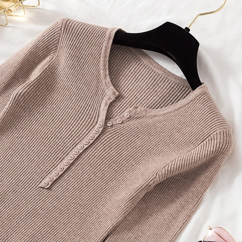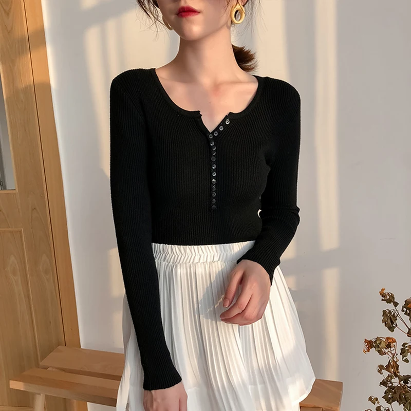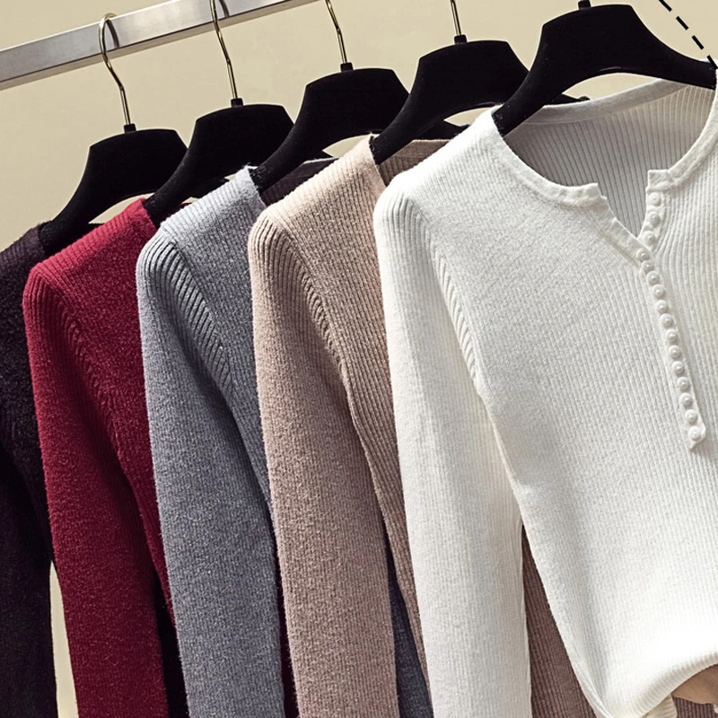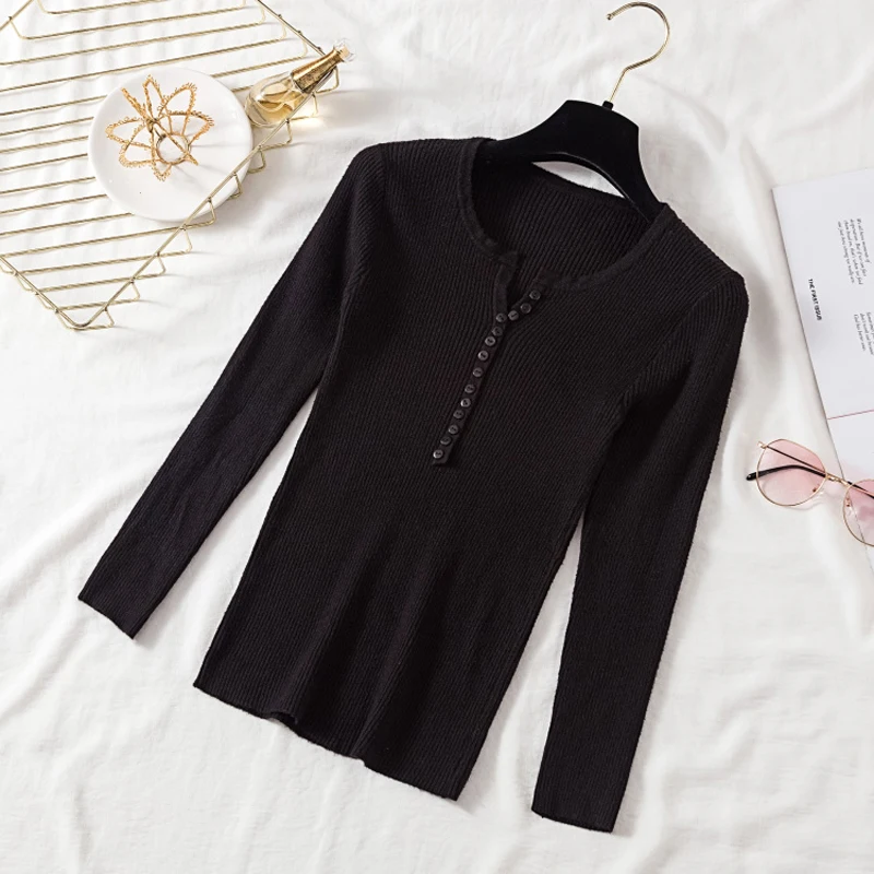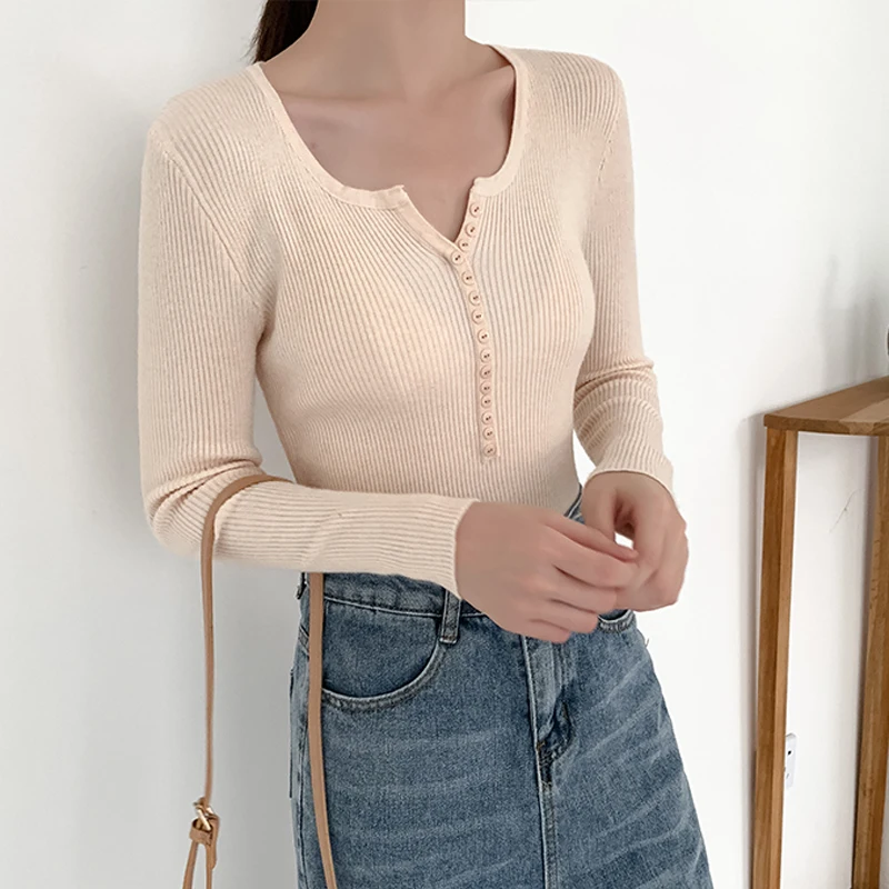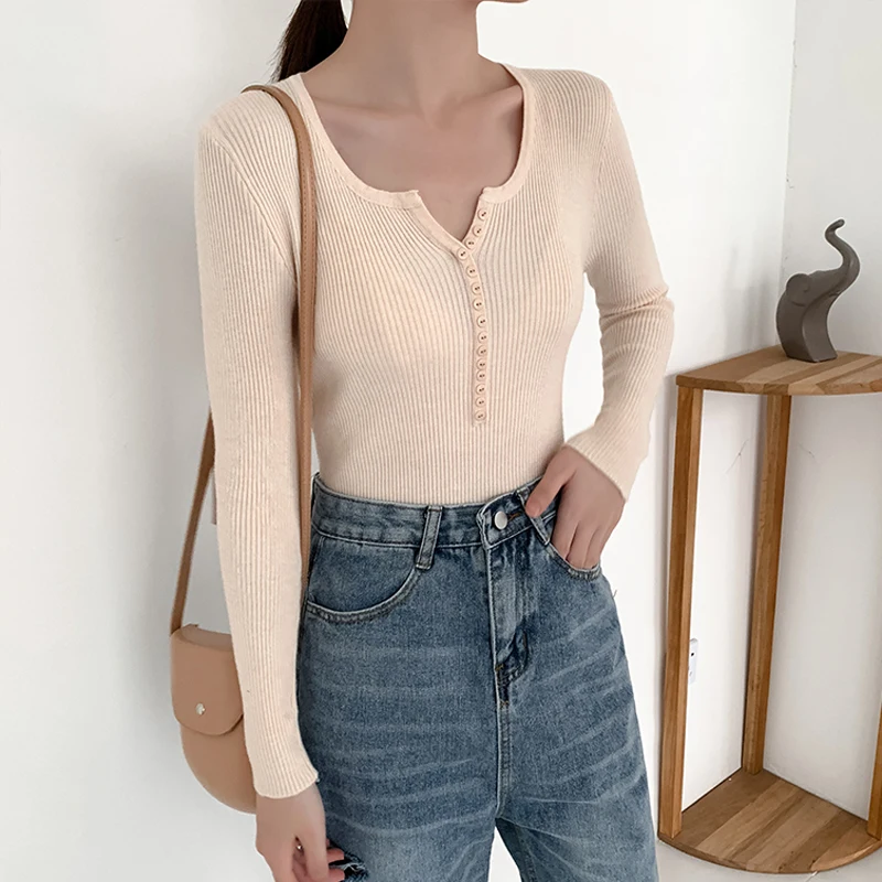 JMPRS V Neck Pullover Sweater Women Basic Autumn Slim Knitted Jumper Long Sleeve Button Soft Elastic Female Top New