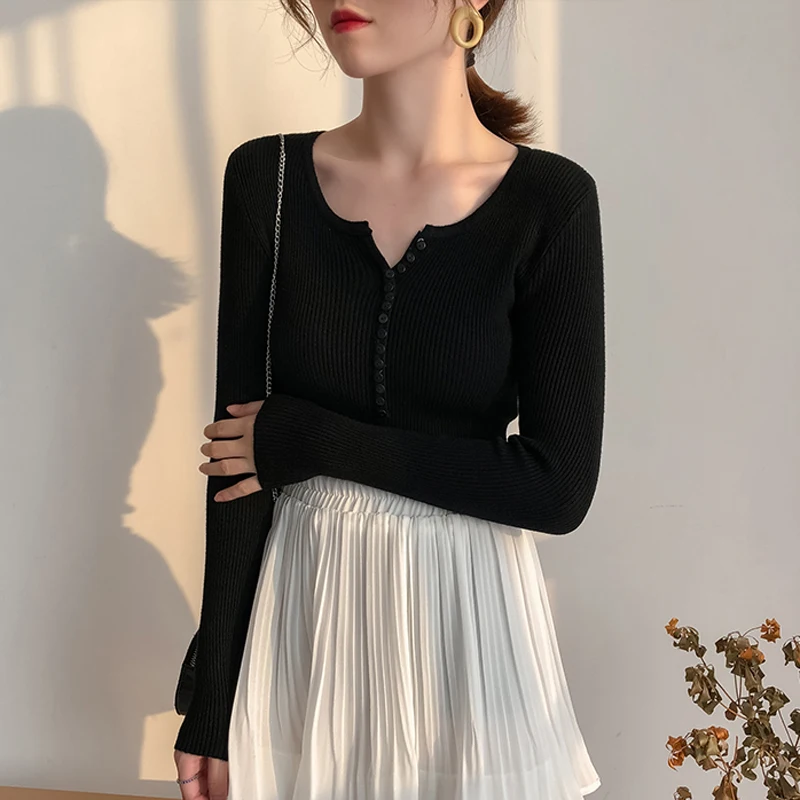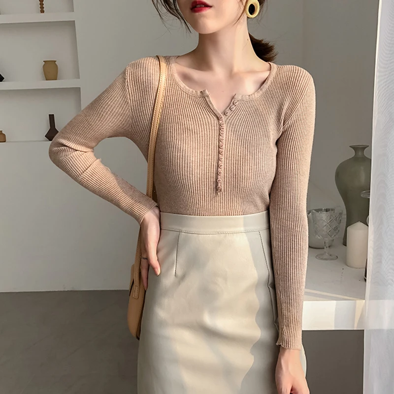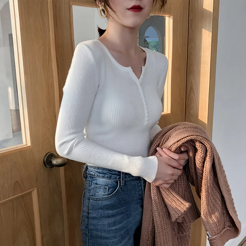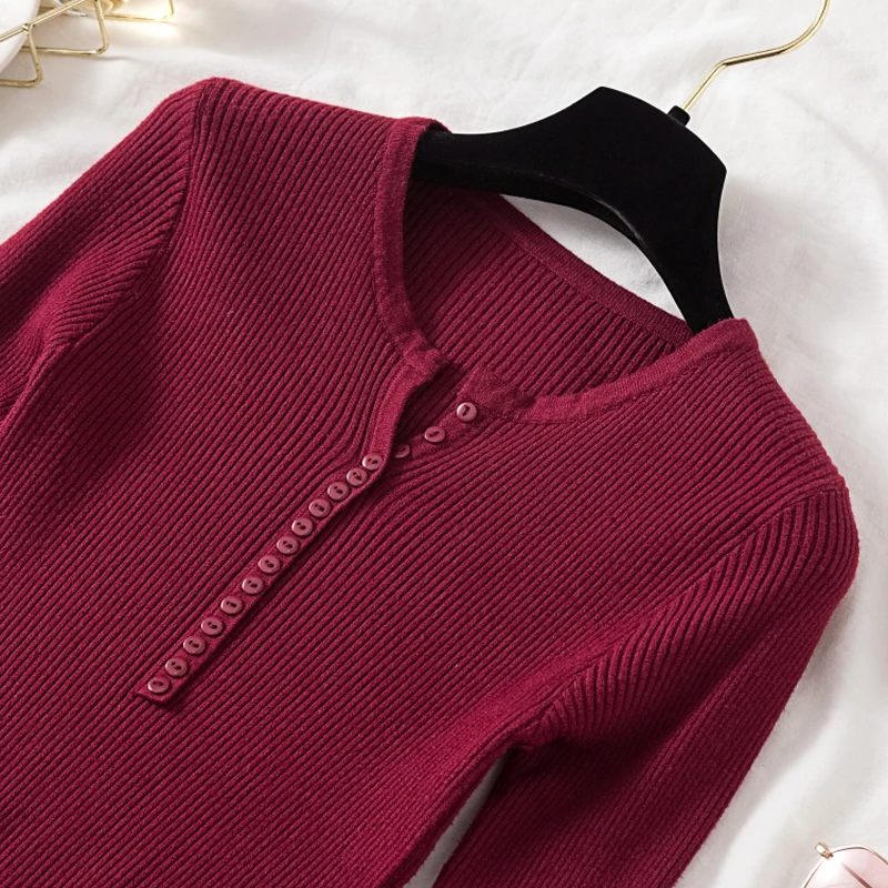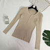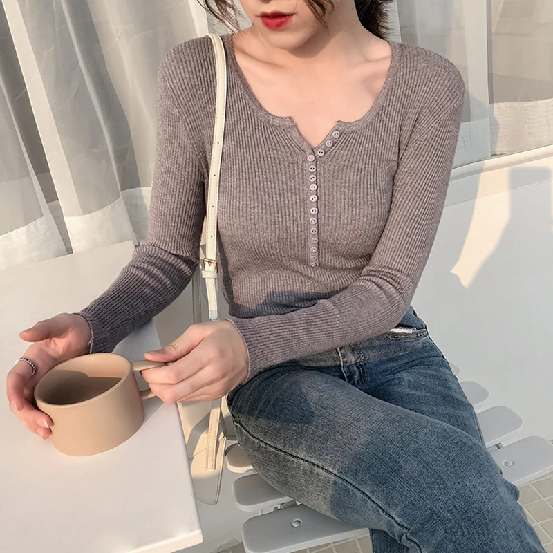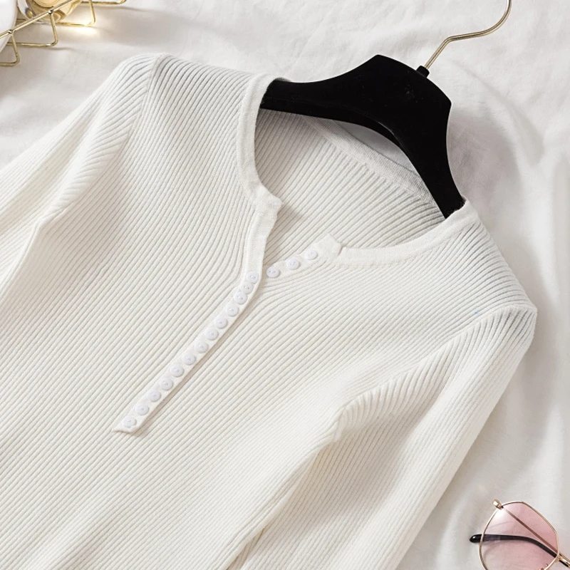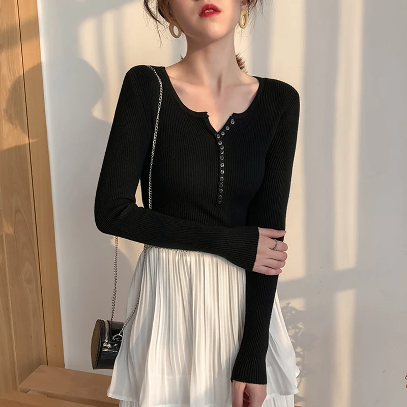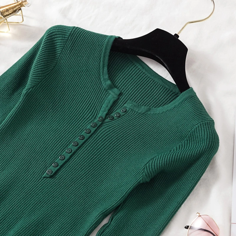 JMPRS V Neck Pullover Sweater Women Basic Autumn Slim Knitted Jumper Long Sleeve Button Soft Elastic Female Top New