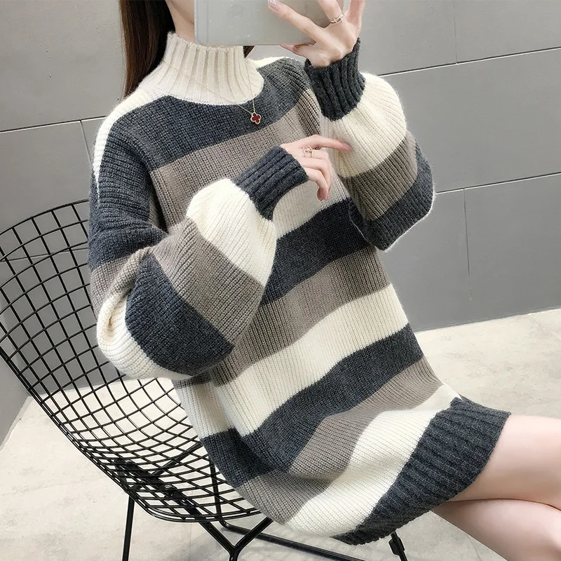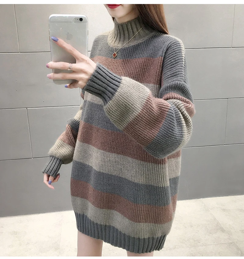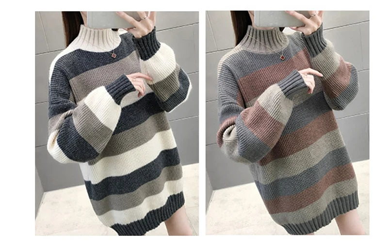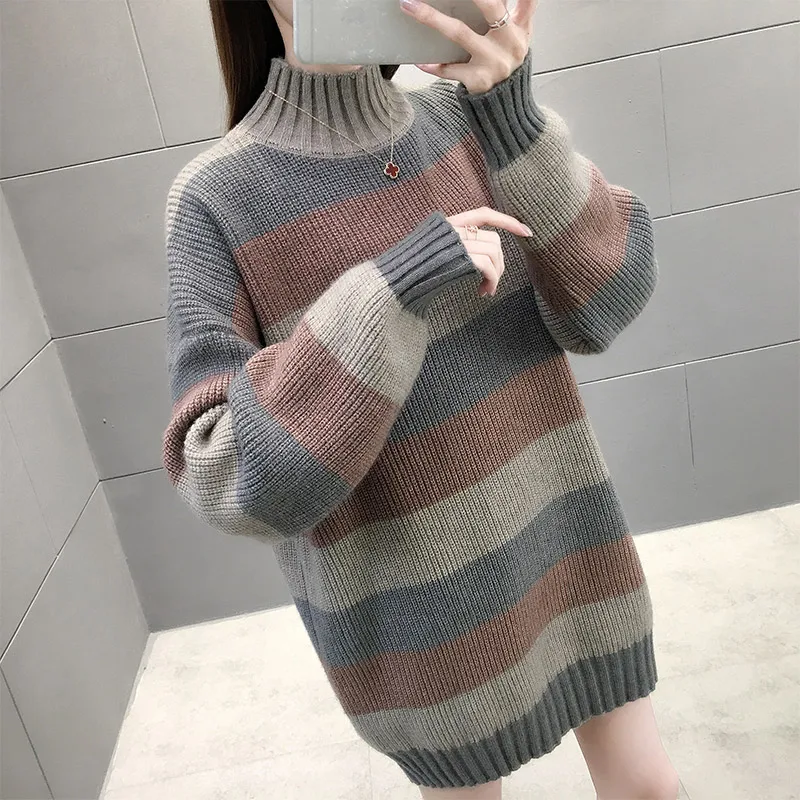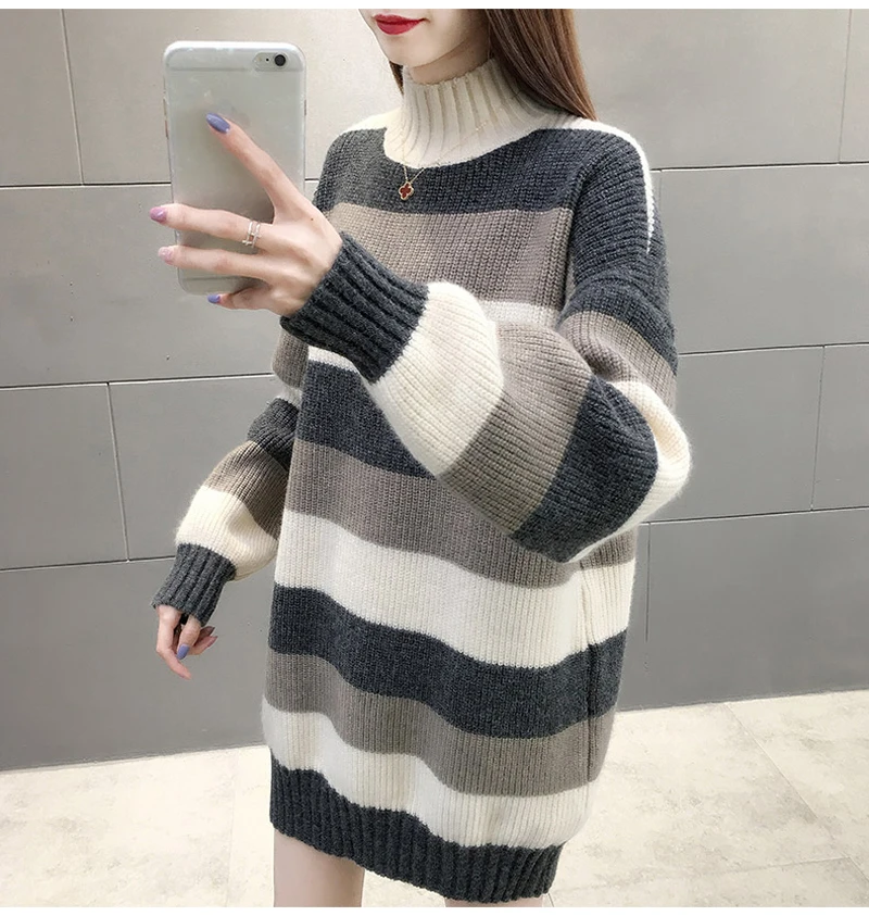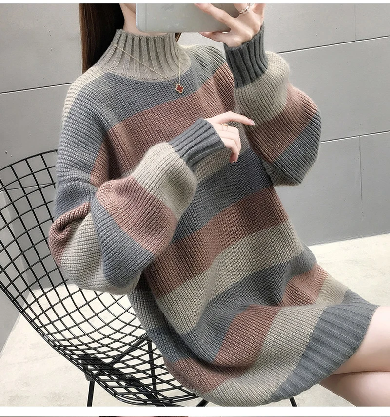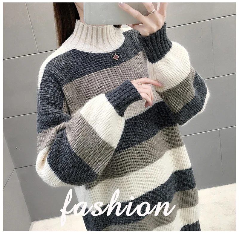 JMPRS Winter Striped Women Pullover Sweater Loose Long Sleeve Thick Turtleneck Knitted Jumper Sweater Coat Casual Ladies Top