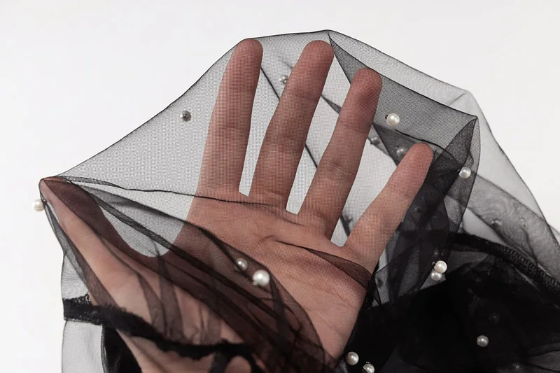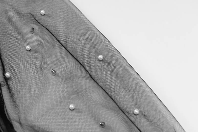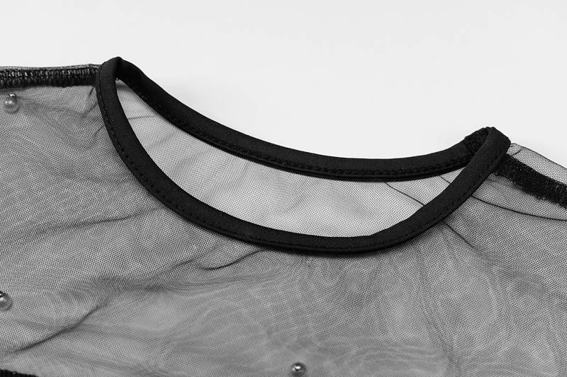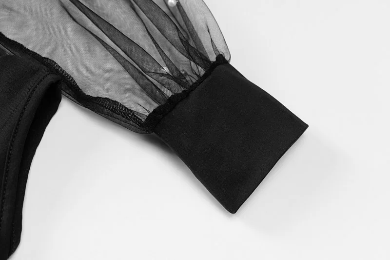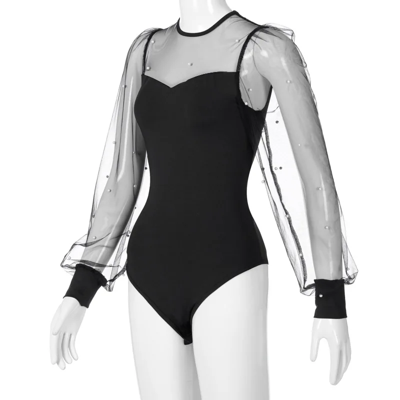 Kayotuas Women Bodysuit Pearl Mesh Puff Long Sleeve Leotard See-Through Skinny Bodycon Basic Black Sexy Lady Mesh Hollow Clothes