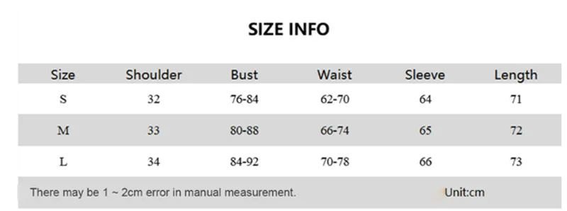 M Bust: 80-88 Length: 72 Sleeve: 65 Waist: 66-74 Shoulder: 33