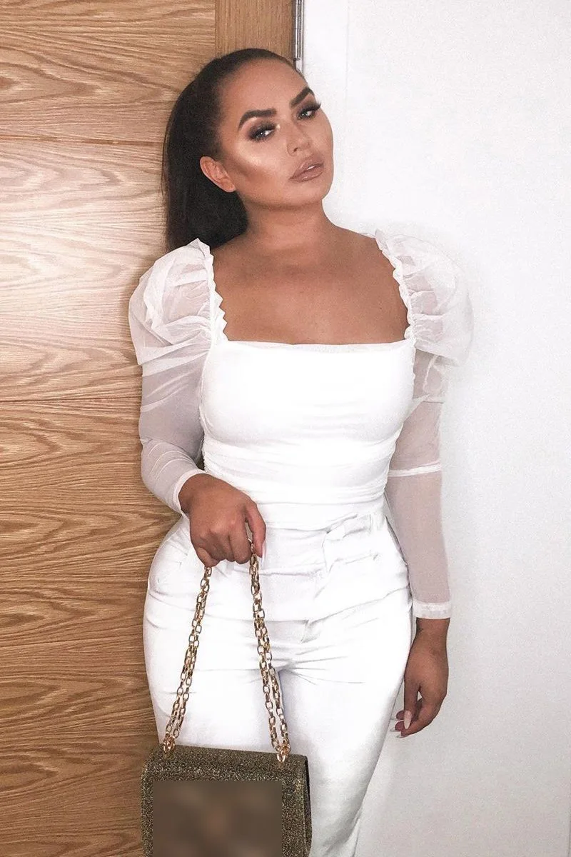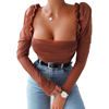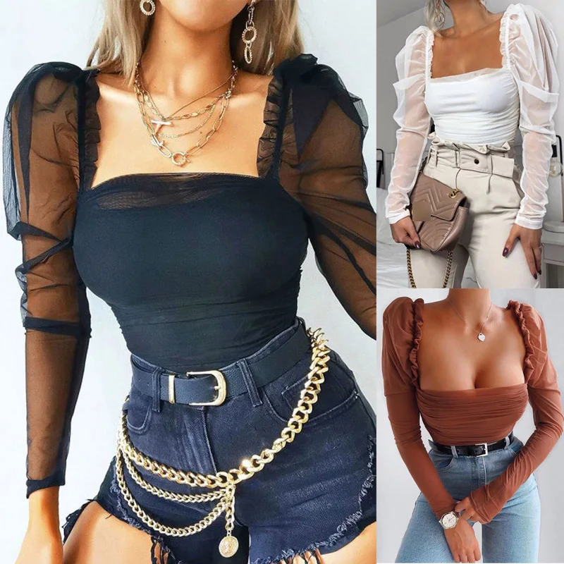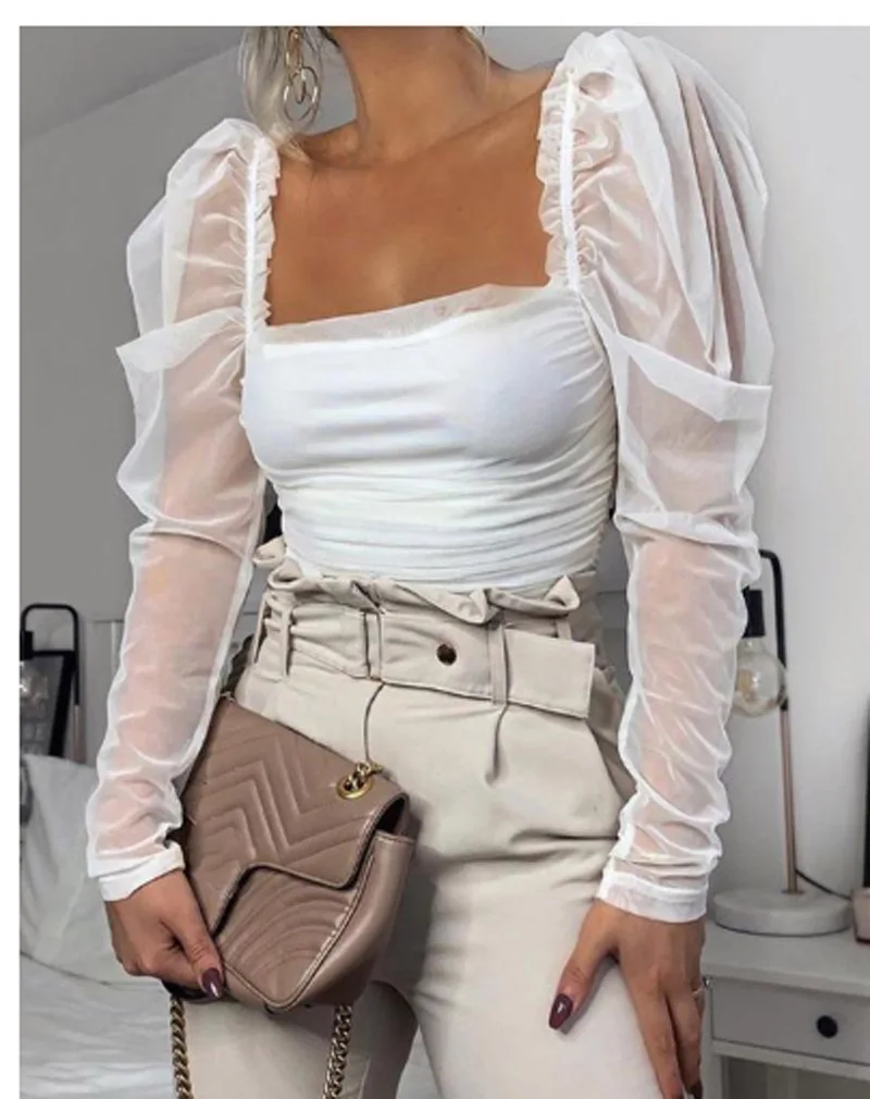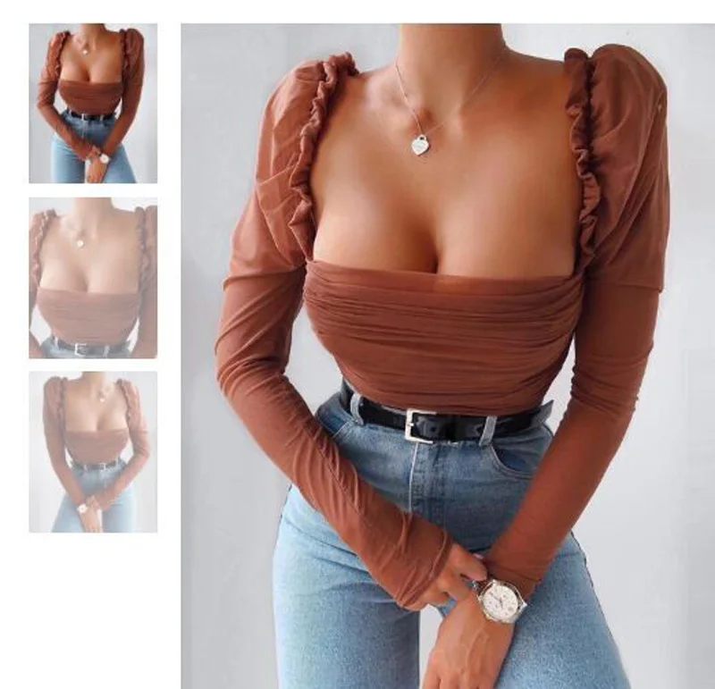Kayotuas Women Bodysuit Sexy Casual Top Solid Mesh Patchwork Puff Sleeve Ruched Backless Office Ladies Romper Brown Black White