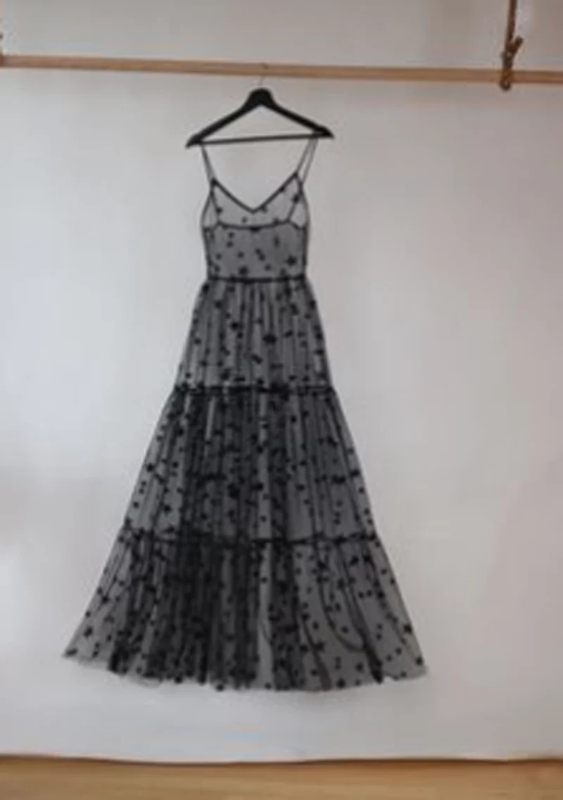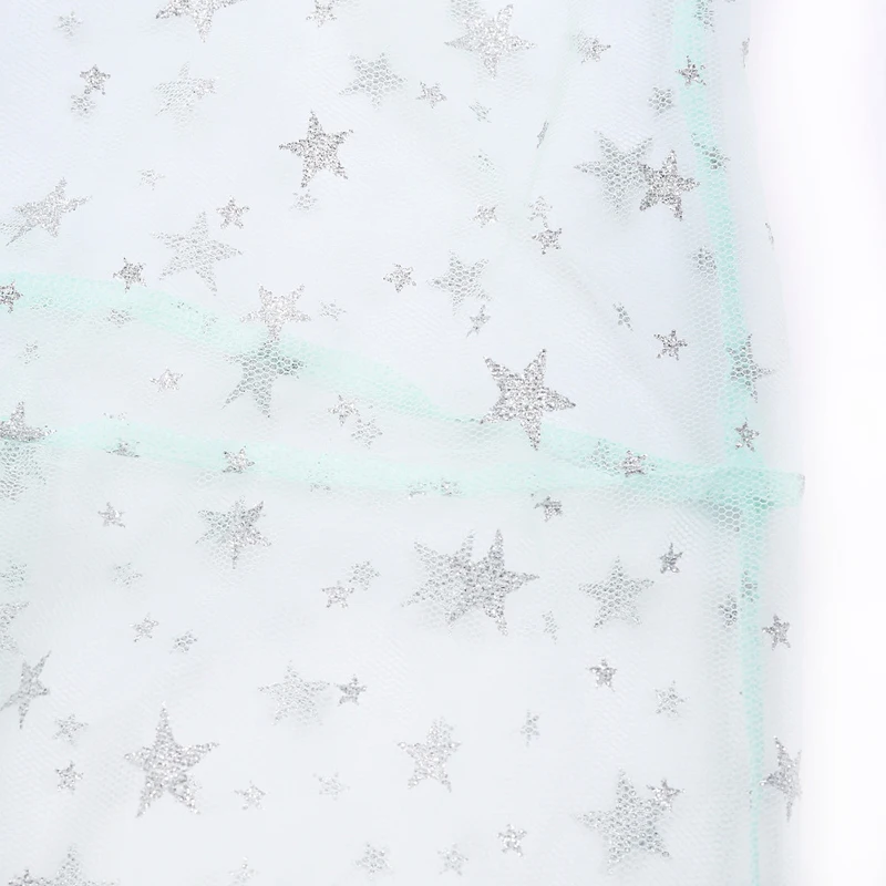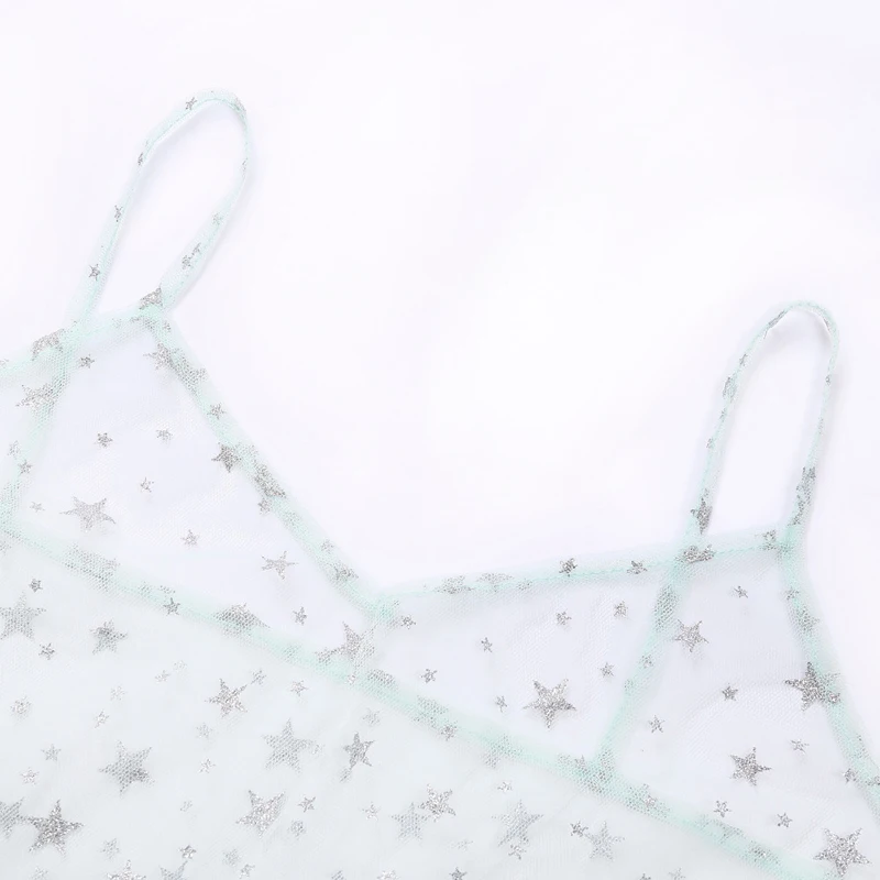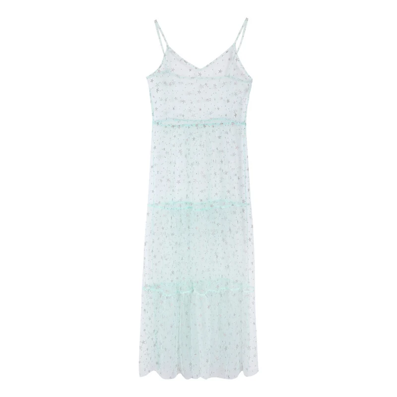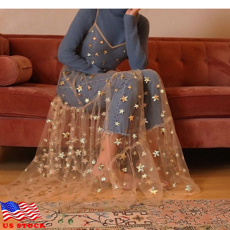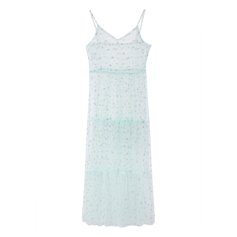 Kayotuas Women Dress Spaghetti Straps Tulle Sexy Cover-Up Long Mesh Sheer Star Print Hot See-Through Pleated Clubwear