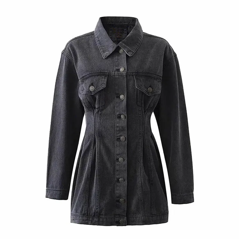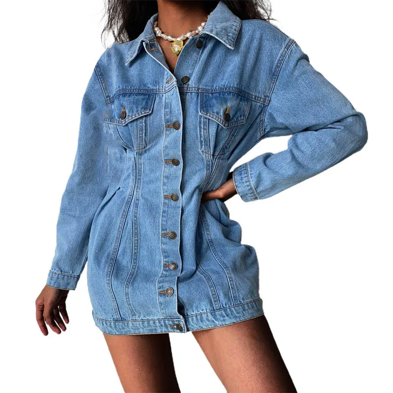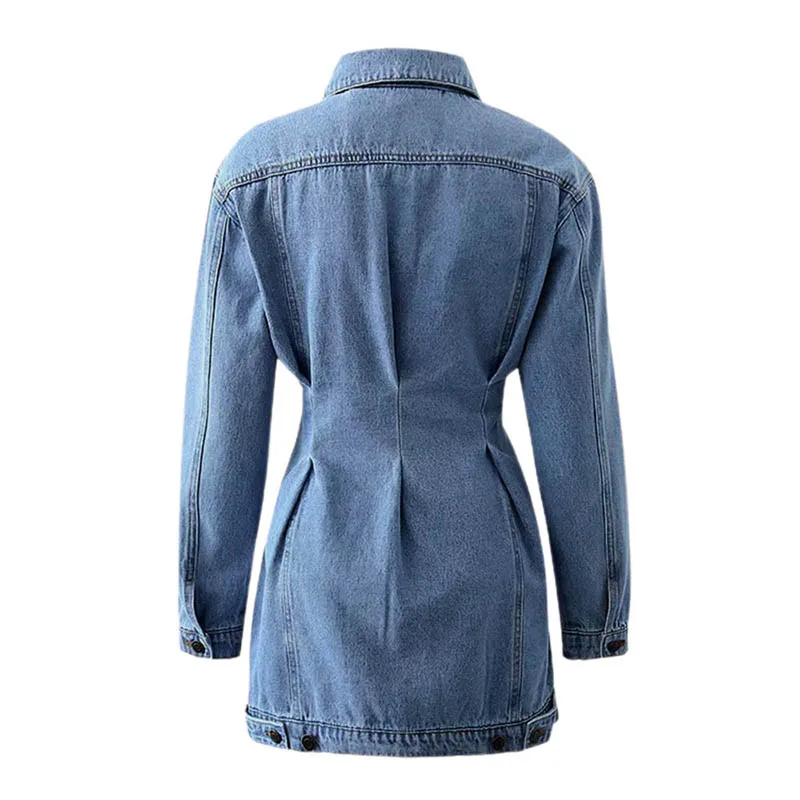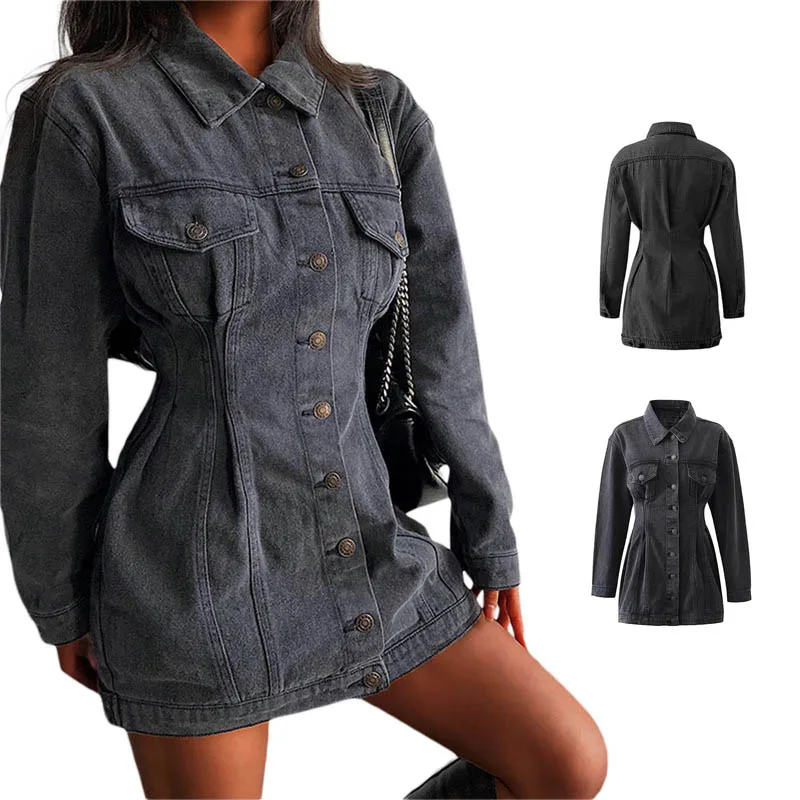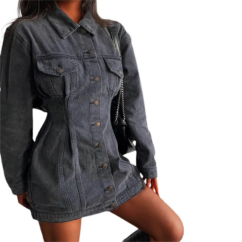 Kayotuas Women Dress Stylish Lapel Single-Breasted Denim Spring Long Sleeve Slim Waist Female Jeans Mini Vintage Streetwear