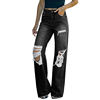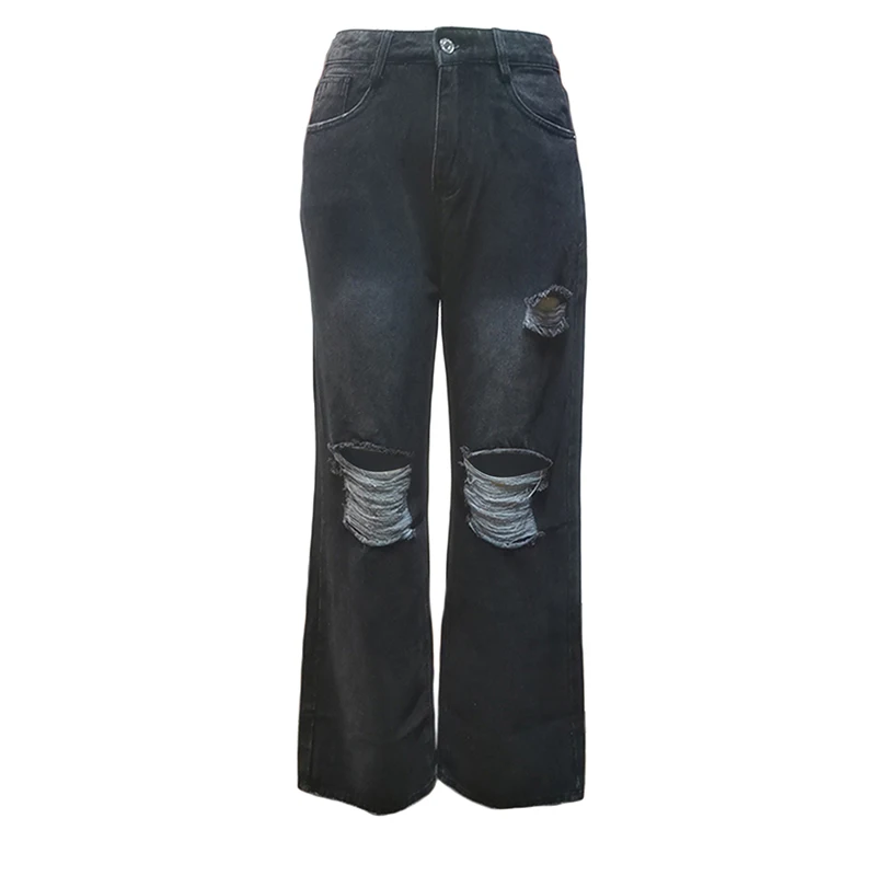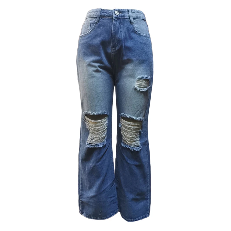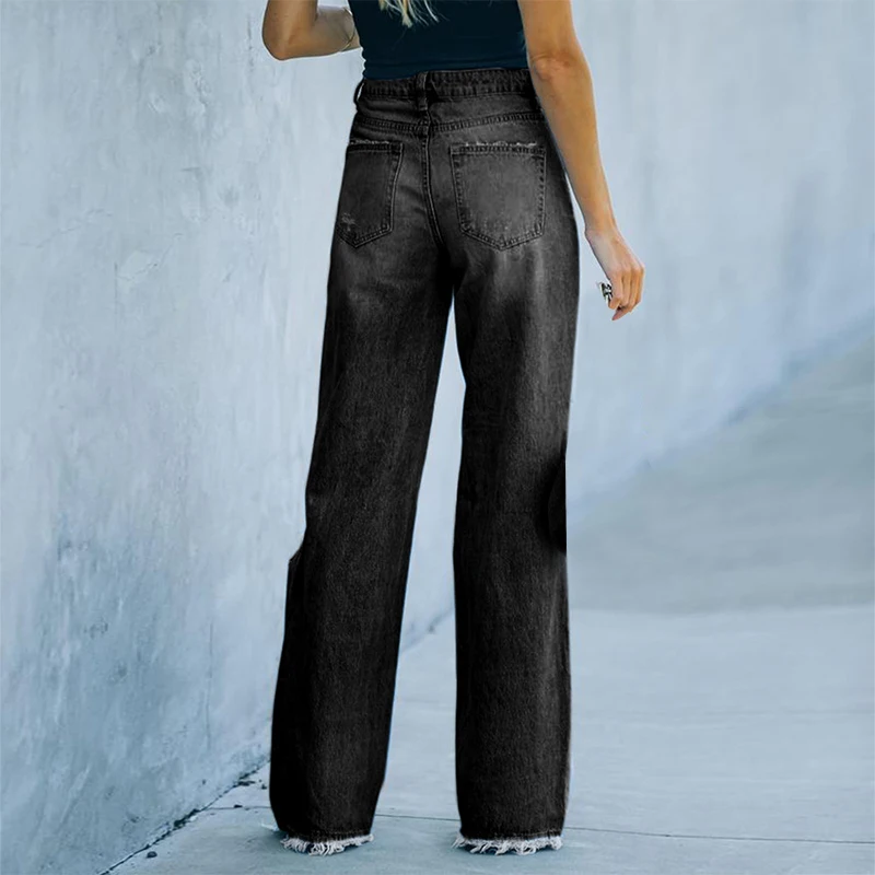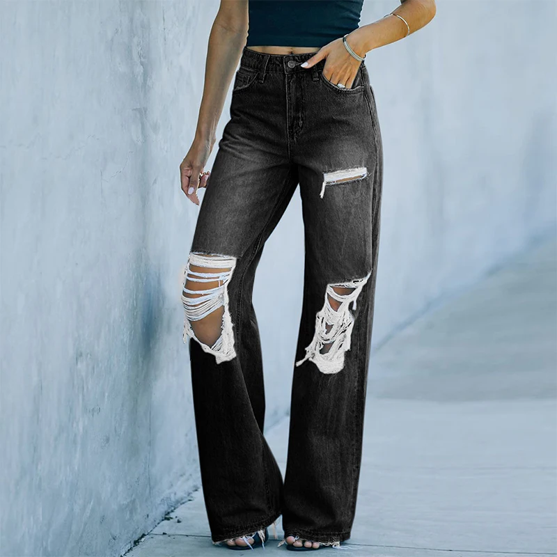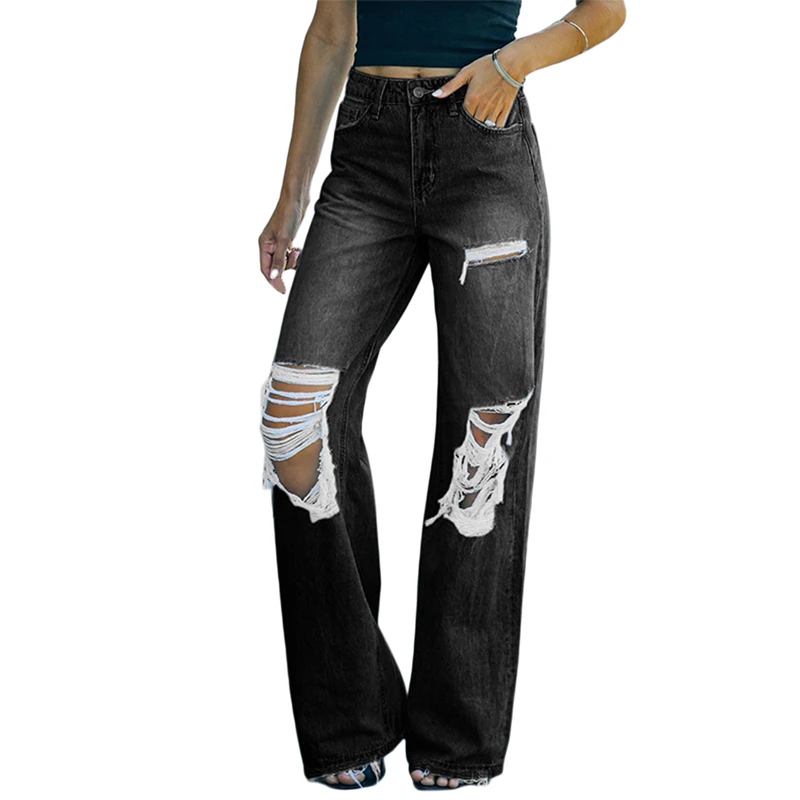 Kayotuas Women Jeans Denim High Waist Hollow Out Hole Ripped Ladies Button Down Retro Vintage Girls Bottoms Wide Leg Trousers