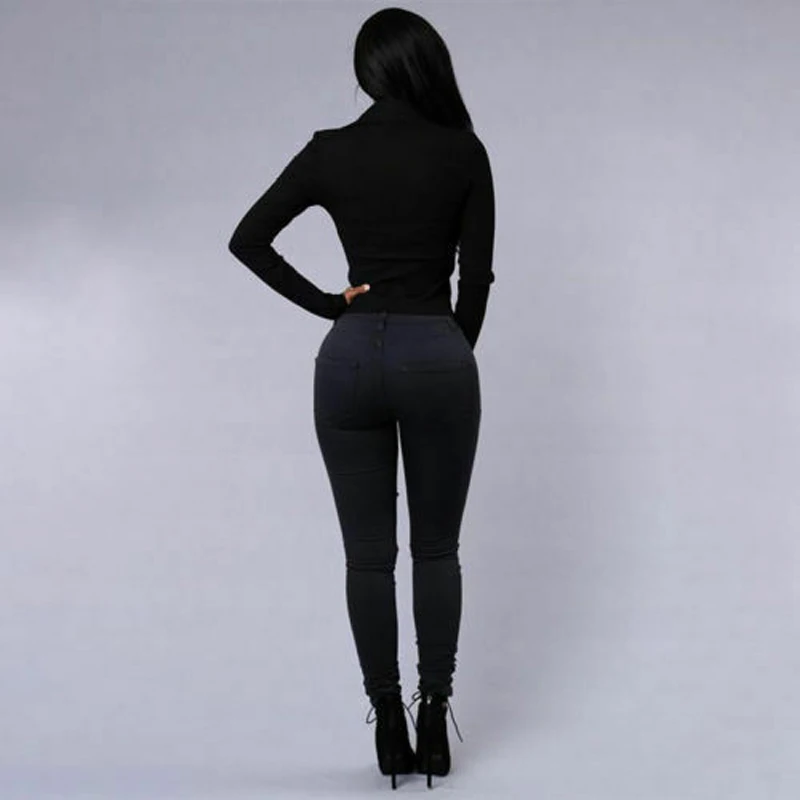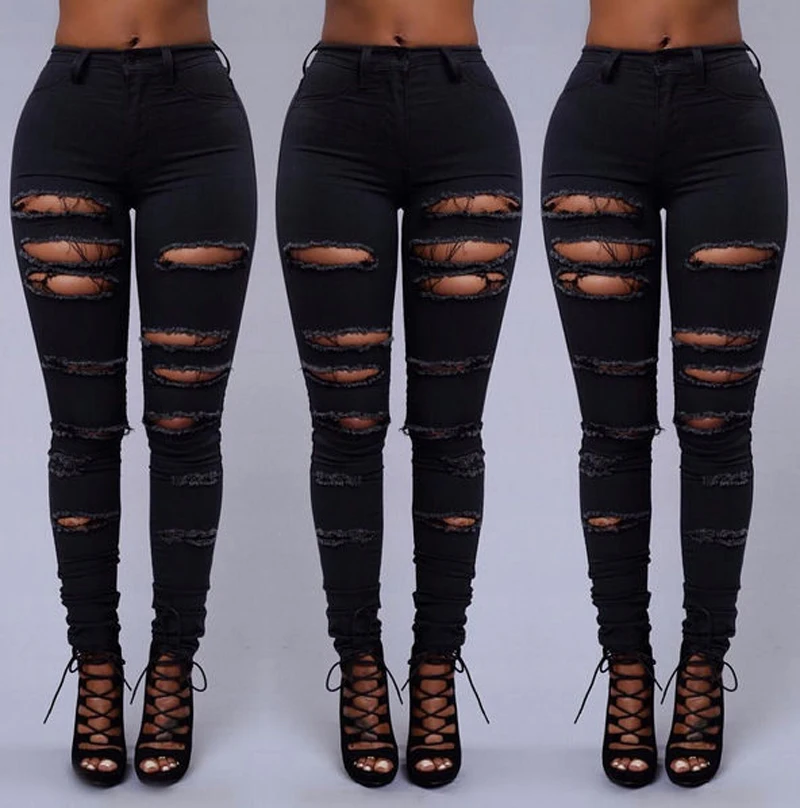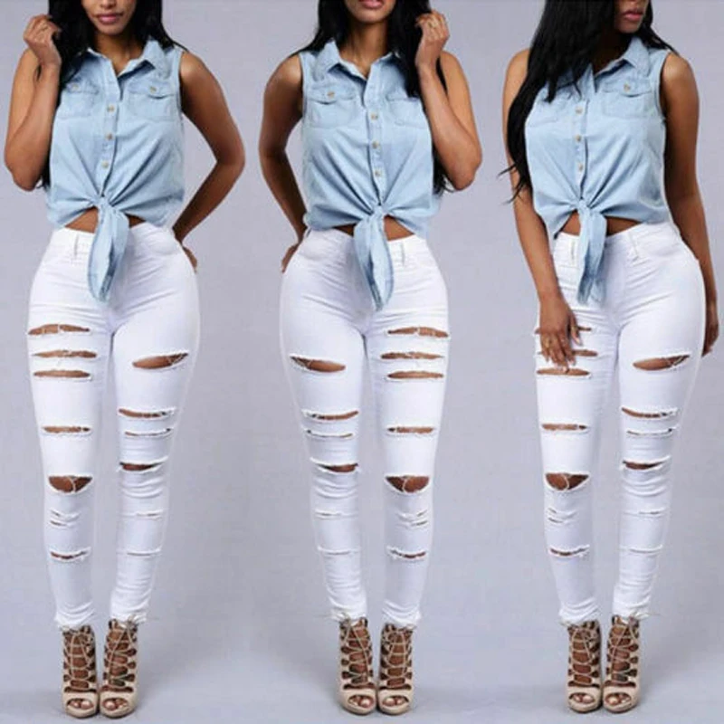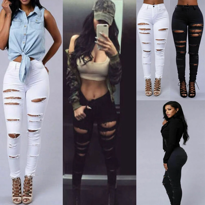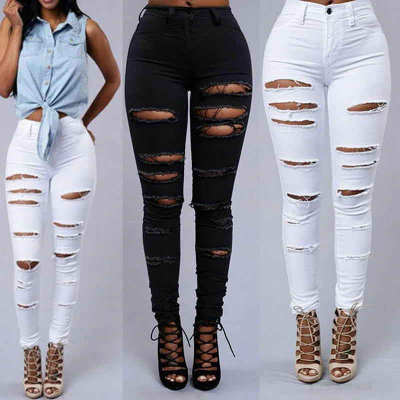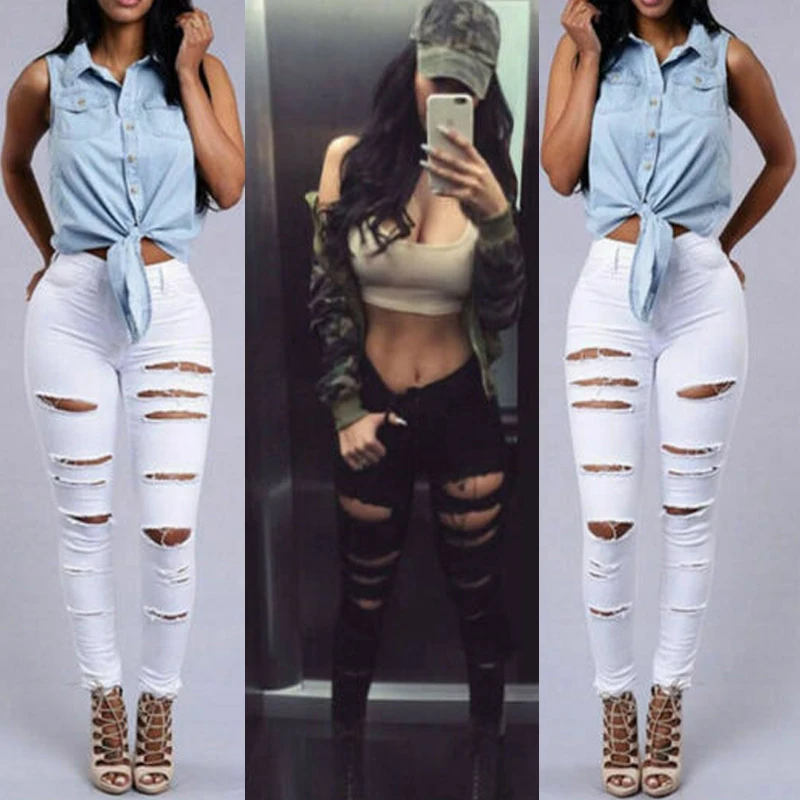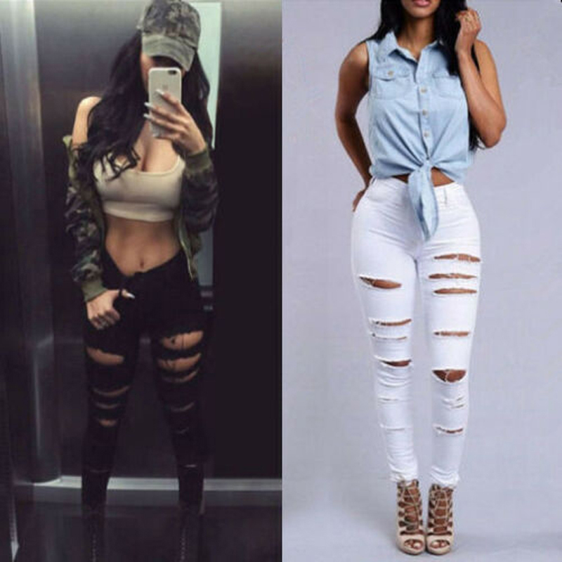 Kayotuas Women Jeans New Fashion Trend Denim Skinny High Waist Hole Pencil Trousers Stretch Ripped Female Black White Streetwear
