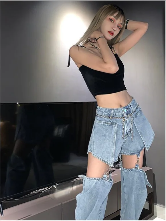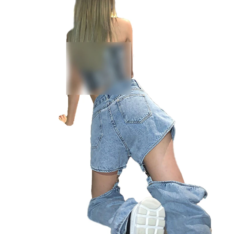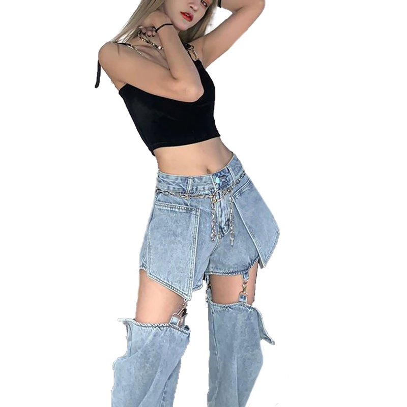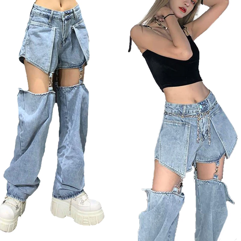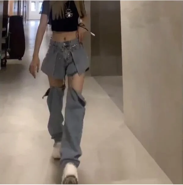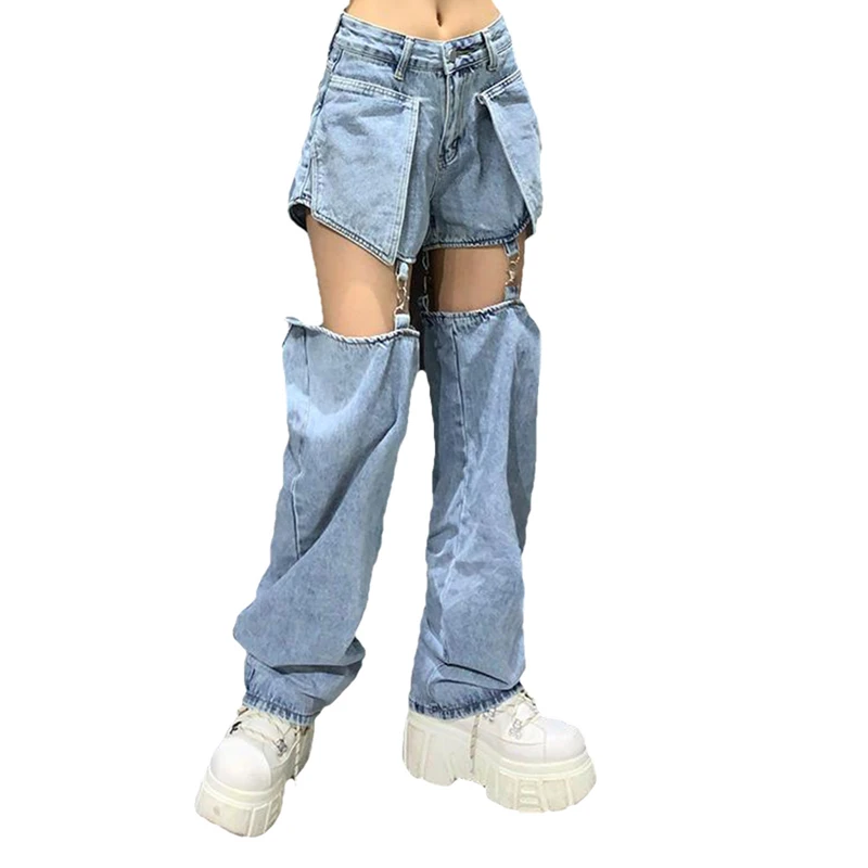 Kayotuas Women Jeans Straight Leg Blue Solid Detachable High Waist Clothes Female Denim Vintage Clothing Straight Trousers