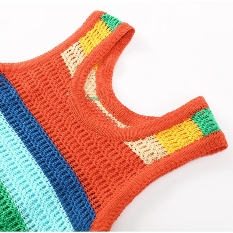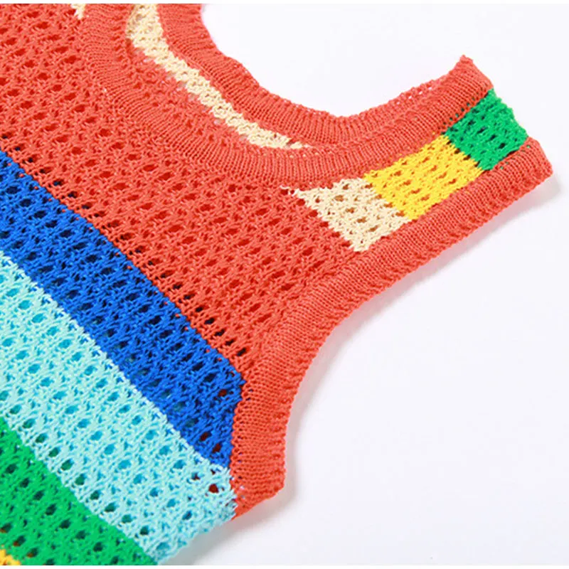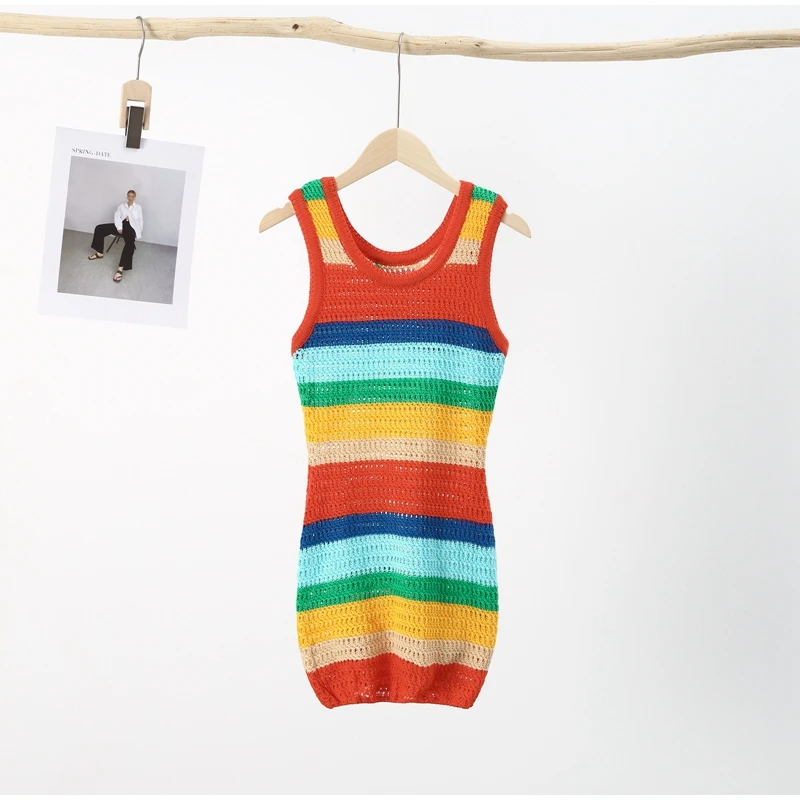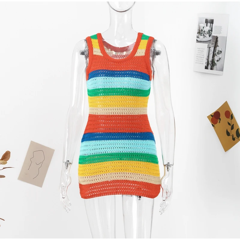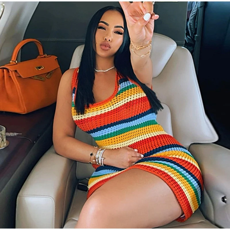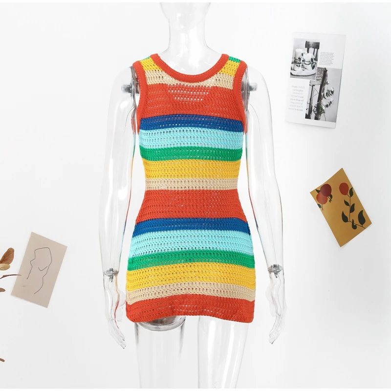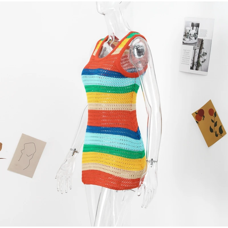 Knitted Rainbow Patchwork Women Mini Dress Casual O-Neck Sleeveless With Holes Skinny Dresses Female Trend Bodycon Streetwear