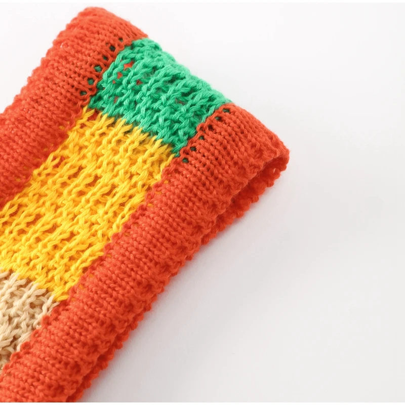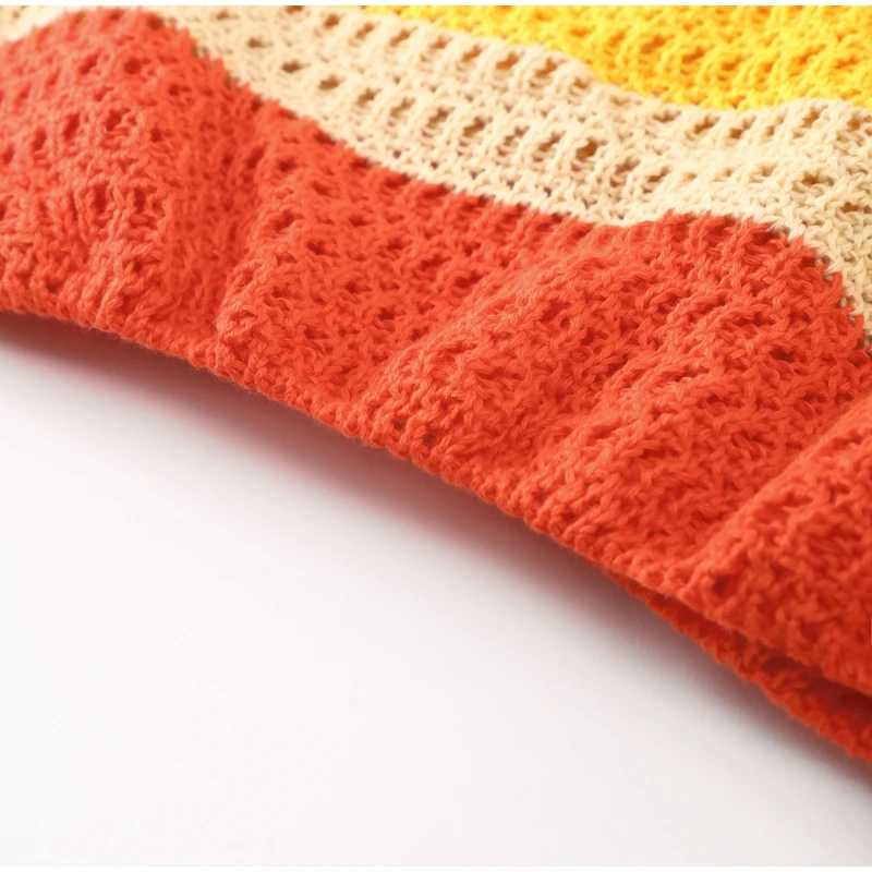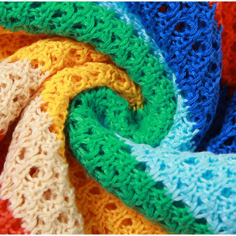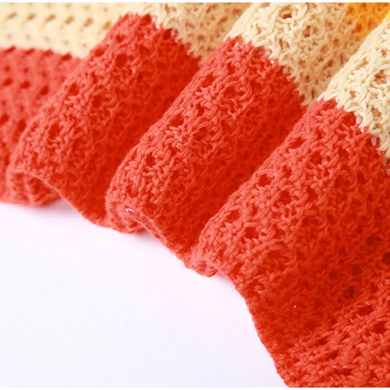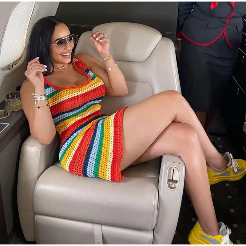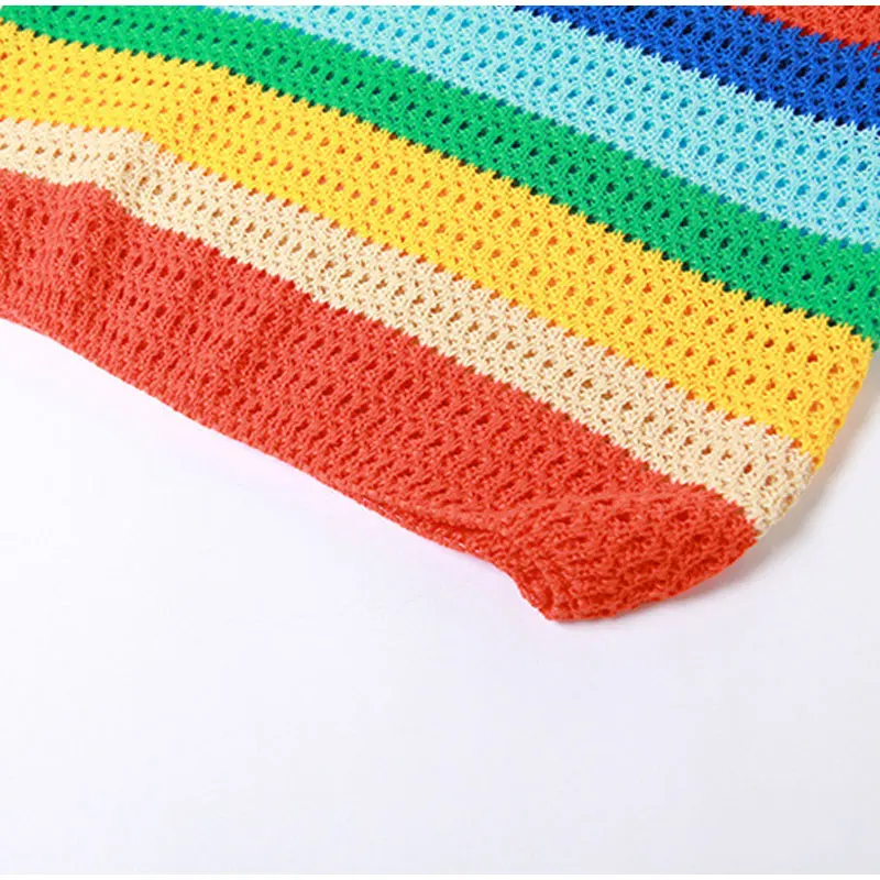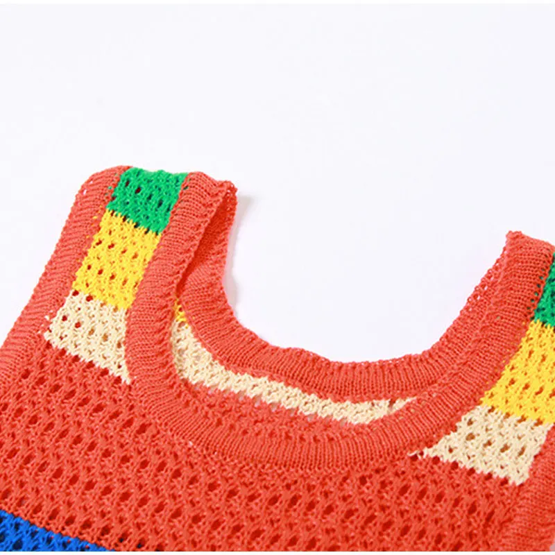 Knitted Rainbow Patchwork Women Mini Dress Casual O-Neck Sleeveless With Holes Skinny Dresses Female Trend Bodycon Streetwear