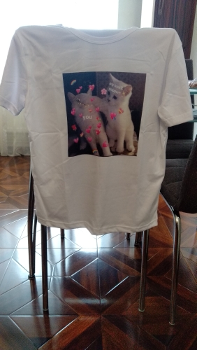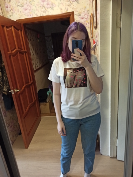 T-shirts are very cool. I wear the size 42-44, took XL, sit free, just what I wanted. 35% cotton and 65% polyester, soft and light. The picture is embedded in the fabric, but the white T-shirt itself shines a little. Definitely I will take other T-shirts, I probably will have their collection