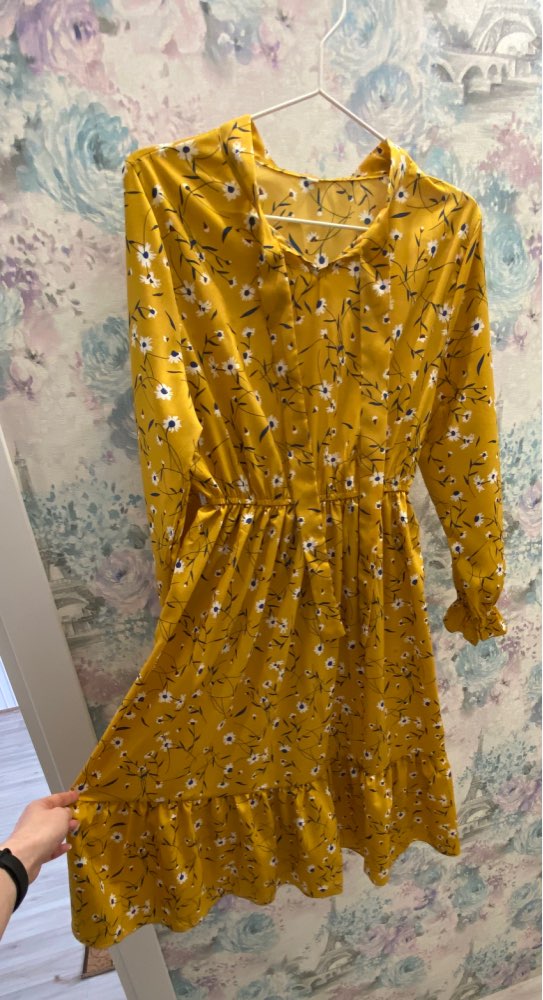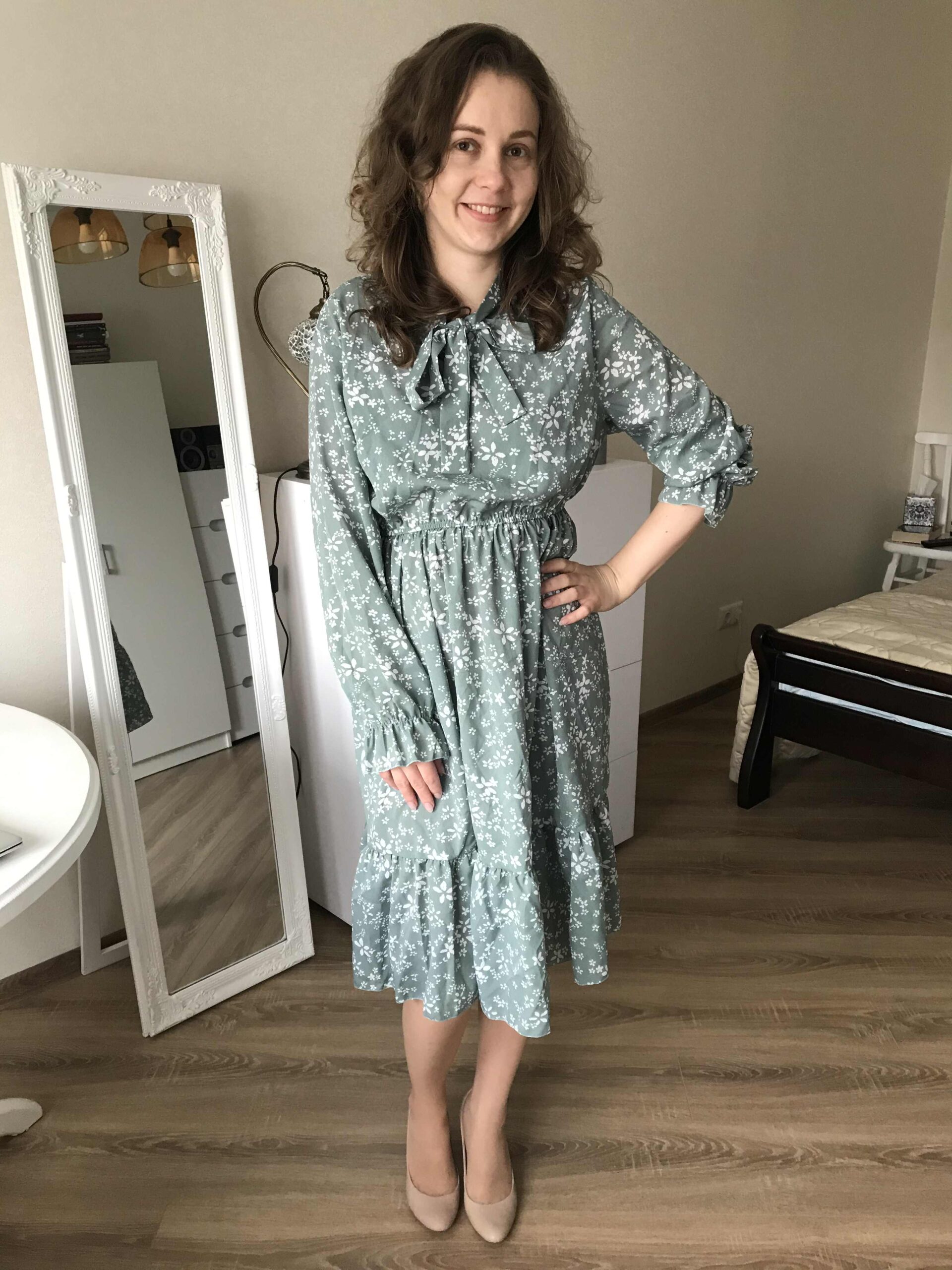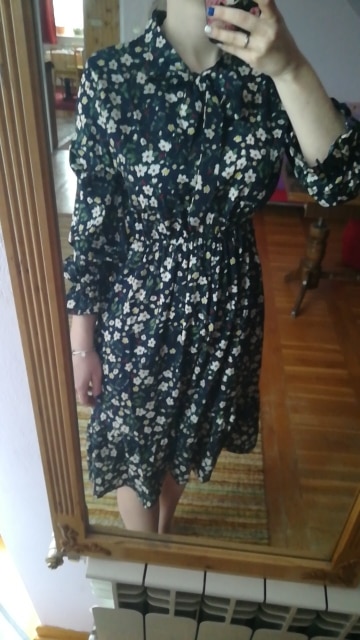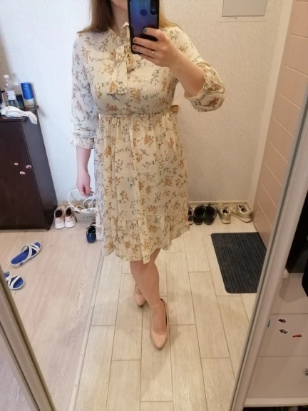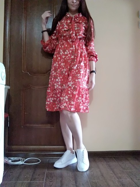 The dress is super, the fabric is dense, made neatly. On my height 168 knee-deep or slightly lower. The order is satisfied. At 44 size took S