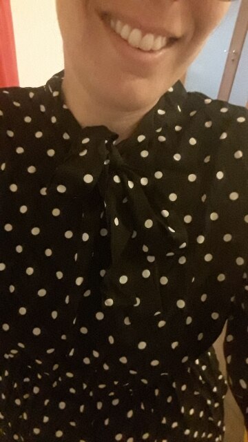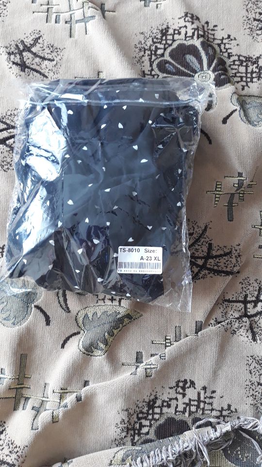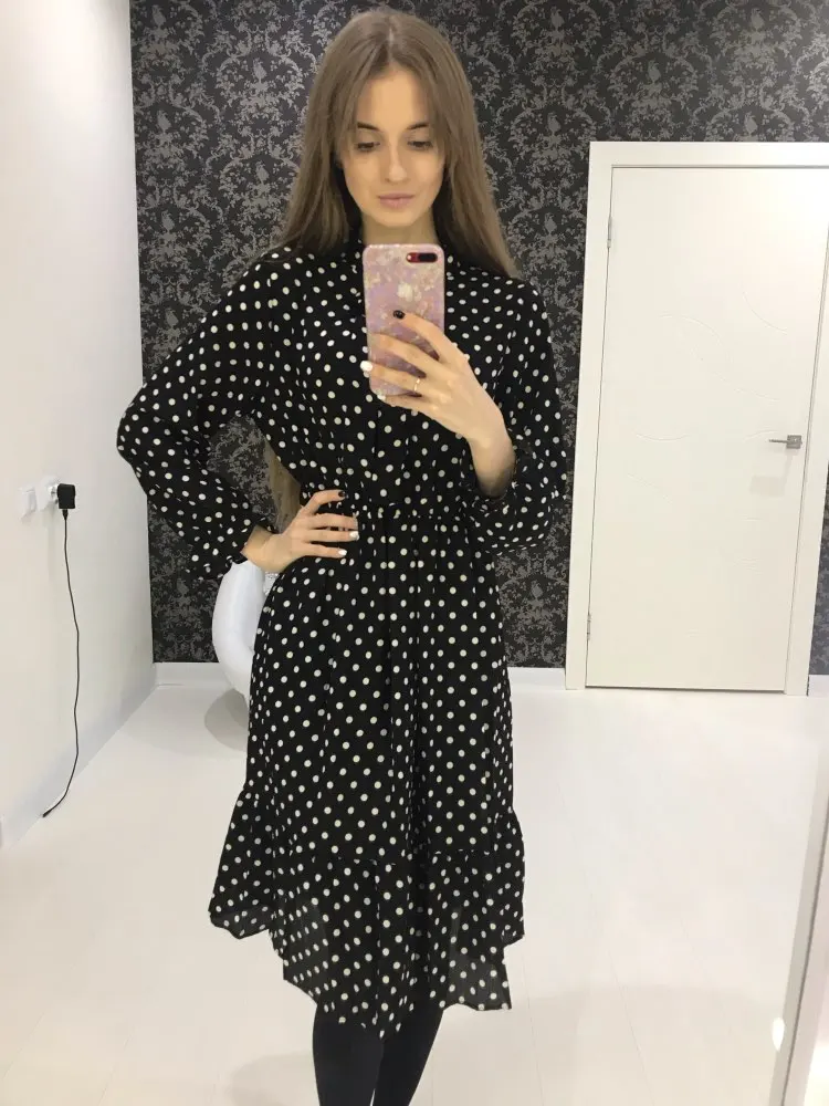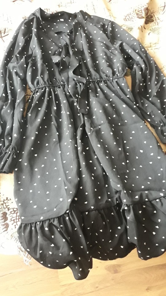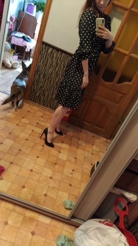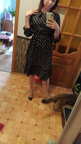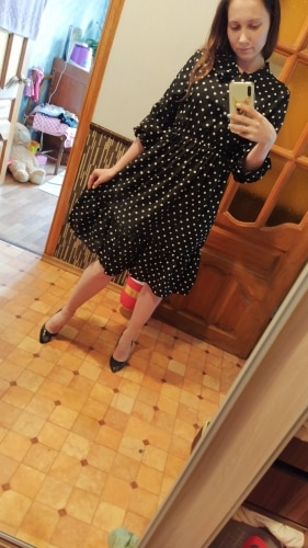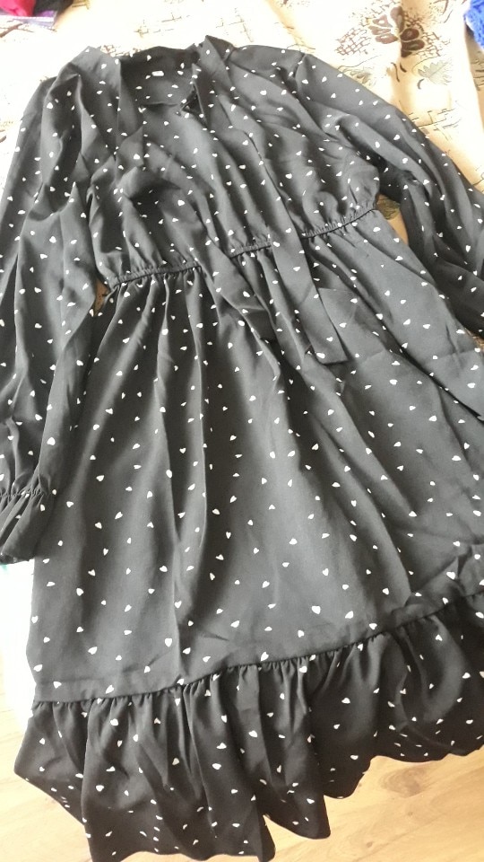 I did not dare to order such a dress for a long time. The dress is cute, black with white hearts. On the neck you can tie a bow. the fabric is thin, because it will not shine through the black. Electrically. OG 96, OT 86, OB 98. All in size. At the waist is an elastic band. Height 157, length below the knee per palm. Advise. Thank you store.