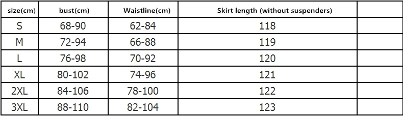 SizeBustWaistSkirt length (without sling)