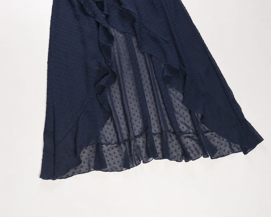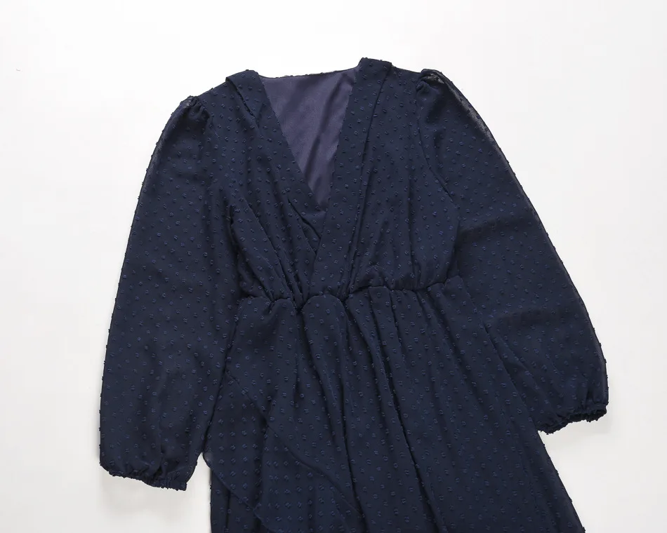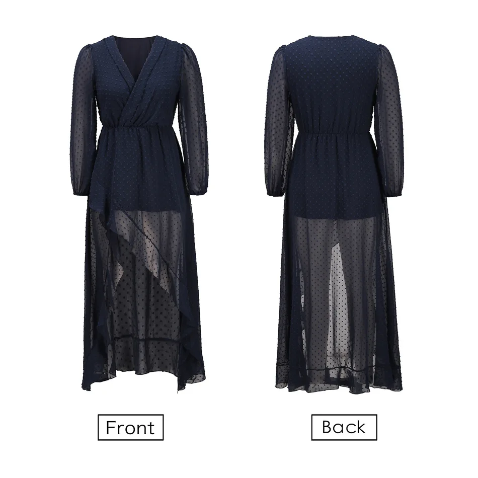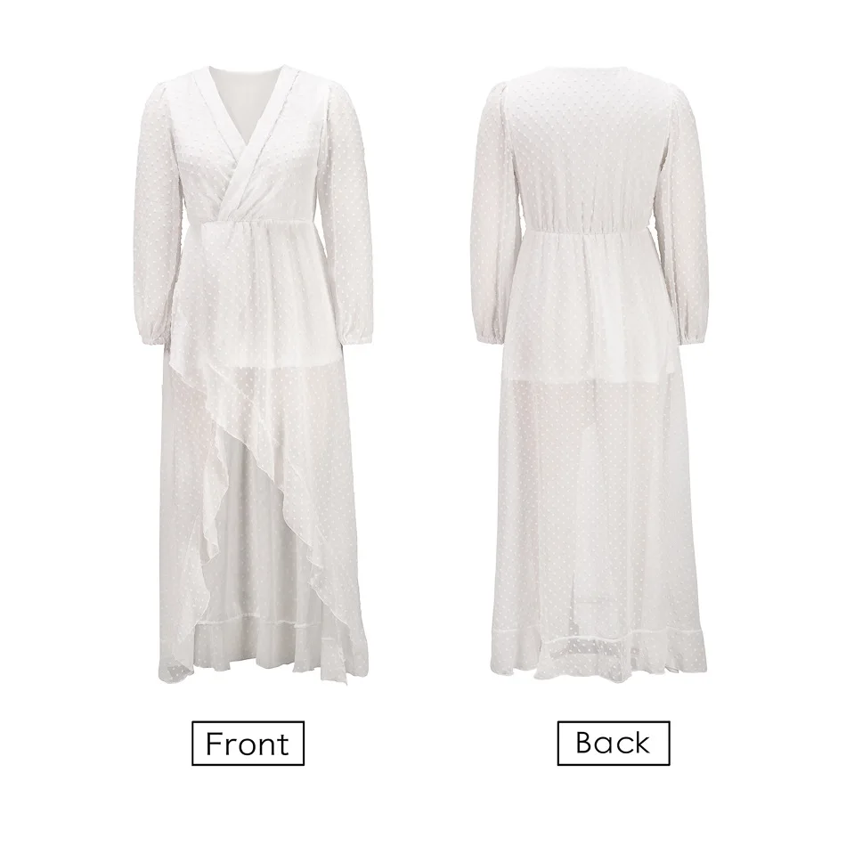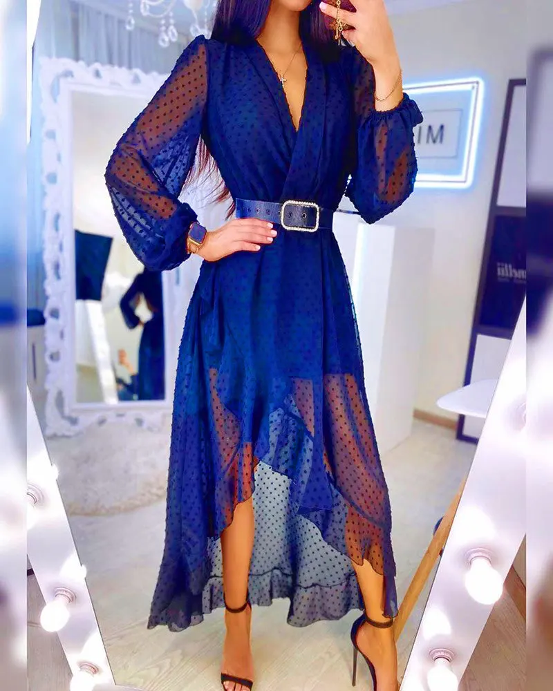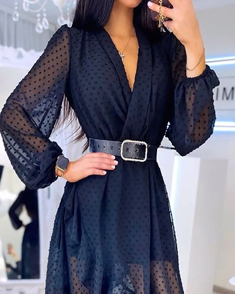 Lantern Sleeve Swiss Dot Mesh Ruffles Wrap Dress