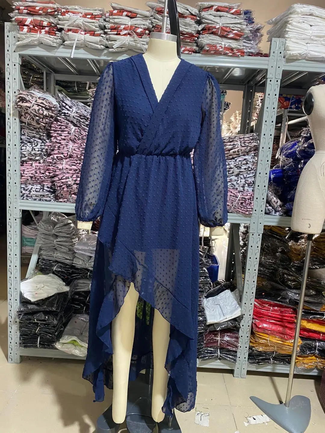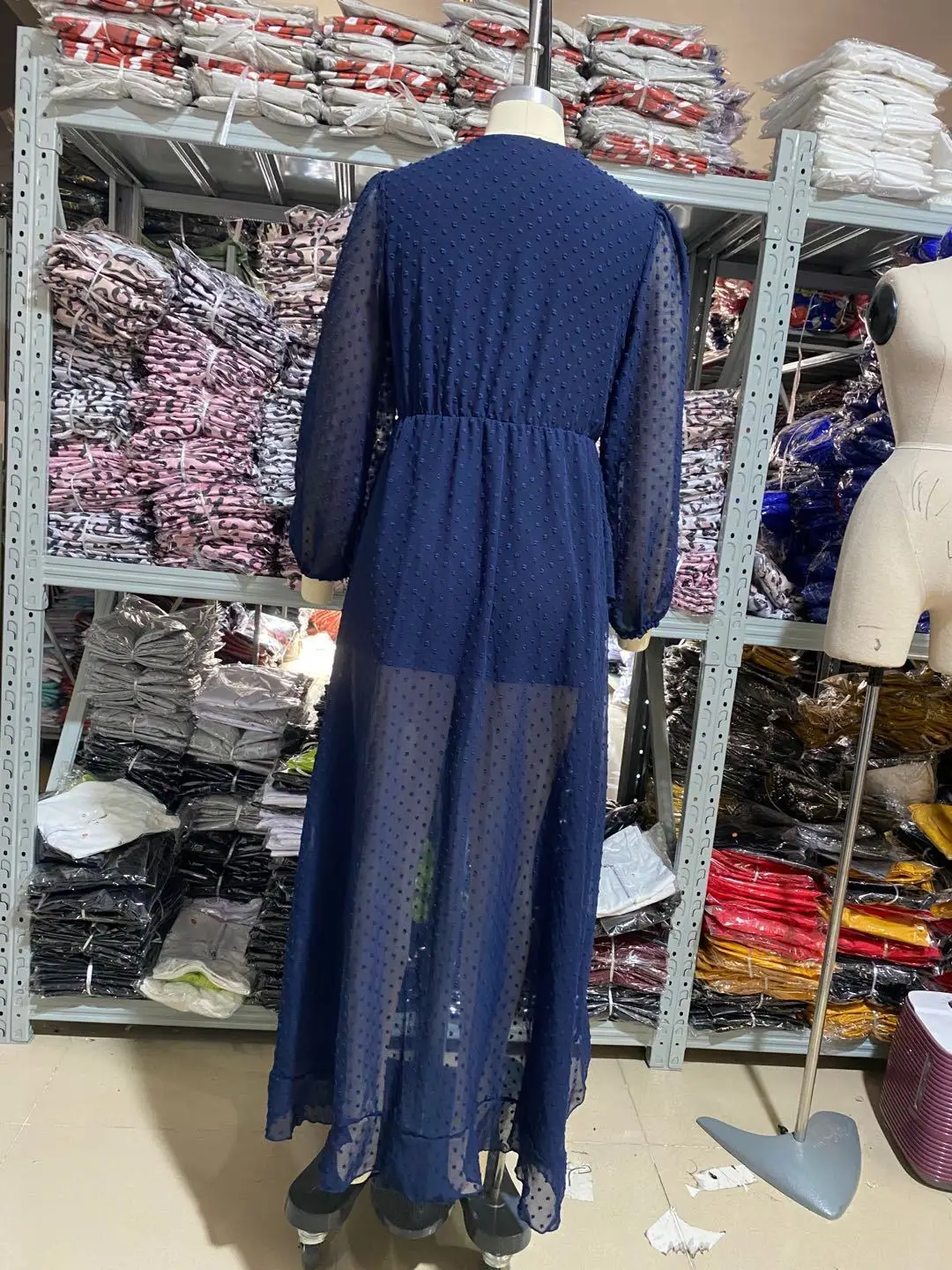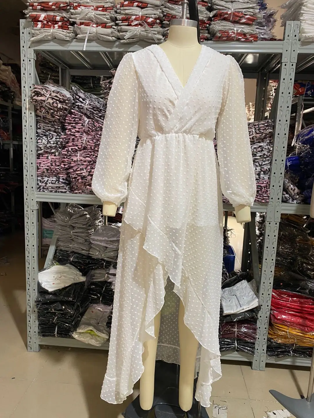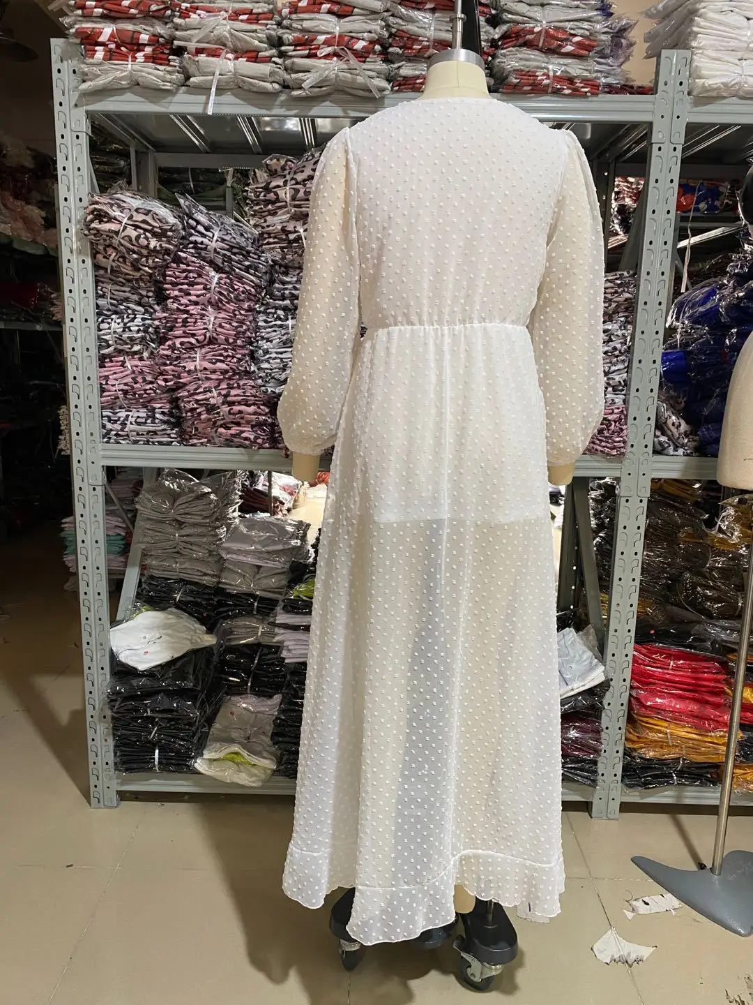 Lantern Sleeve Swiss Dot Mesh Ruffles Wrap Dress