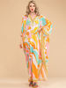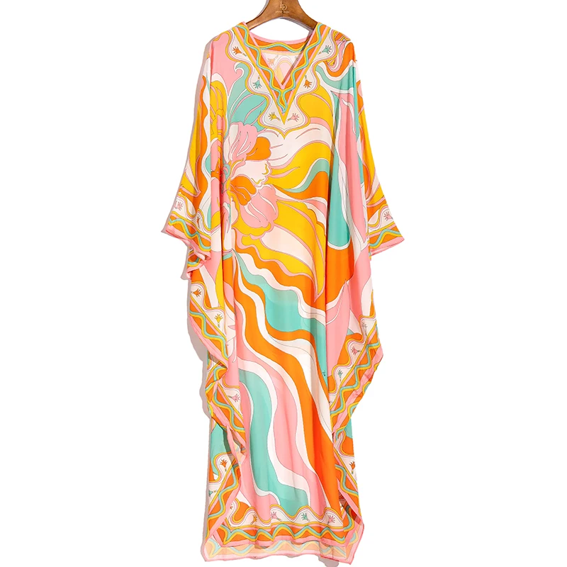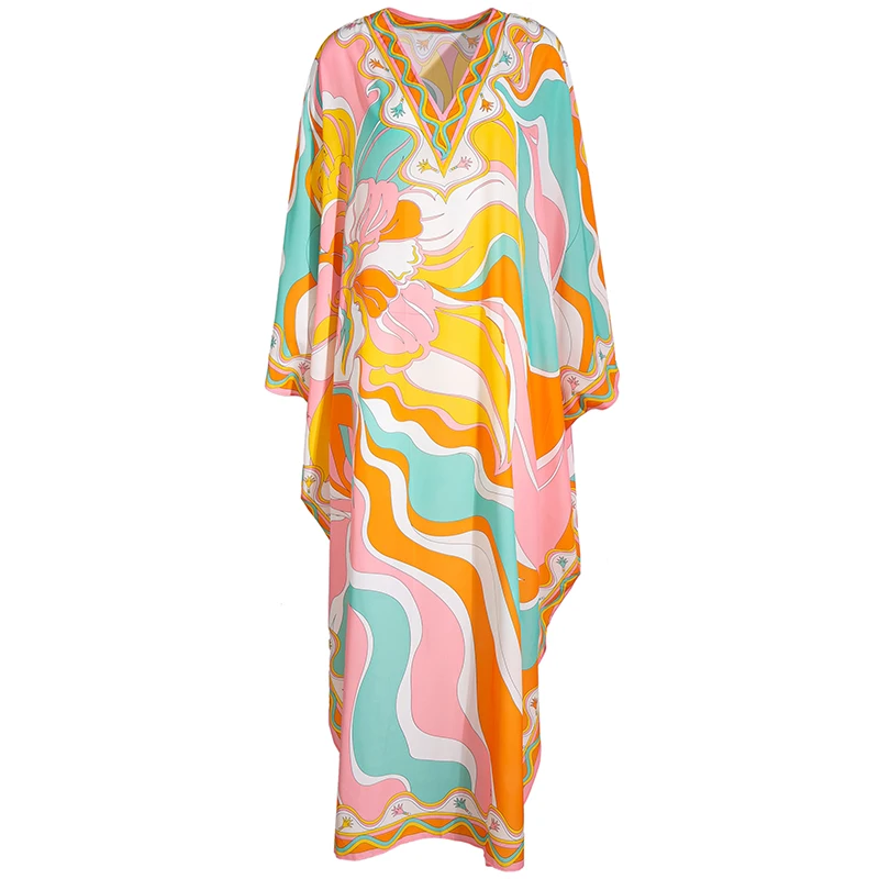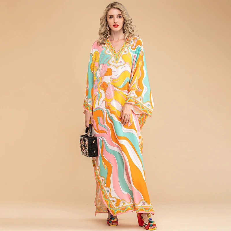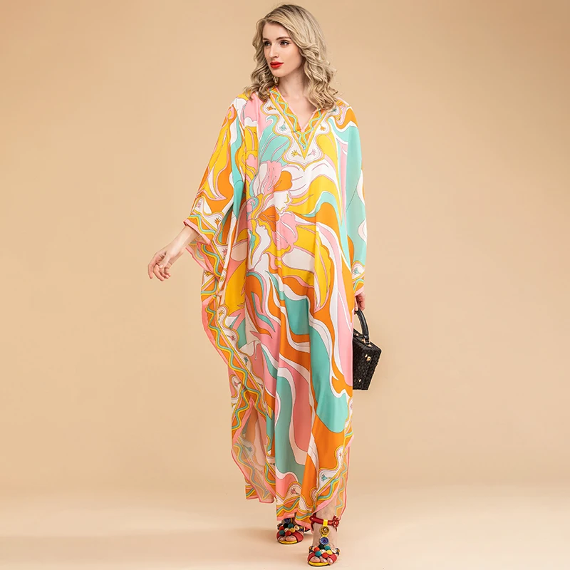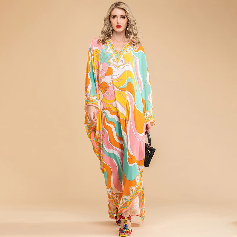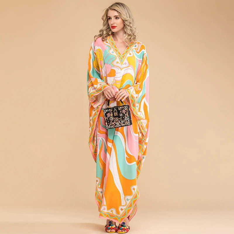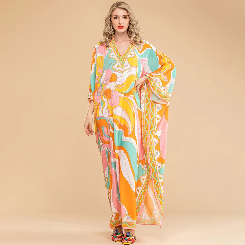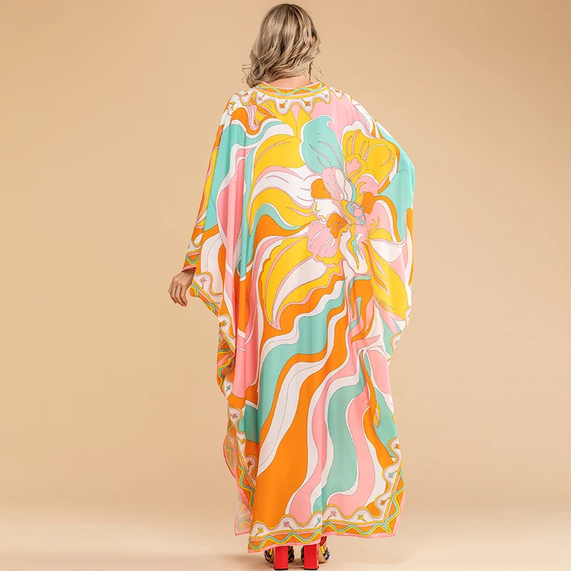 LD LINDA DELLA Summer Fashion Bohemian Loose Maxi Dress Women V neck Batwing Sleeve Printed Chiffon Long Dresses 5XL Plus Size