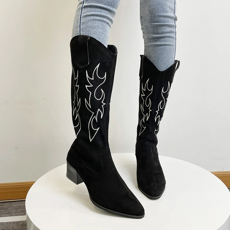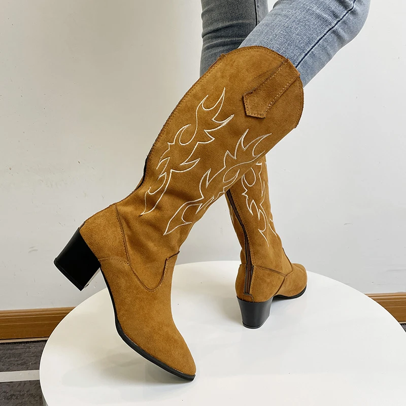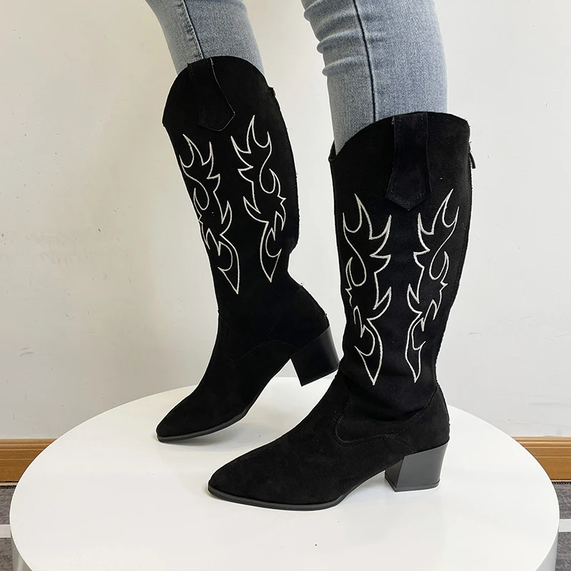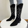Leather Luxury Women Block High Heels Long Riding Boots Winter High Boots Designer Square Heel Western Boots Mid-calf 35-43 Hot