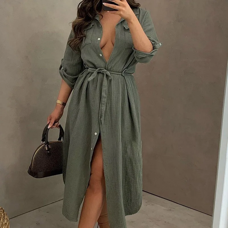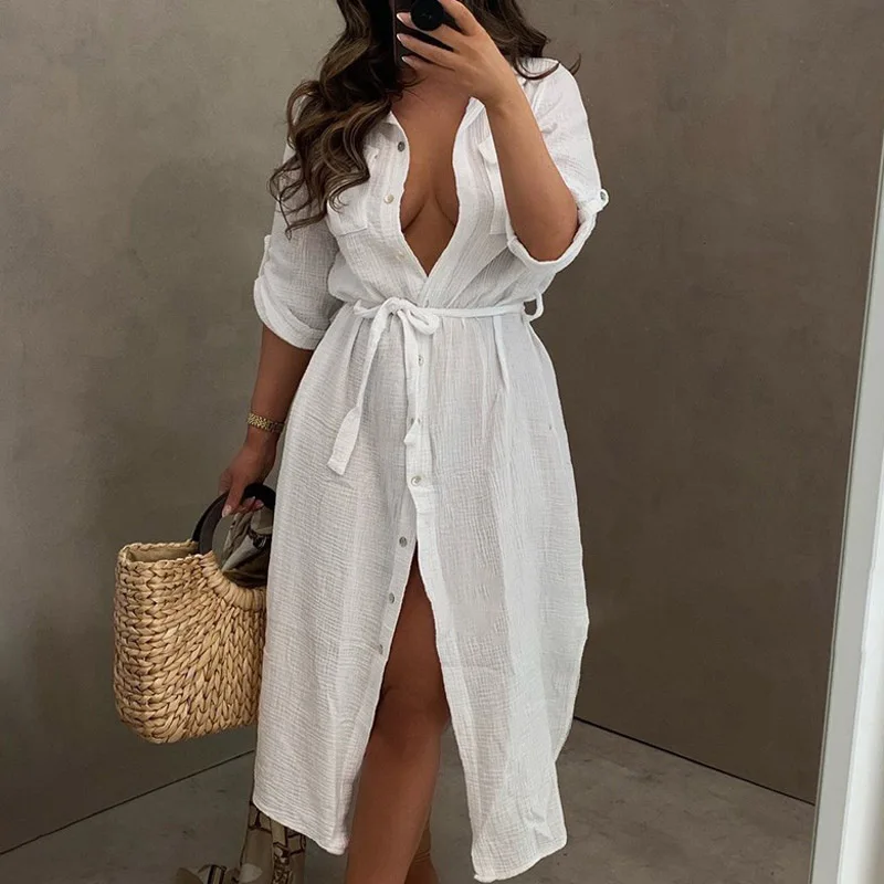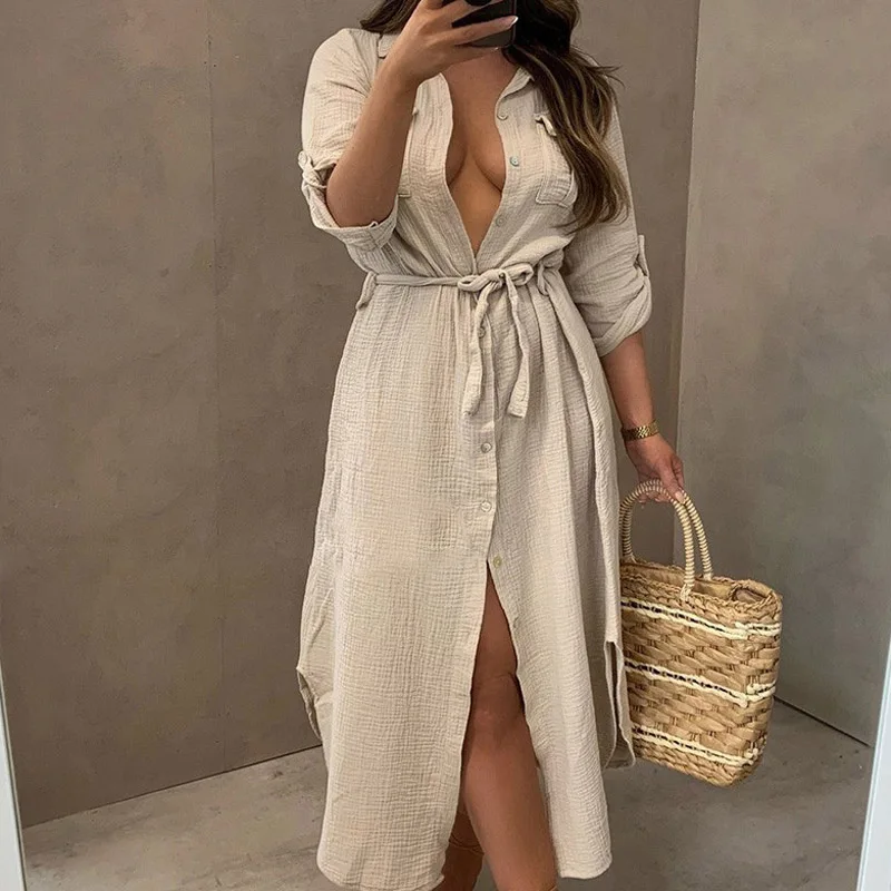 Letter Print Button Women Shirt Dress 2021 Autumm Long Sleeve Beach Long Dress Lady Elegant Belted Tie-Up Party Dresses Vestidos