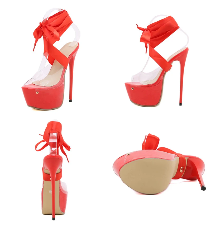 Liyke Sexy Red Thigh High Lace-Up Platform Sandals Women 16.5 CM Transparent Shoes Stiletto Peep Toe Nightclub Stripper Heels