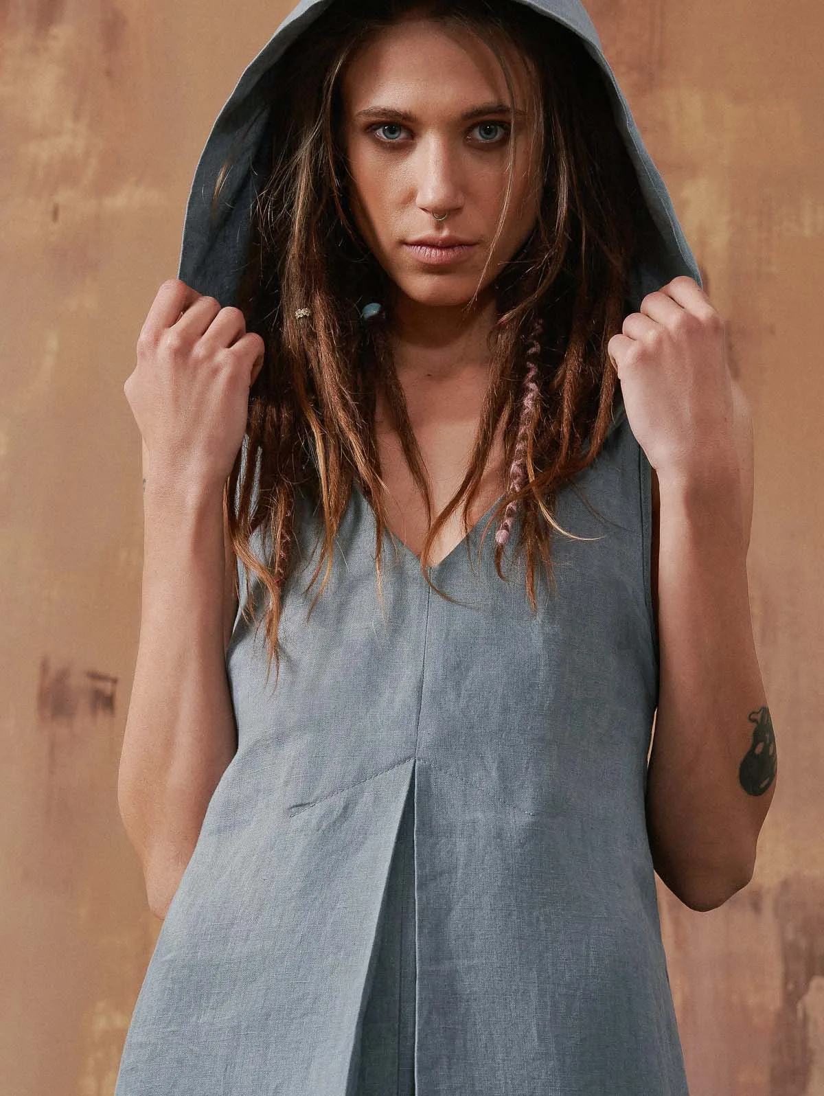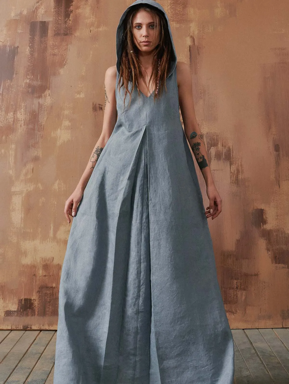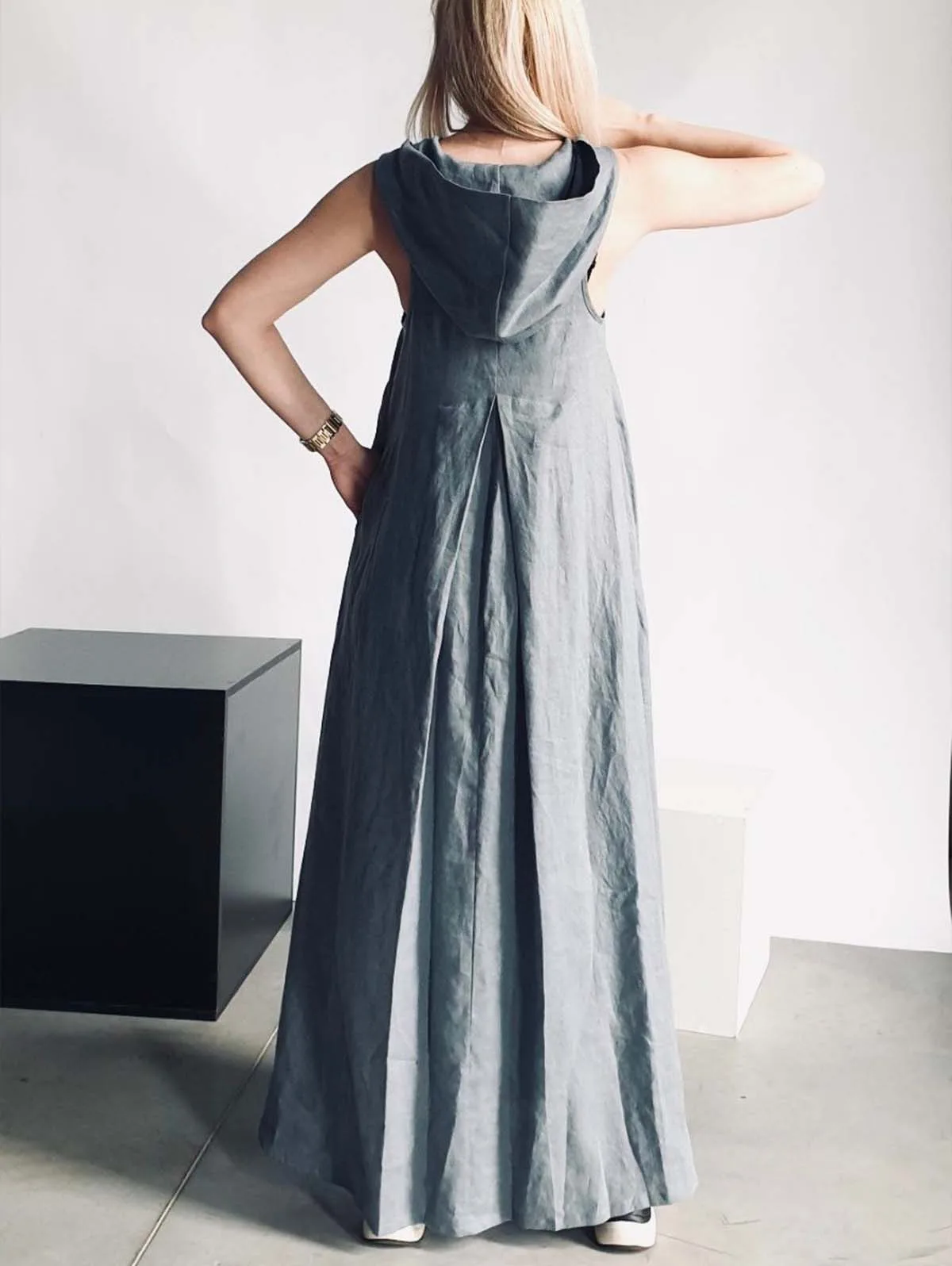 Long Dresses for Women Casual Loose Summer Sleeveless Dresses Vintage Linen Front Pleat Maxi Dress with Hooded Pleated Vestidos