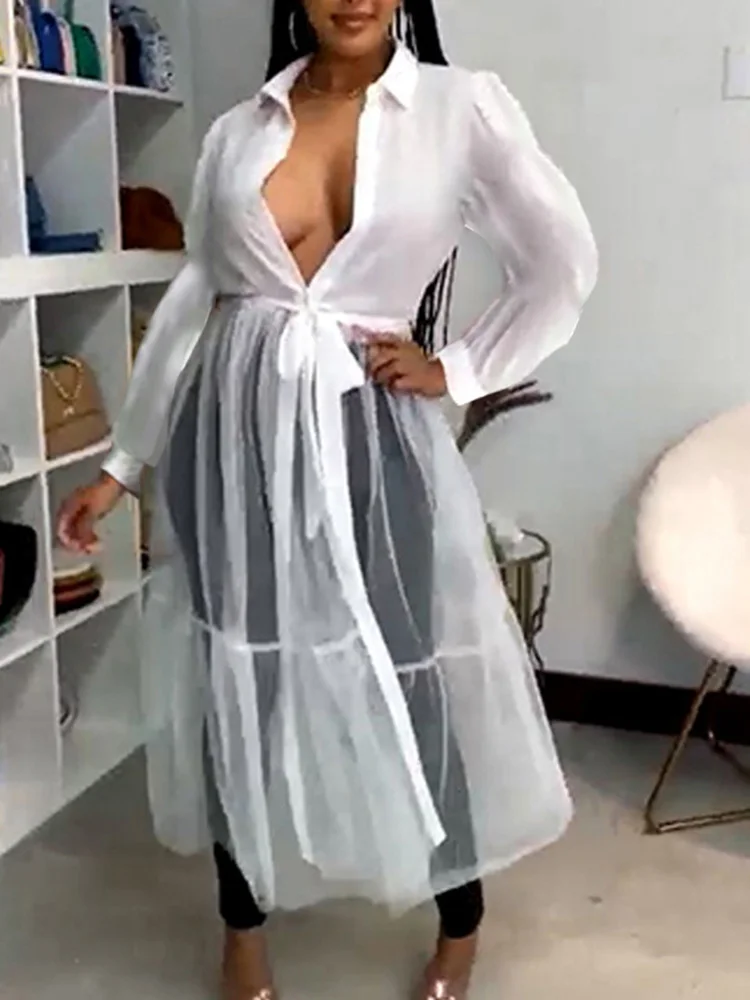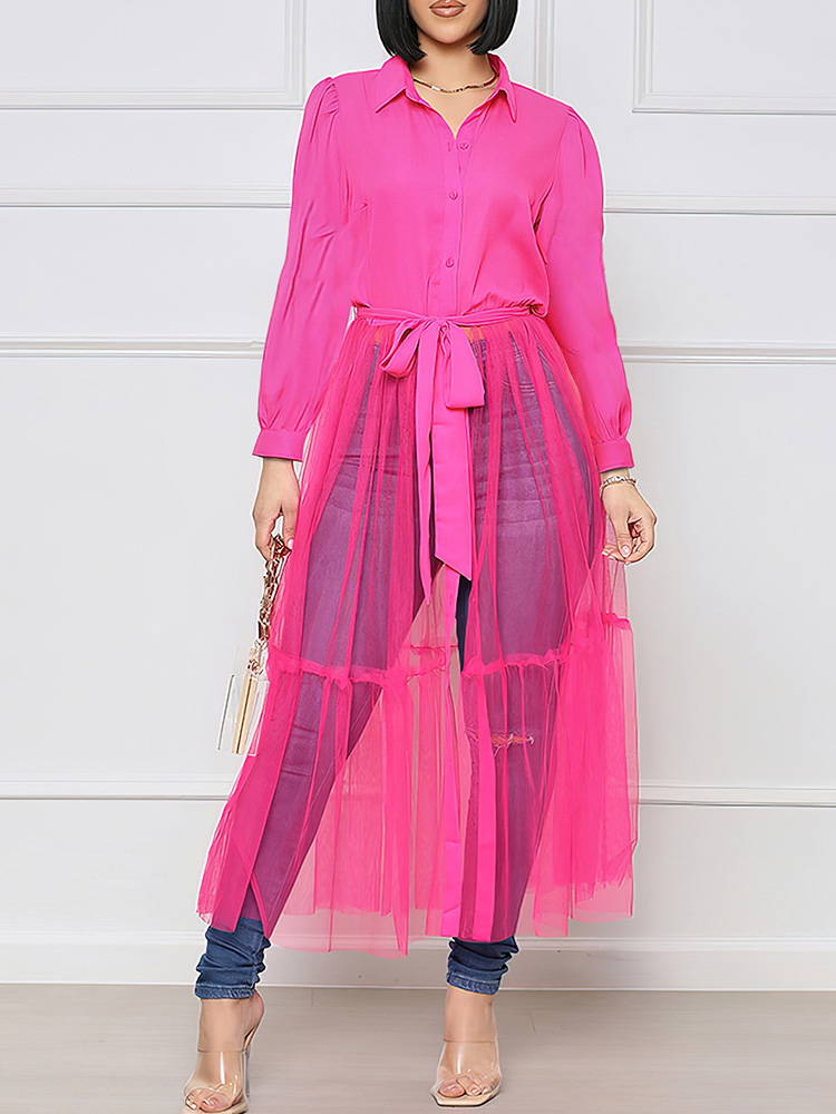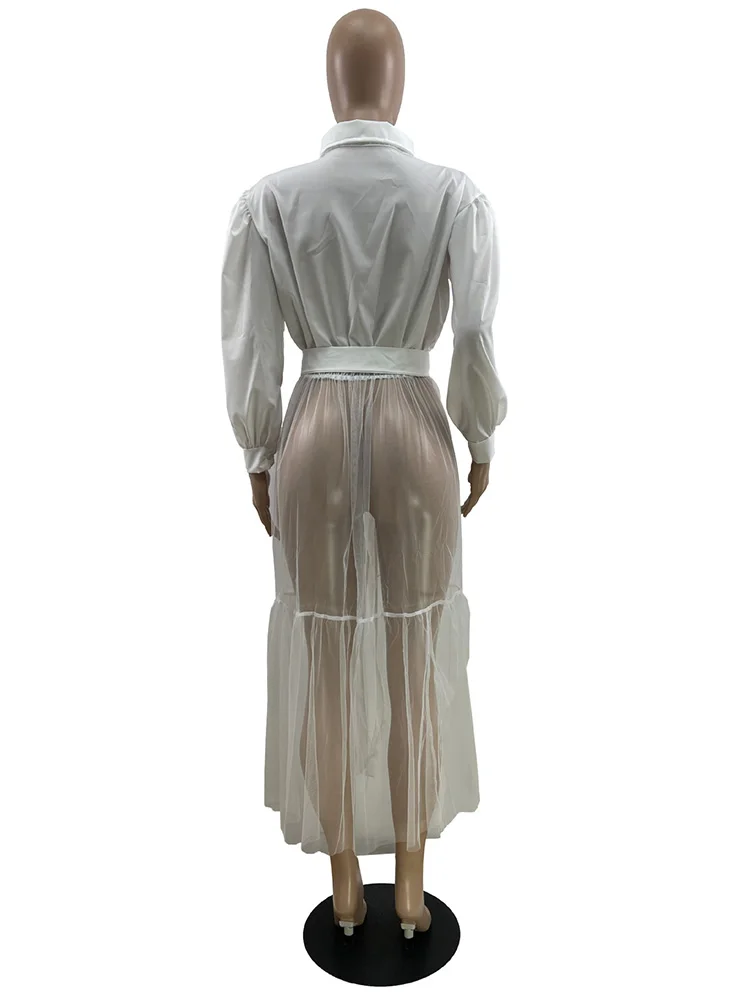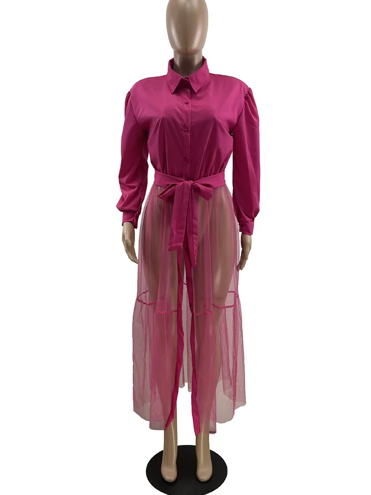 Long Sleeve Button Front Sheer Mesh Shirt Dress with Belt