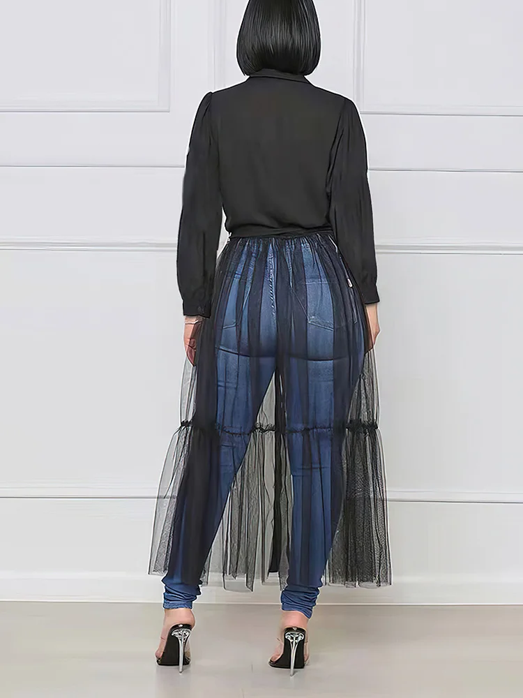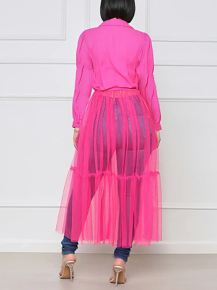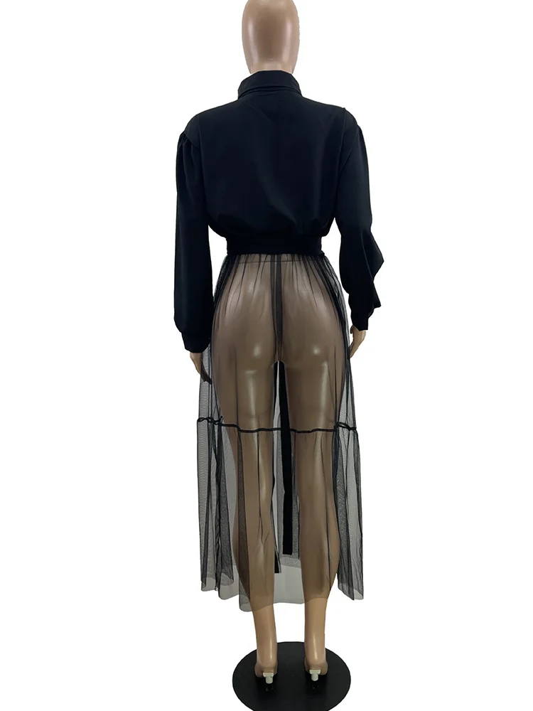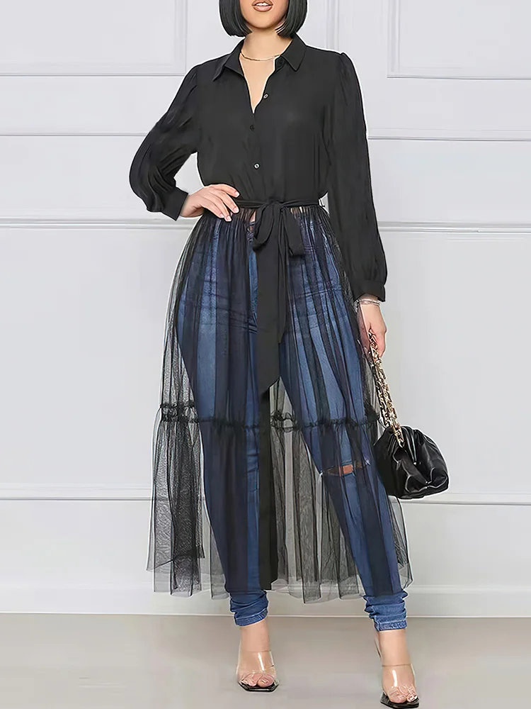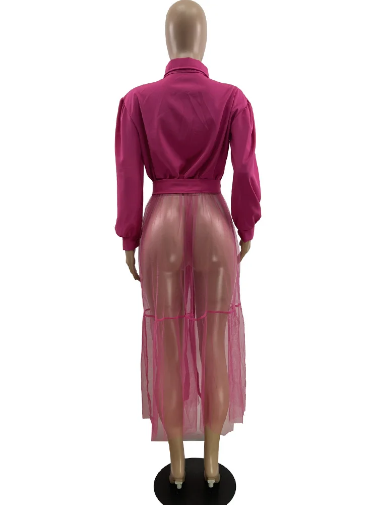 Long Sleeve Button Front Sheer Mesh Shirt Dress with Belt