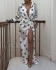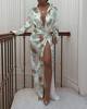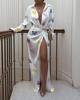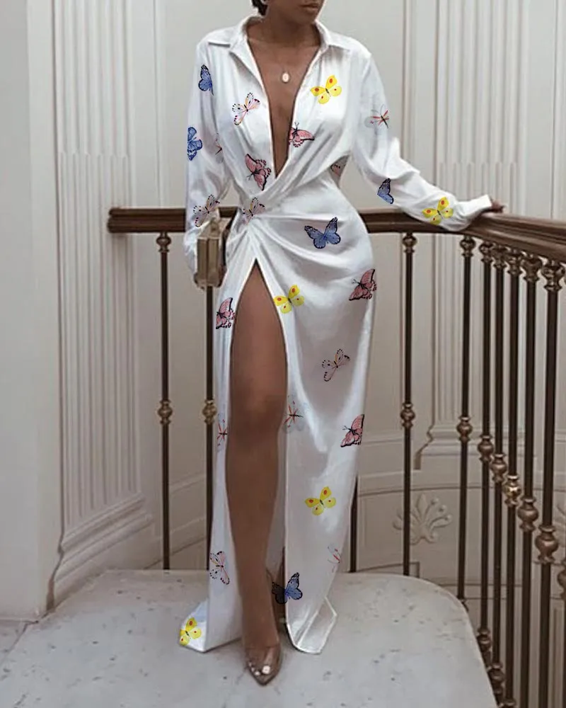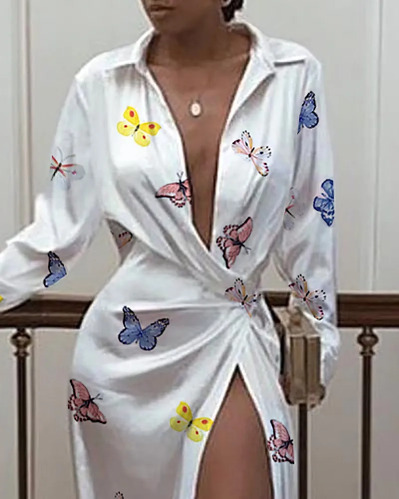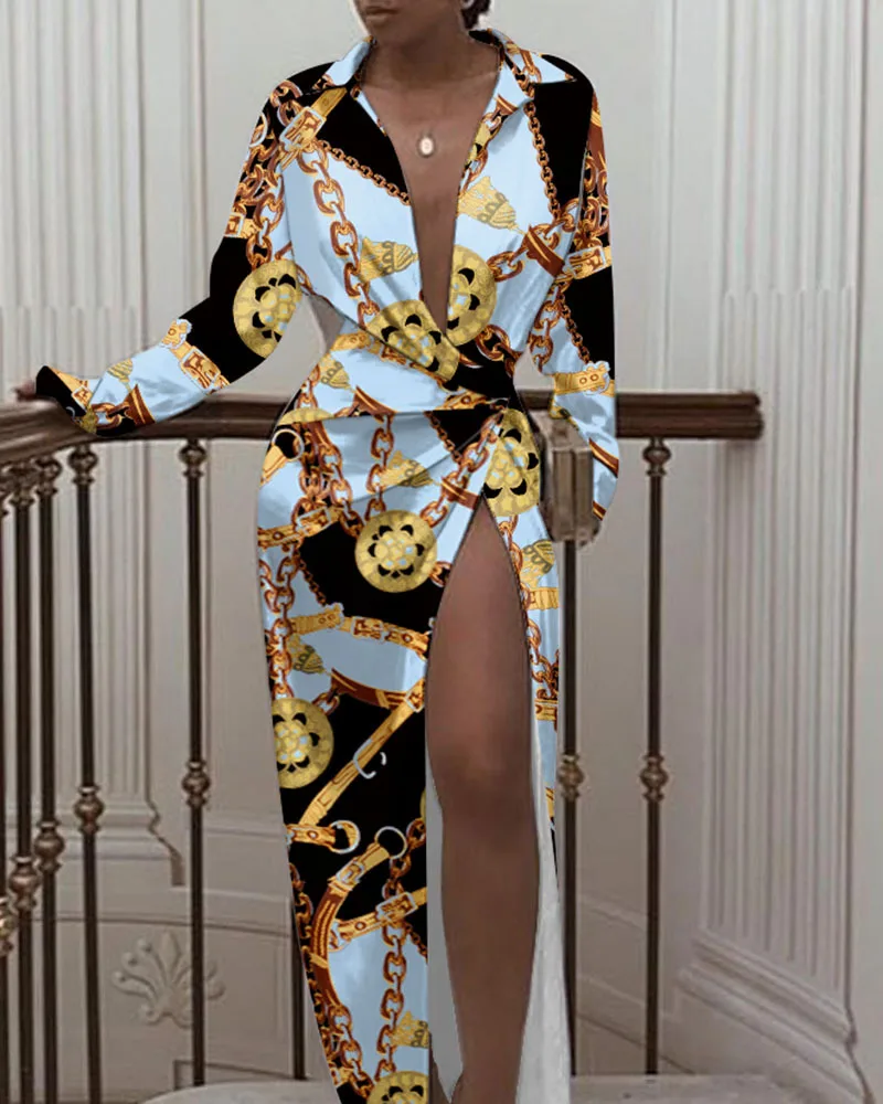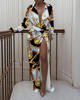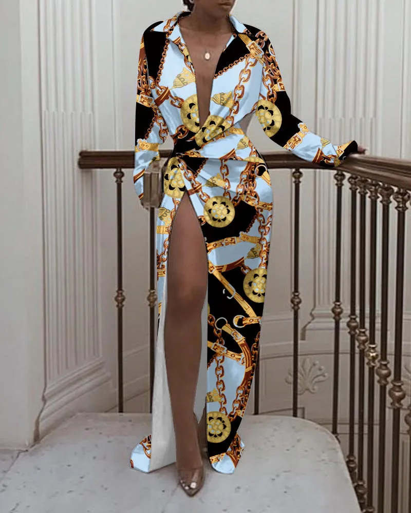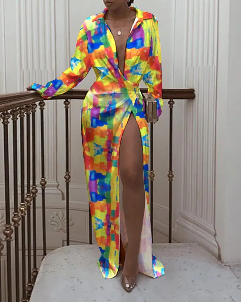 Long-sleeved Dress Women 2021 Fashion Sexy Ladies V Neck Cardigan Turn-down High-open Fork Shirt Dress Vintage Print Party Dress