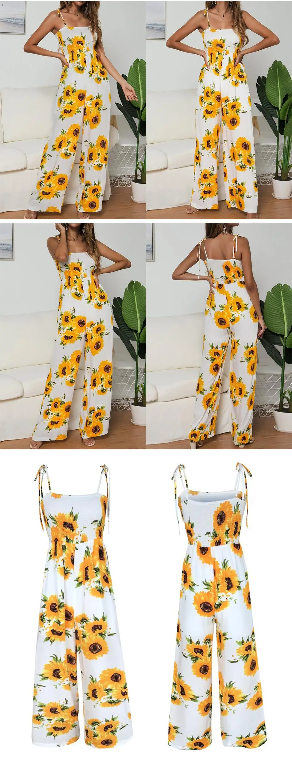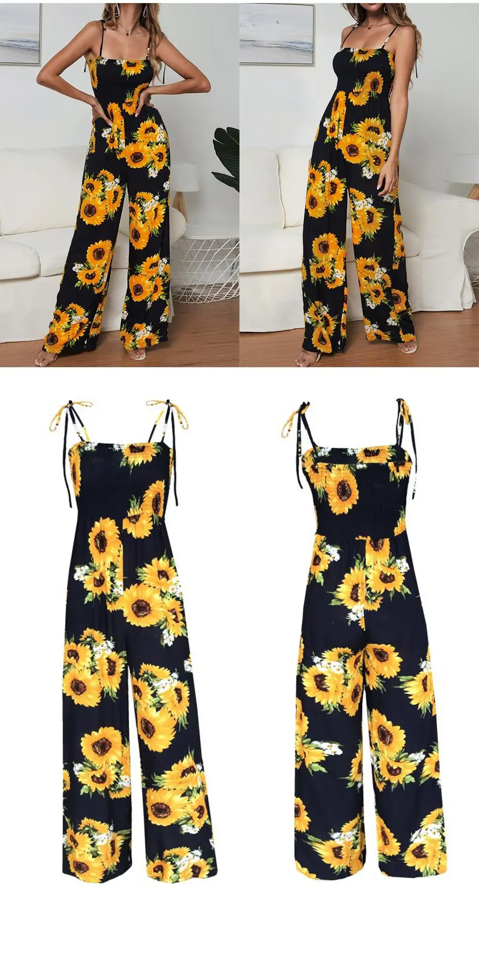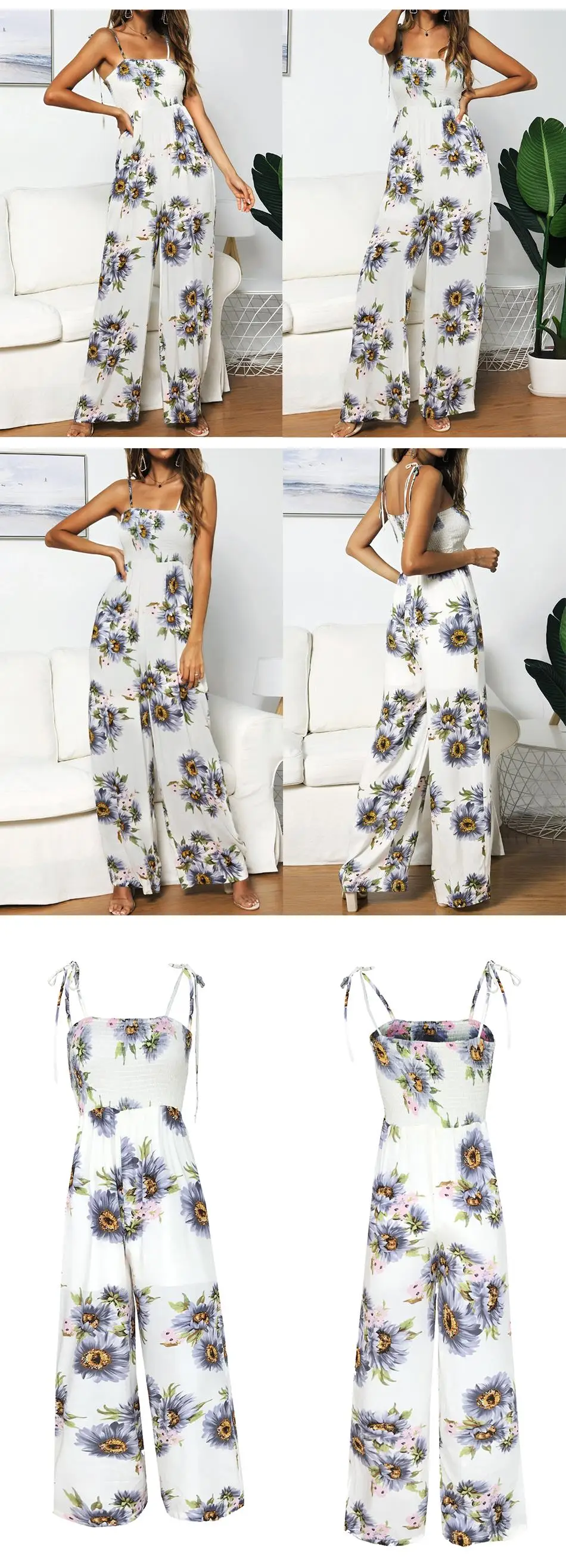 Lossky Rompers Womens Jumpsuit Boho Chi Floral Printed Pleated Wrap Bow Straps Long Jumpsuits High Waist Wide-leg Pants Jumpsuit