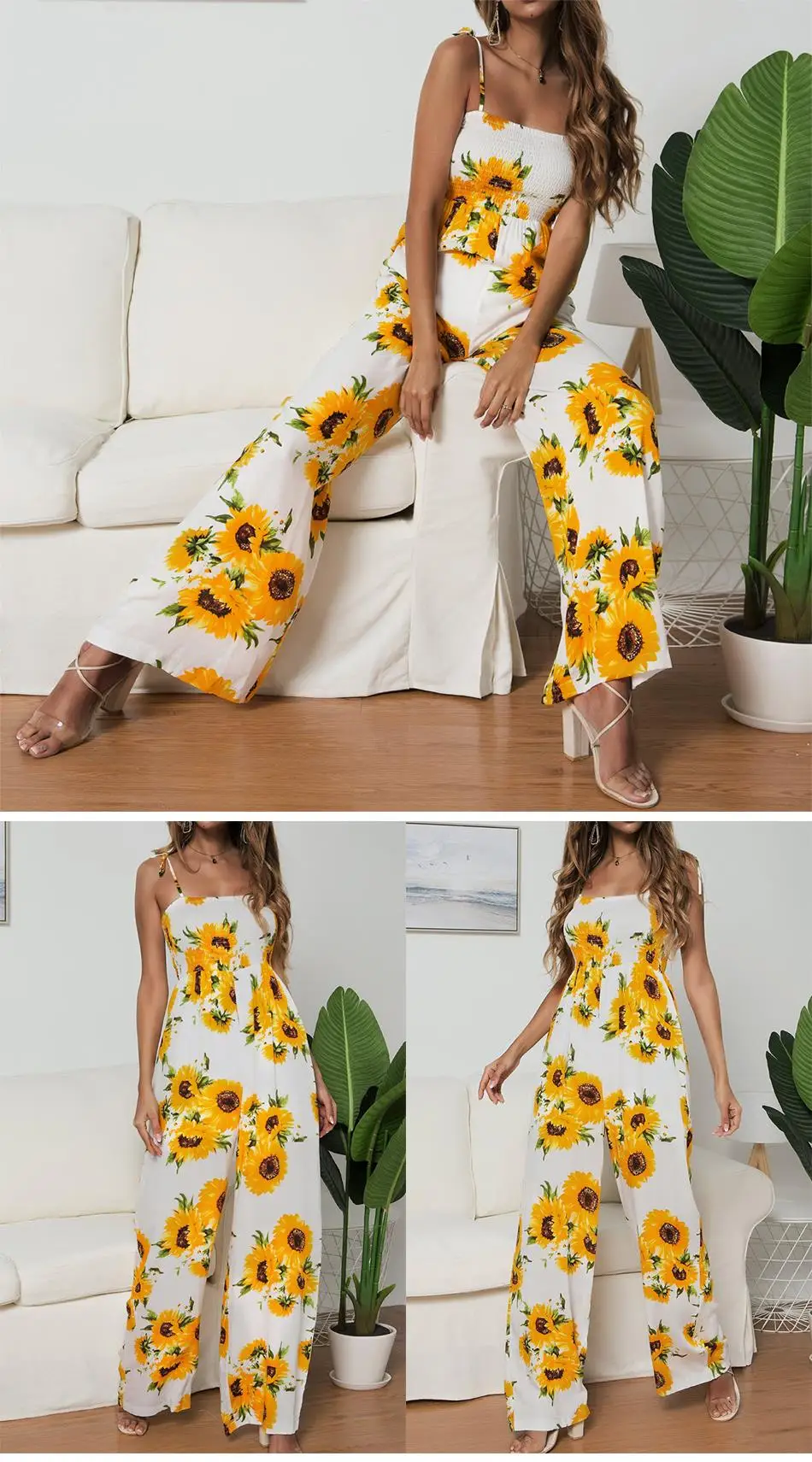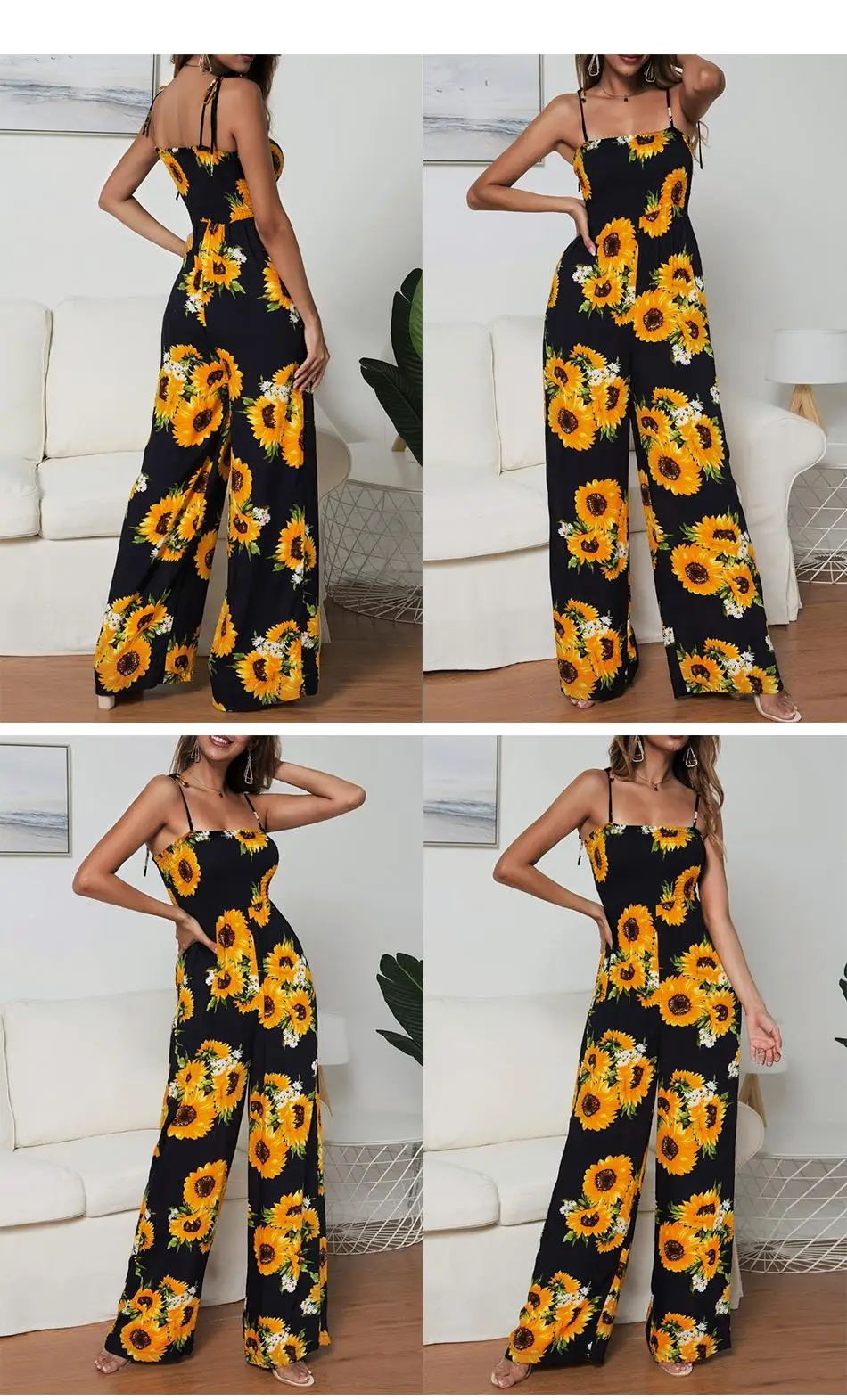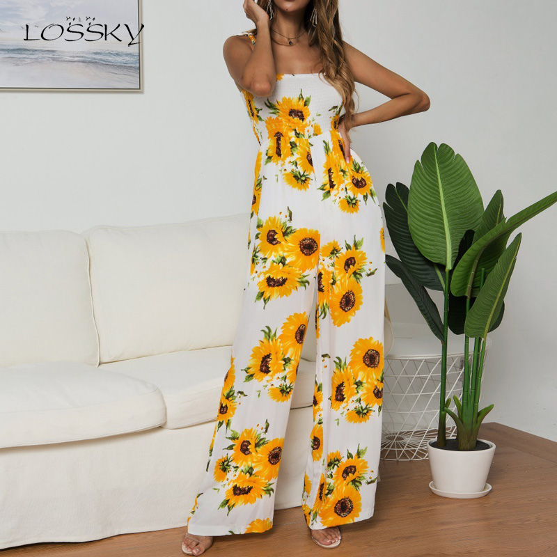 Lossky Rompers Womens Jumpsuit Boho Chi Floral Printed Pleated Wrap Bow Straps Long Jumpsuits High Waist Wide-leg Pants Jumpsuit