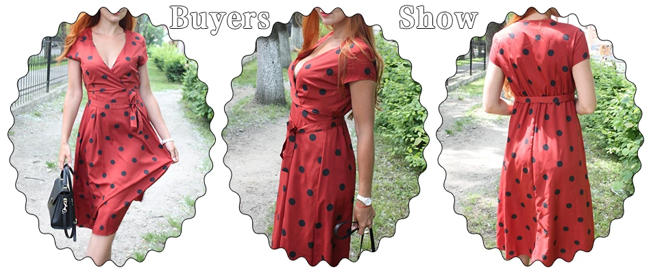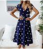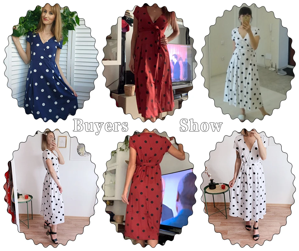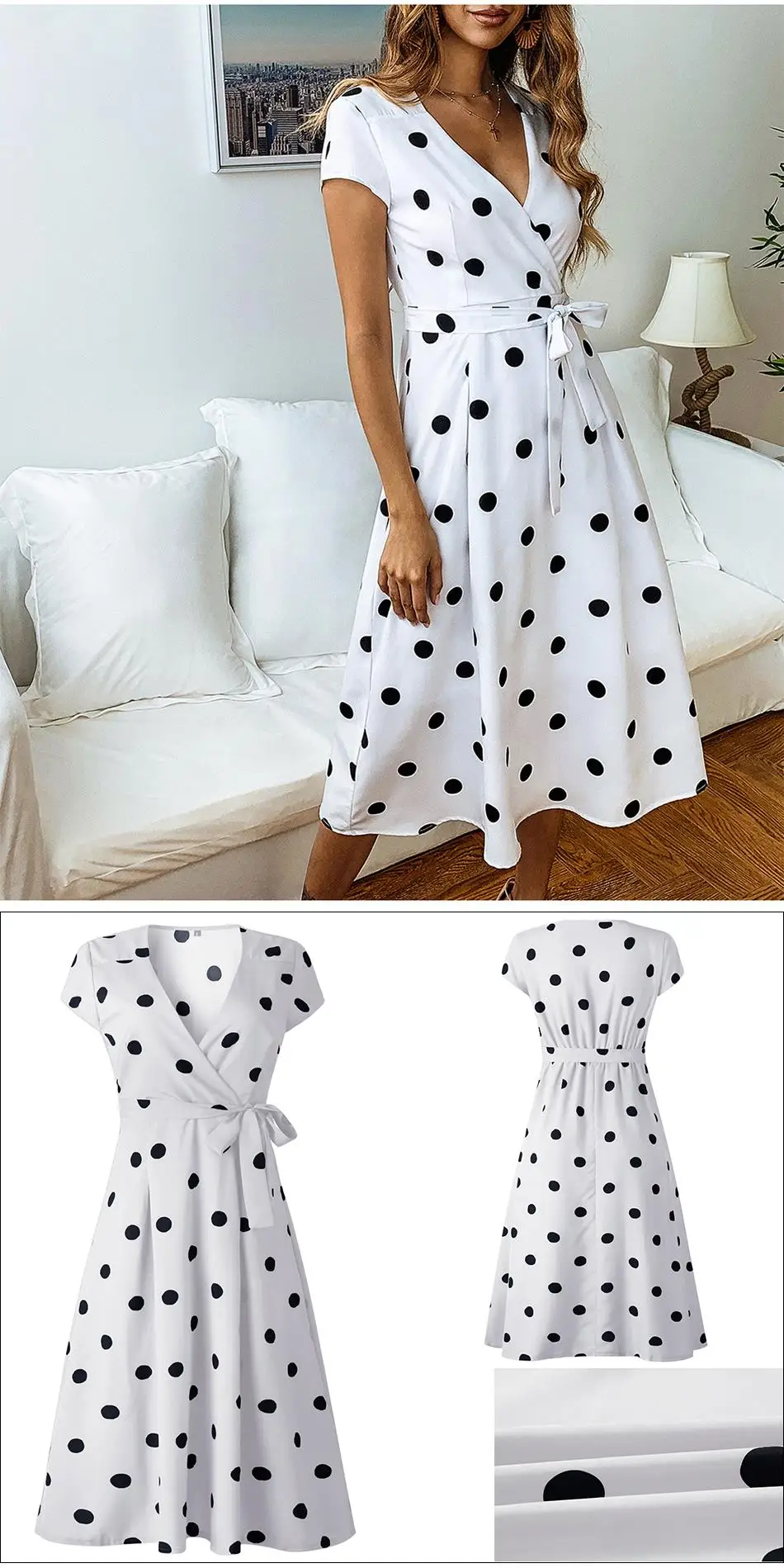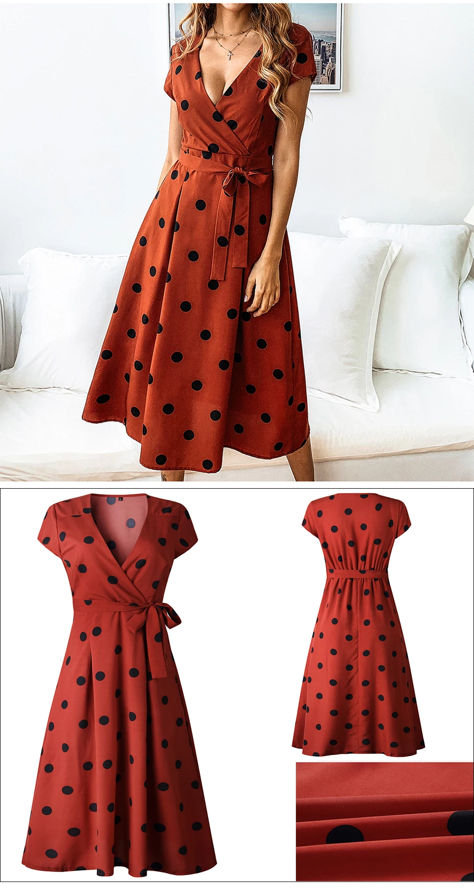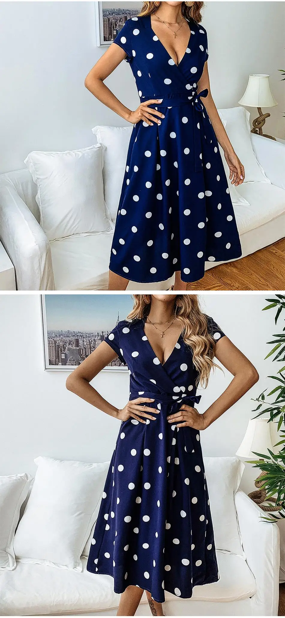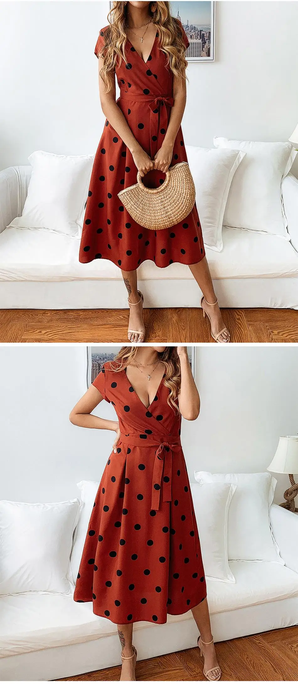 Lossky Summer Dress Women Vintage Dress Casual Polka Dot Print A-Line Party Dresses Sexy V-neck Short Sleeve Long Dress Fashion