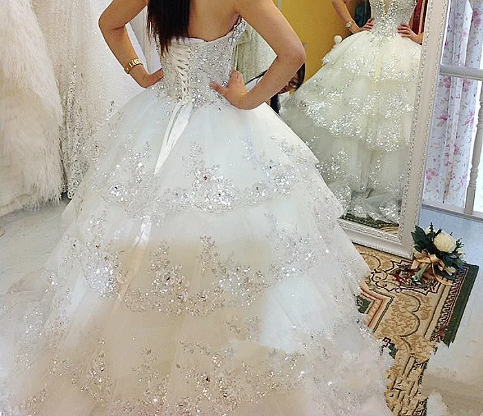 Luxurious Wedding Dresses Ball Gown Sweetheart Fluffy Lace Beaded Crystal Diamond Big Train Bridal Gowns 100% Real Photo QB11S