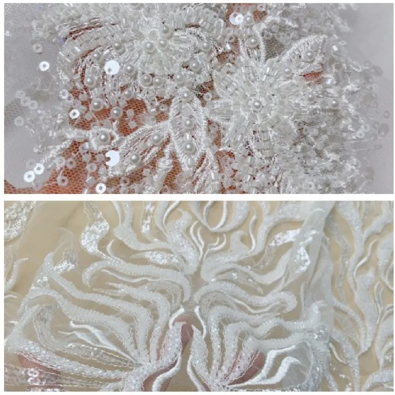 Appliques lace are an important part of the wedding dress decoration process, and one of the beautiful processes that requires the combination of sensibility and rationality. Craftsmen are required to have high aesthetic ability and creativity, and have a certain artistic foundation. The application of embroidery on wedding dress requires exquisite embroidery skills and meticulous design. Many of our wedding dresses are adorned with intricate hand embroidery that brings the patterns to life on the dress.