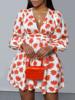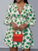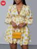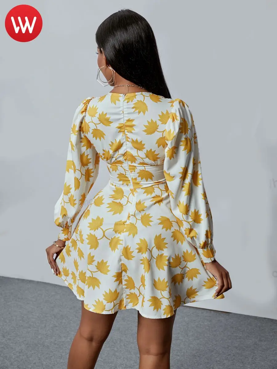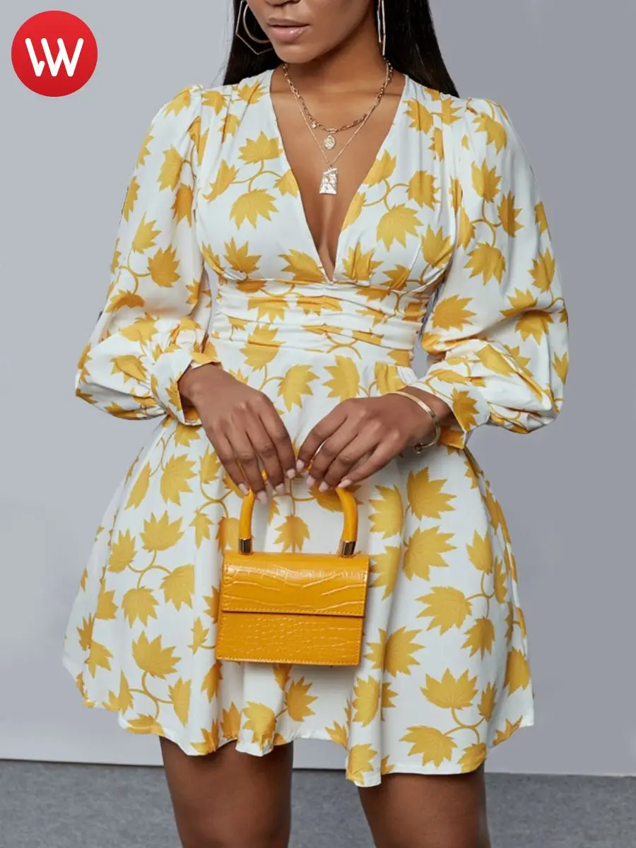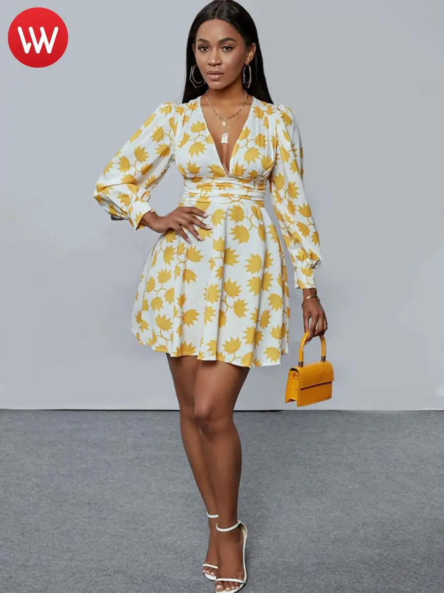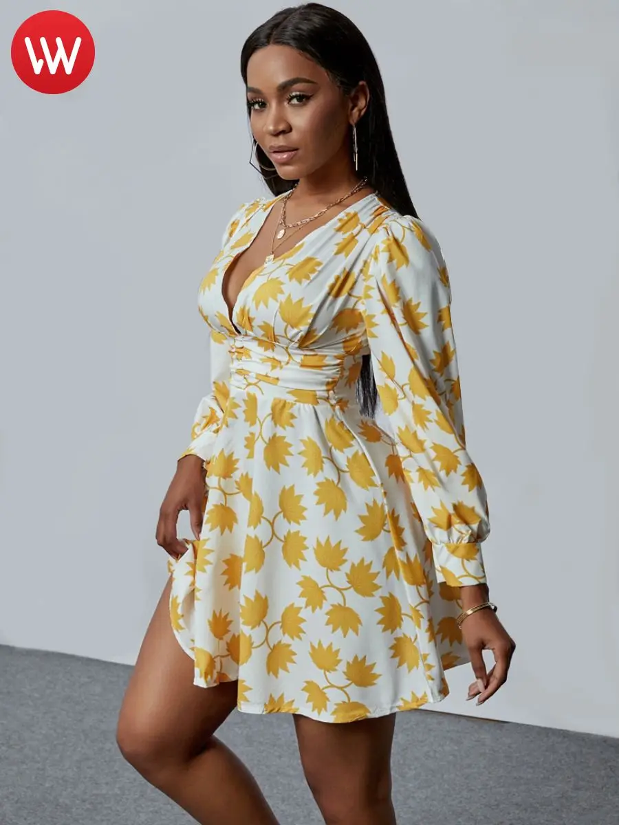 LW Sweet 2022 Fashion Dress Deep V Neck Floral Print Mini S-5XL A Line Cleavage Women Clothings Summer Long Sleeve Lady Outfits