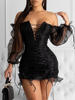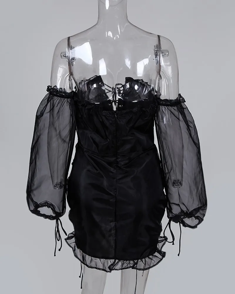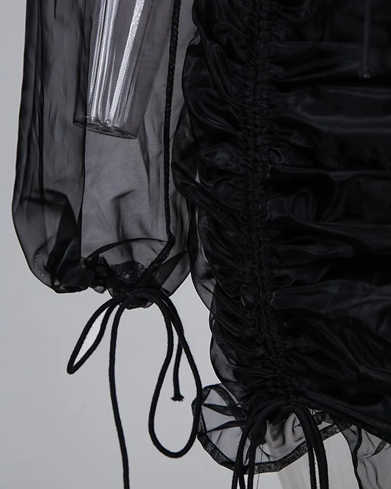 Mesh Lace-Up Drawstring Design Ruched Dress Women Bandage Bodycon Mini Party Dress