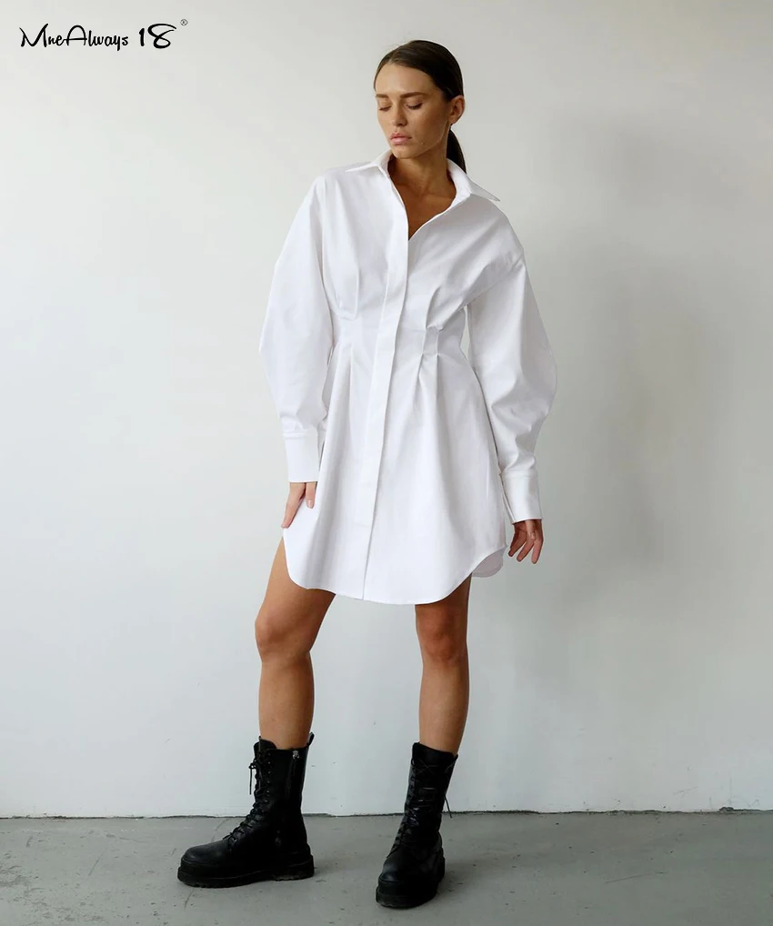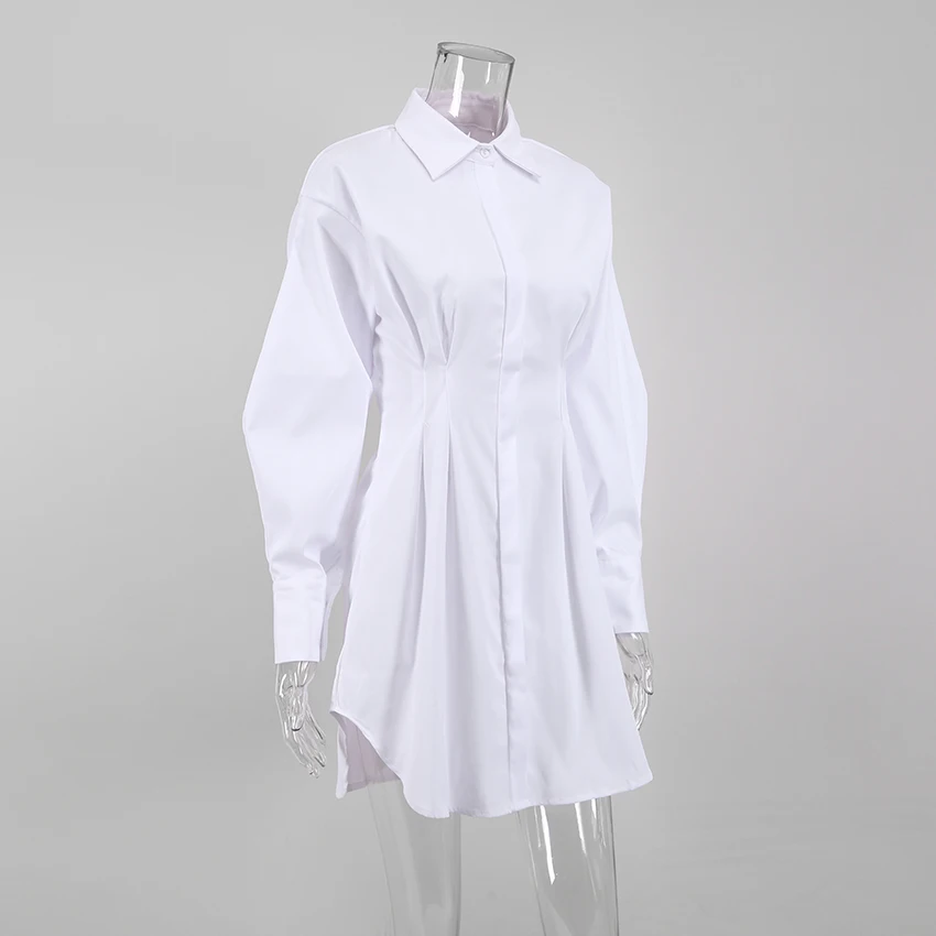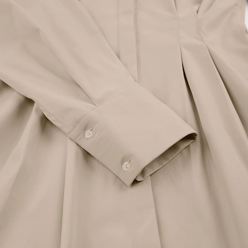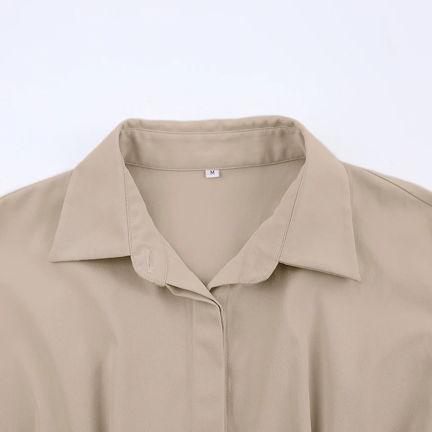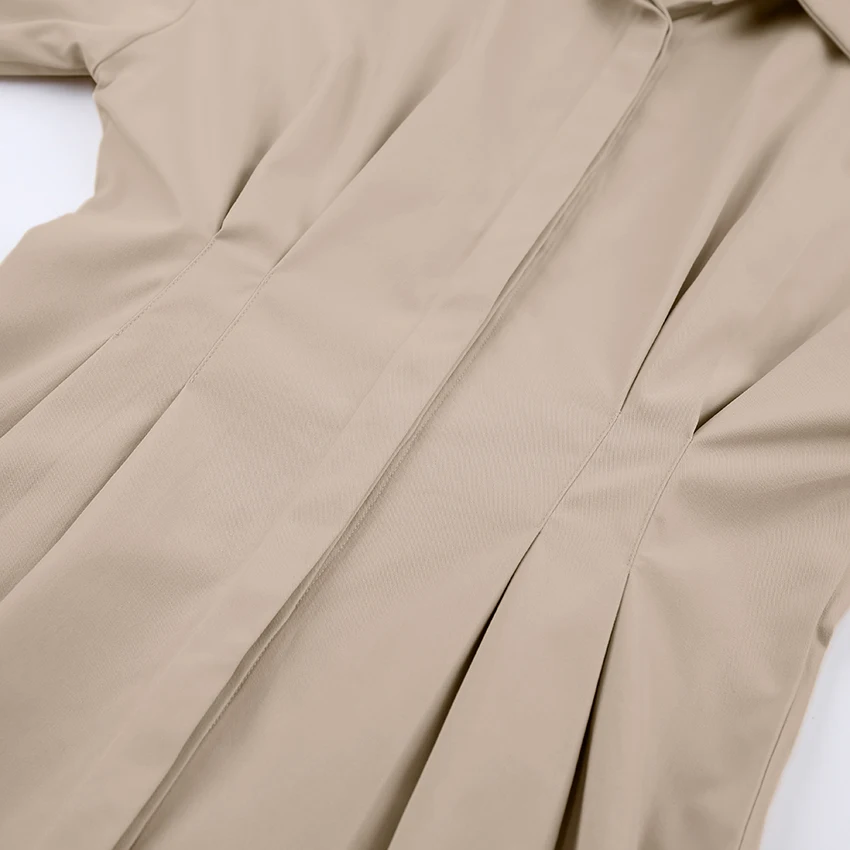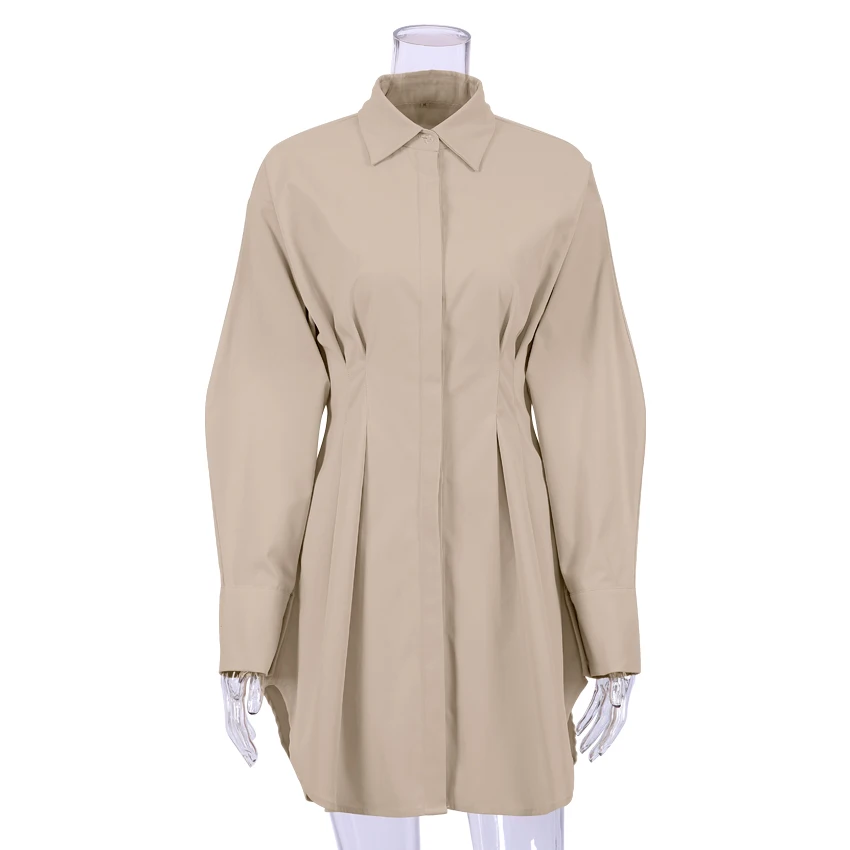 Mnealways18 Autumn Winter Bodycon Dress Women Khaki Long Sleeve Pleated Shirt Dress Office Ladies Solid Lapel Casual Mini Dresss