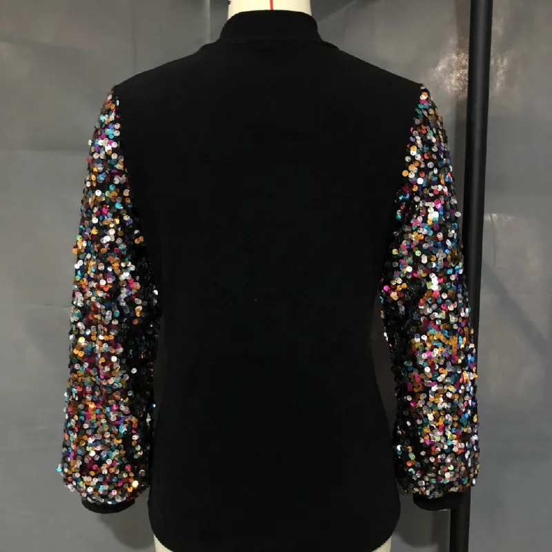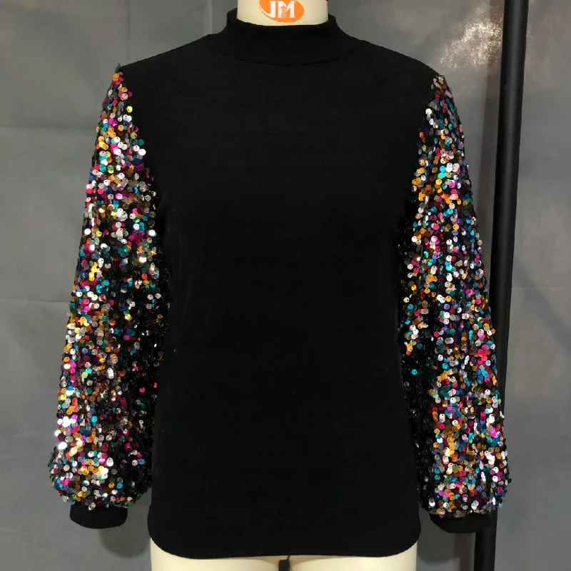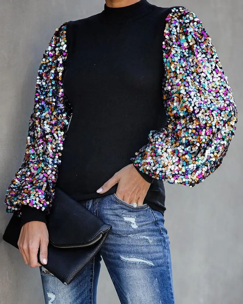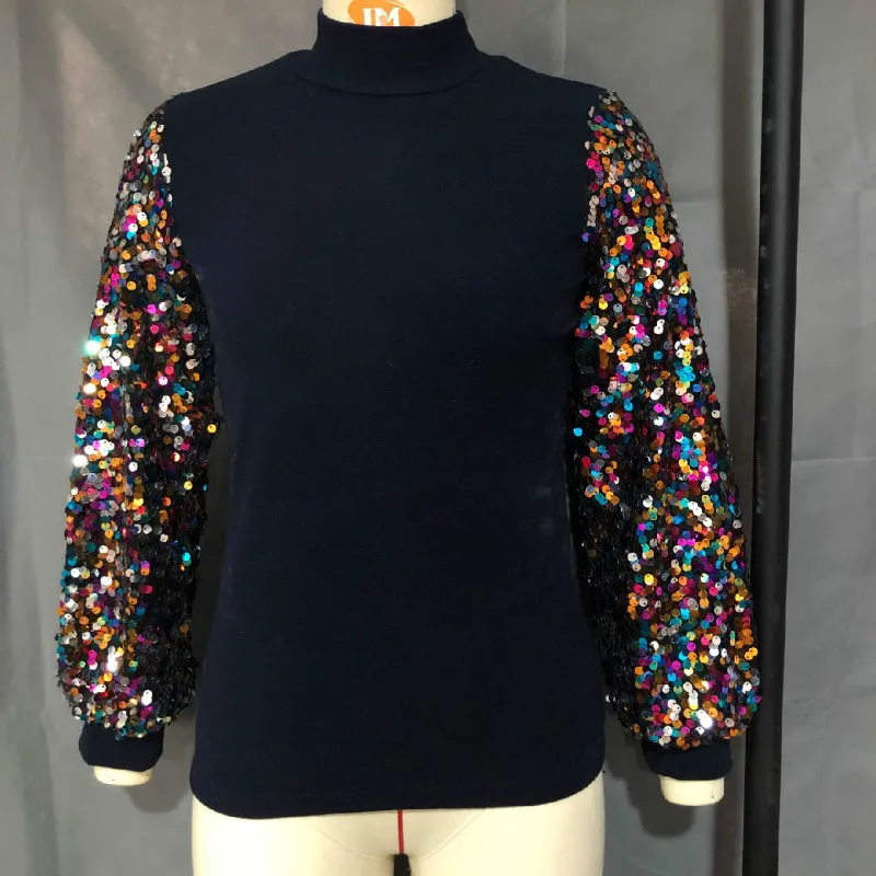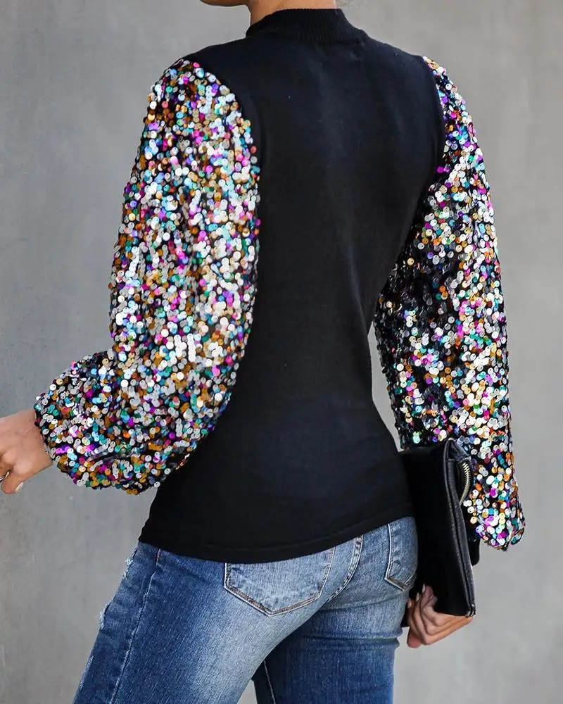 Mock Neck Lantern Sleeve Sequins Colorblock Insert Blouse Women Long Sleeve Casual Blouse Tops